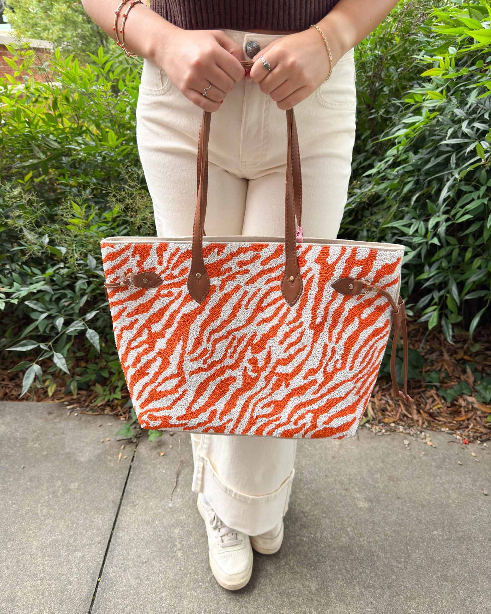 Party in the front, and business in the back! This stylish beaded tiger stripe bag is a must have for any Tiger fan. Whether you are an avid tailgate lover or are looking to bring a touch of Clemson spirit into every day, we are loving this bag. It is spacious for all your necessities, but still sits beautifully on the shoulder.