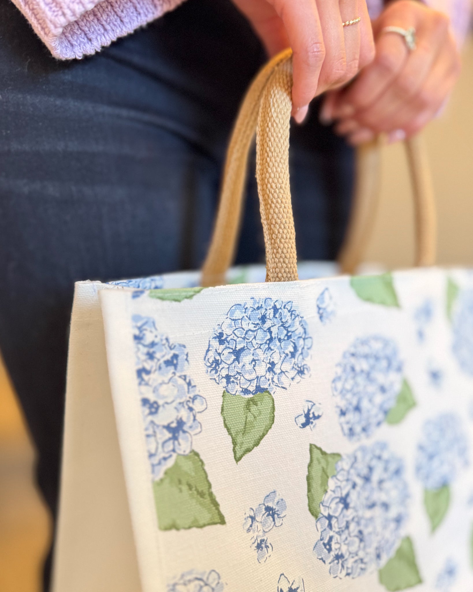 Fresh, classic, and effortlessly charming. This blue hydrangea gift tote features a crisp white background with vibrant floral detailing and sturdy natural handles - Lightweight yet durable.