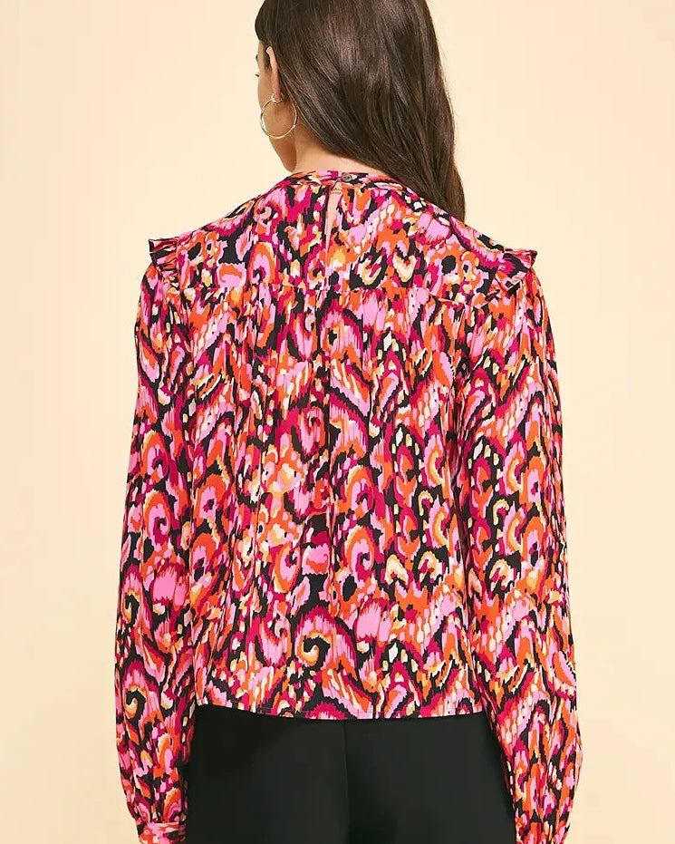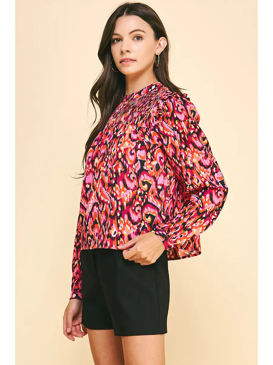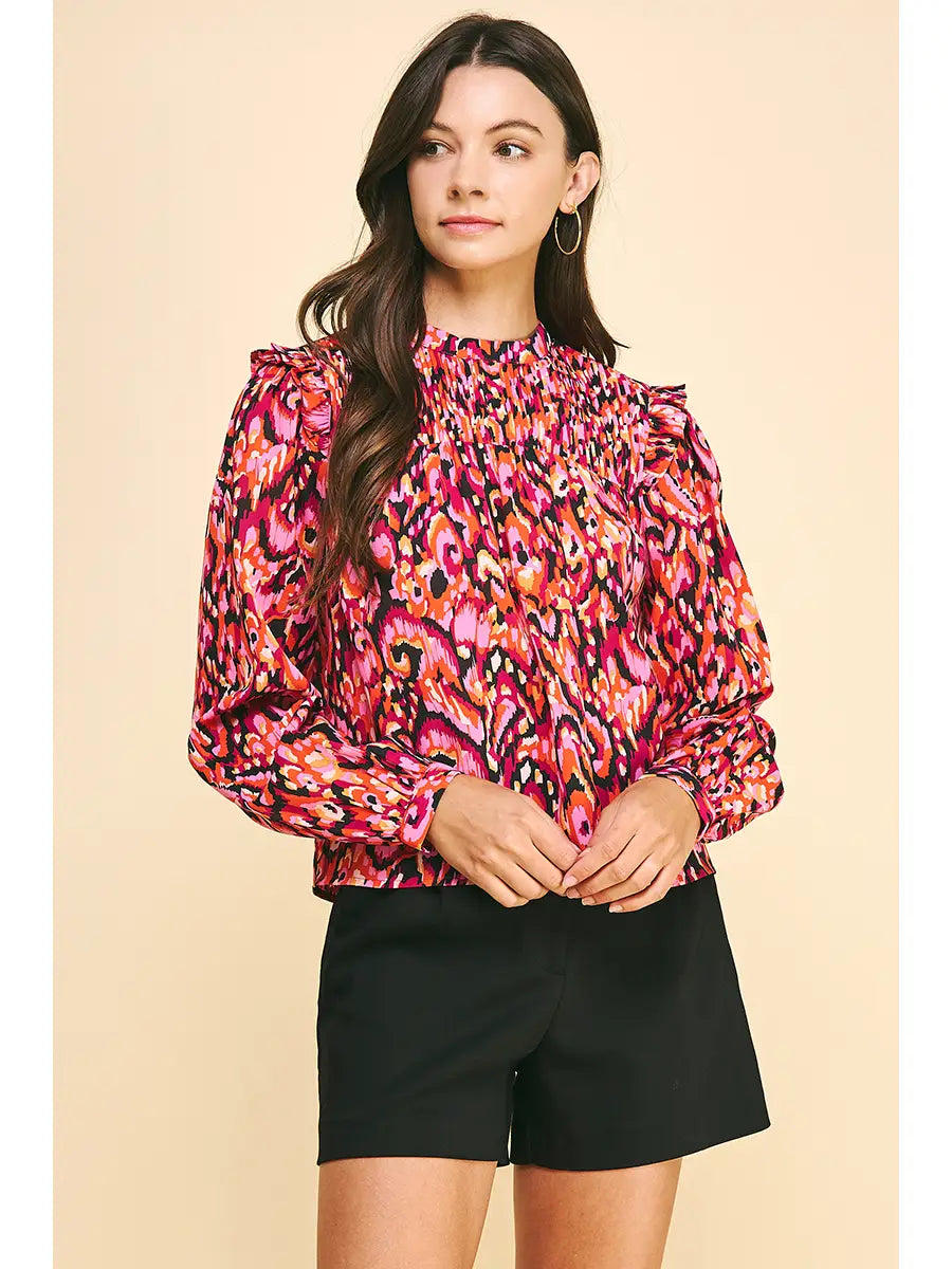 Turn heads in this vibrant top! Effortlessly chic and designed to elevate any look, this piece features a vibrant pink abstract print. The high smocked neckline and long sleeves provide a flattering, feminine silhouette. The drape of this blouse allows for it to be dressed-up for occasions or worn as an everyday piece. Pair it with tailored shorts, denim, or trousers for an easy transition from day to night.