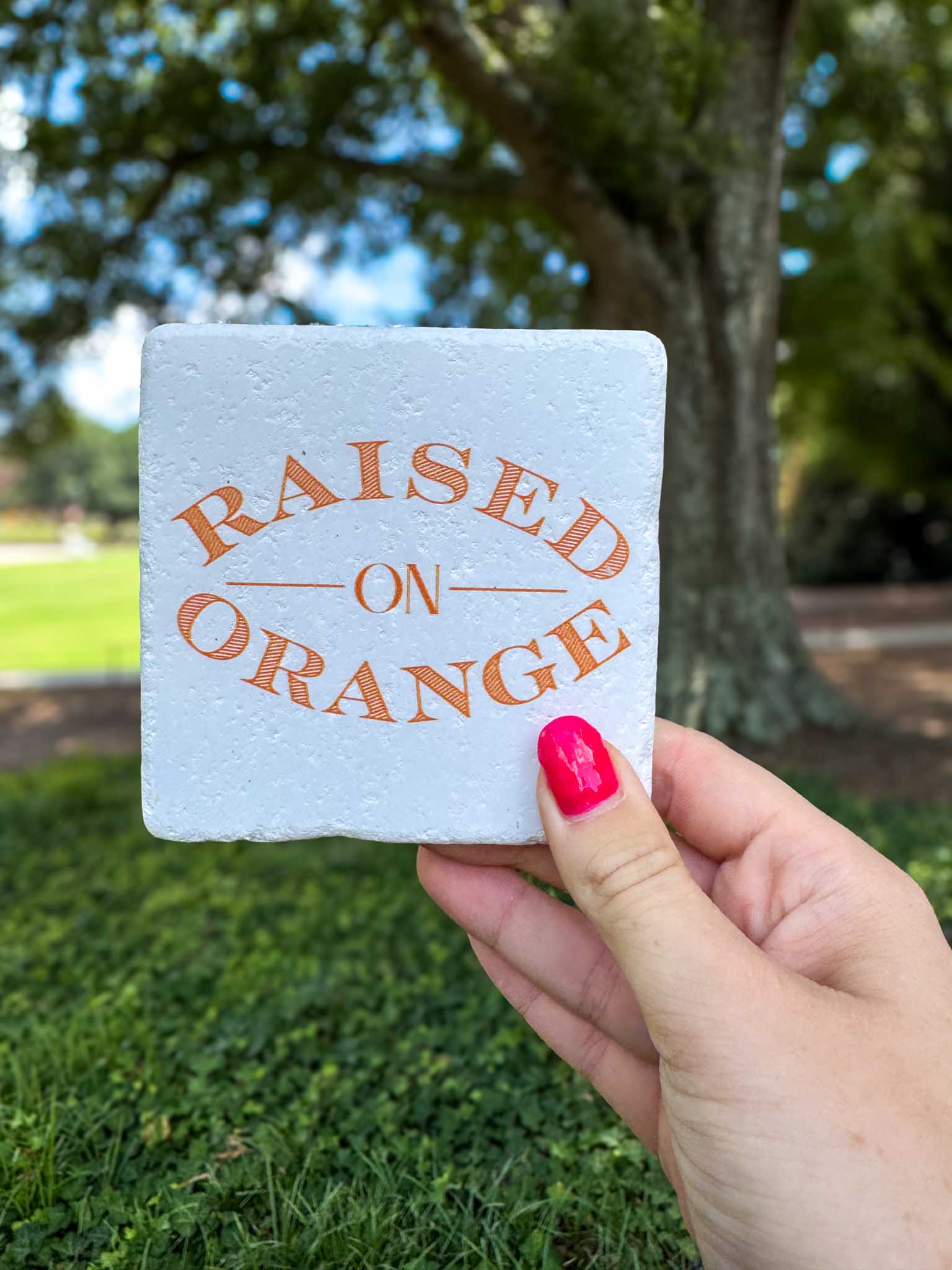 Say hello to your new go-to coffee table essential: the Raised on Orange stone coaster! This bold, bright white coaster is designed in-house by True Orange, this exclusive logo is a one-of-a-kind creation you won’t find anywhere else. Whether you're looking to commemorate your time at Clemson or celebrating a new Tiger this coaster lets everyone know where your roots run deep—right here in Tiger Town.