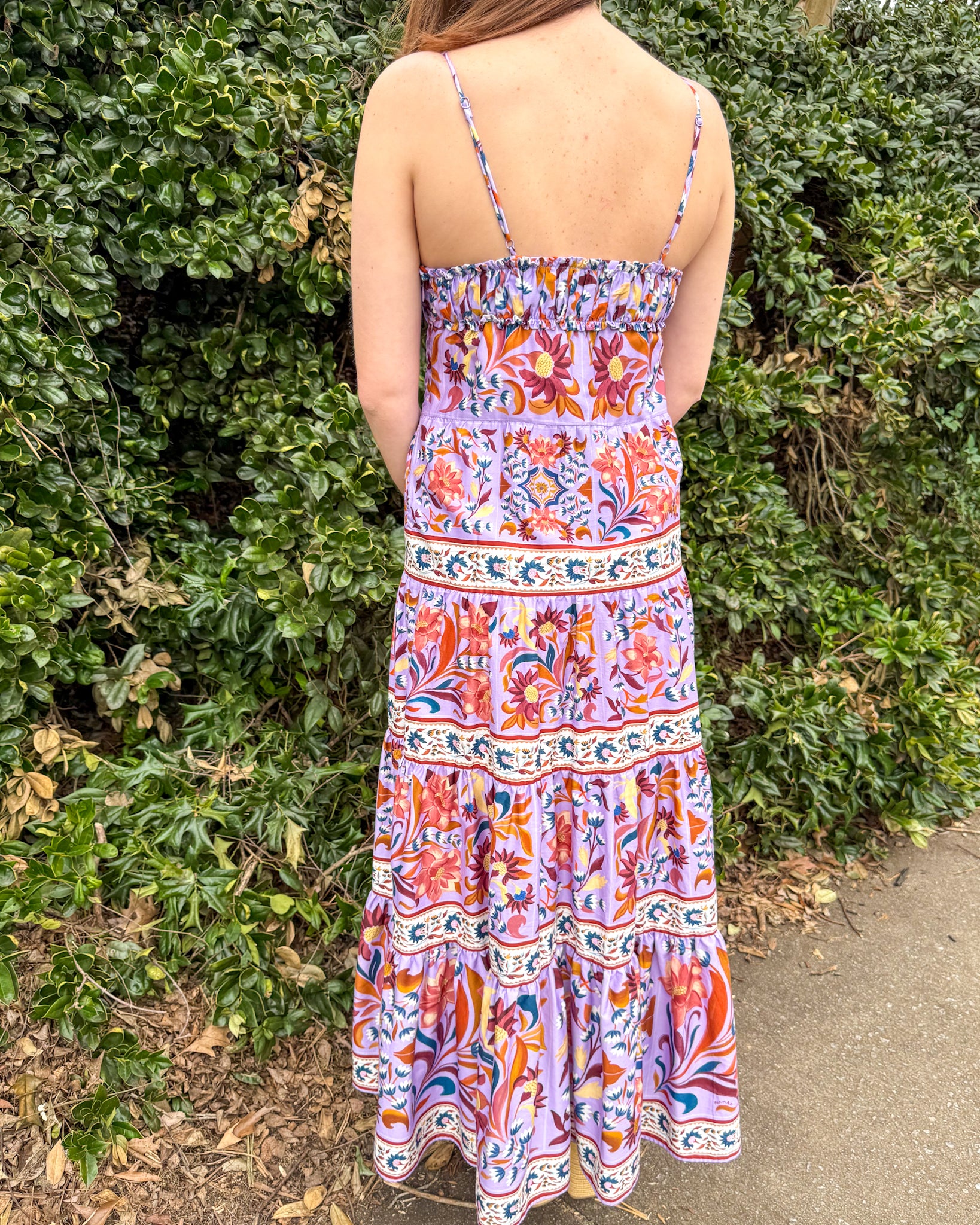 Farm Rio Flower Tiles Lilac Sleeveless Tiered Maxi Dress