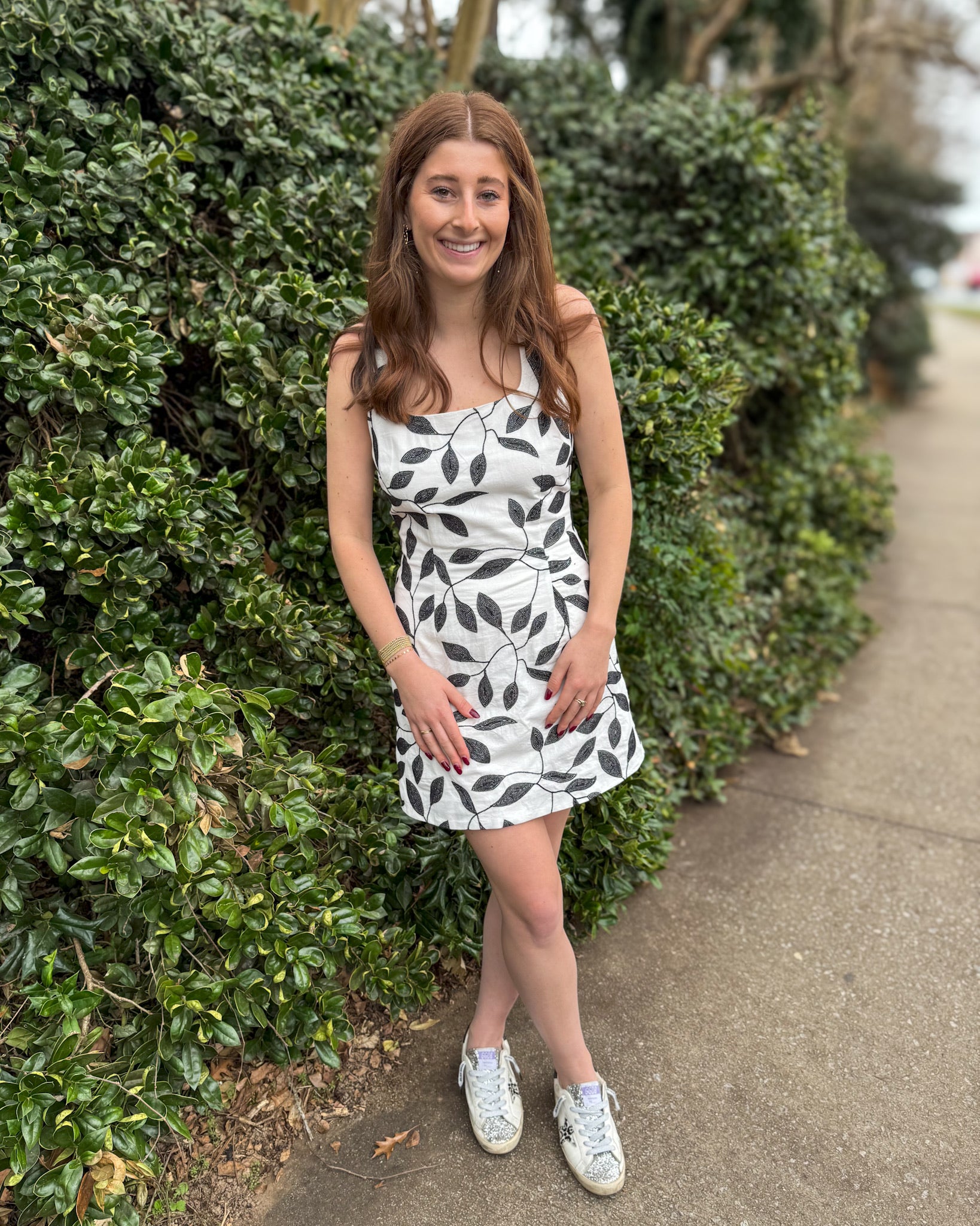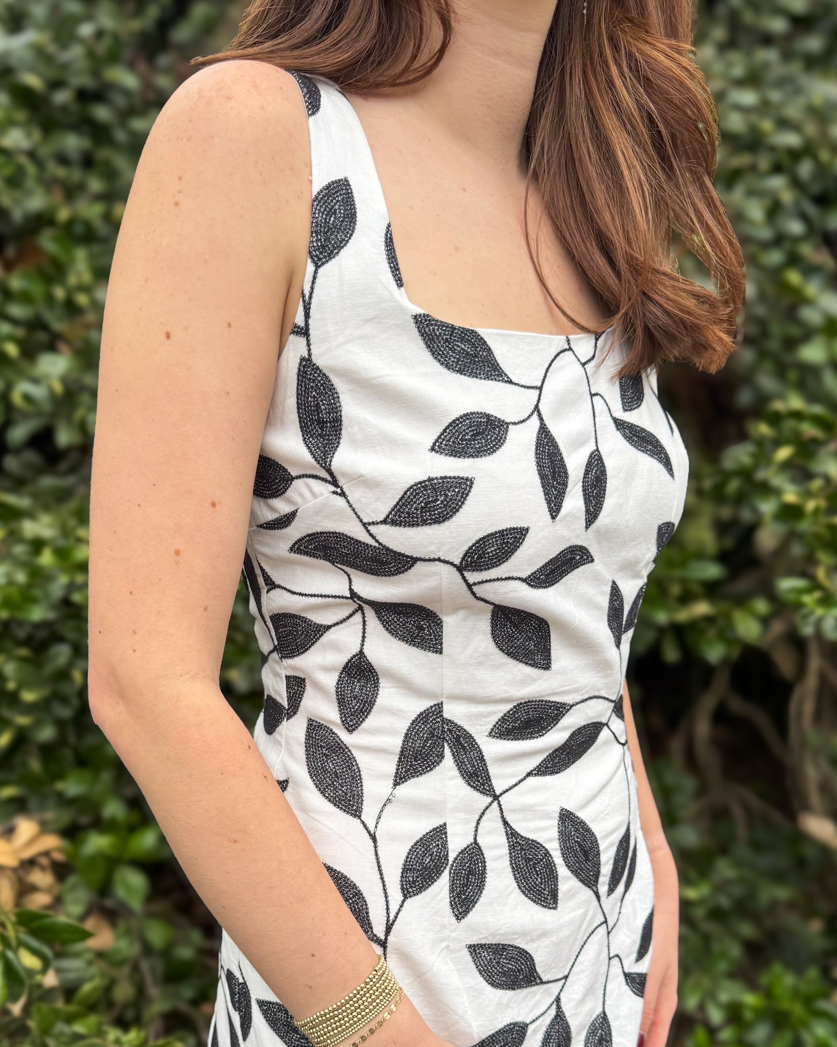 This classic a-line embroidery dress mixes classic vibes with a modern twist. The contrast creates a fun feel with a sleek silhouette. Whether you create a daytime style with sneakers, or create an elevated nighttime look with heels - We are loving this piece.