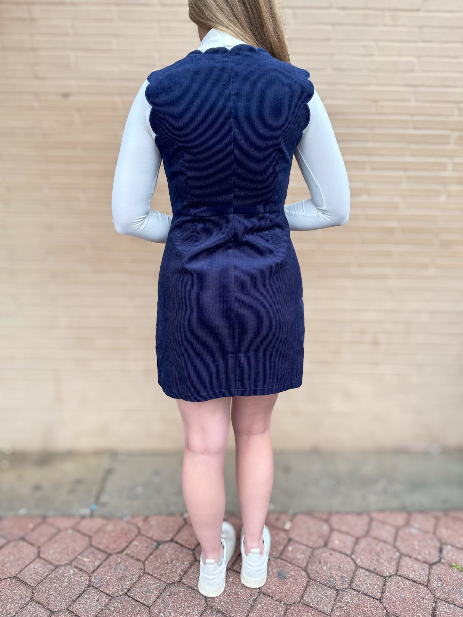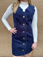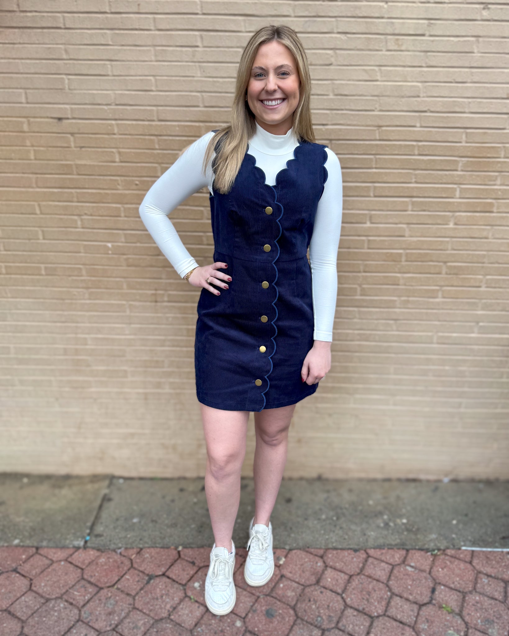 This transitional dress is a must-have! For colder weather, pair with one of our many Niki Biki styles, and finish the look with boots. As temperatures rise, wear it alone and pair with sneakers! The scalloped detailing adds a touch of sweetness to the corduroy feel.