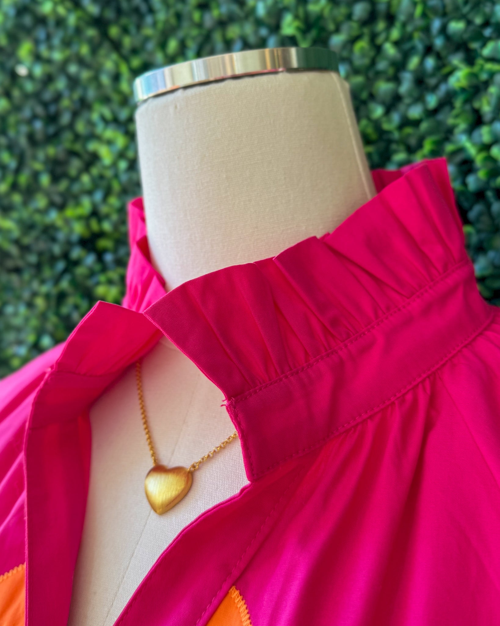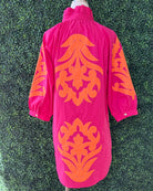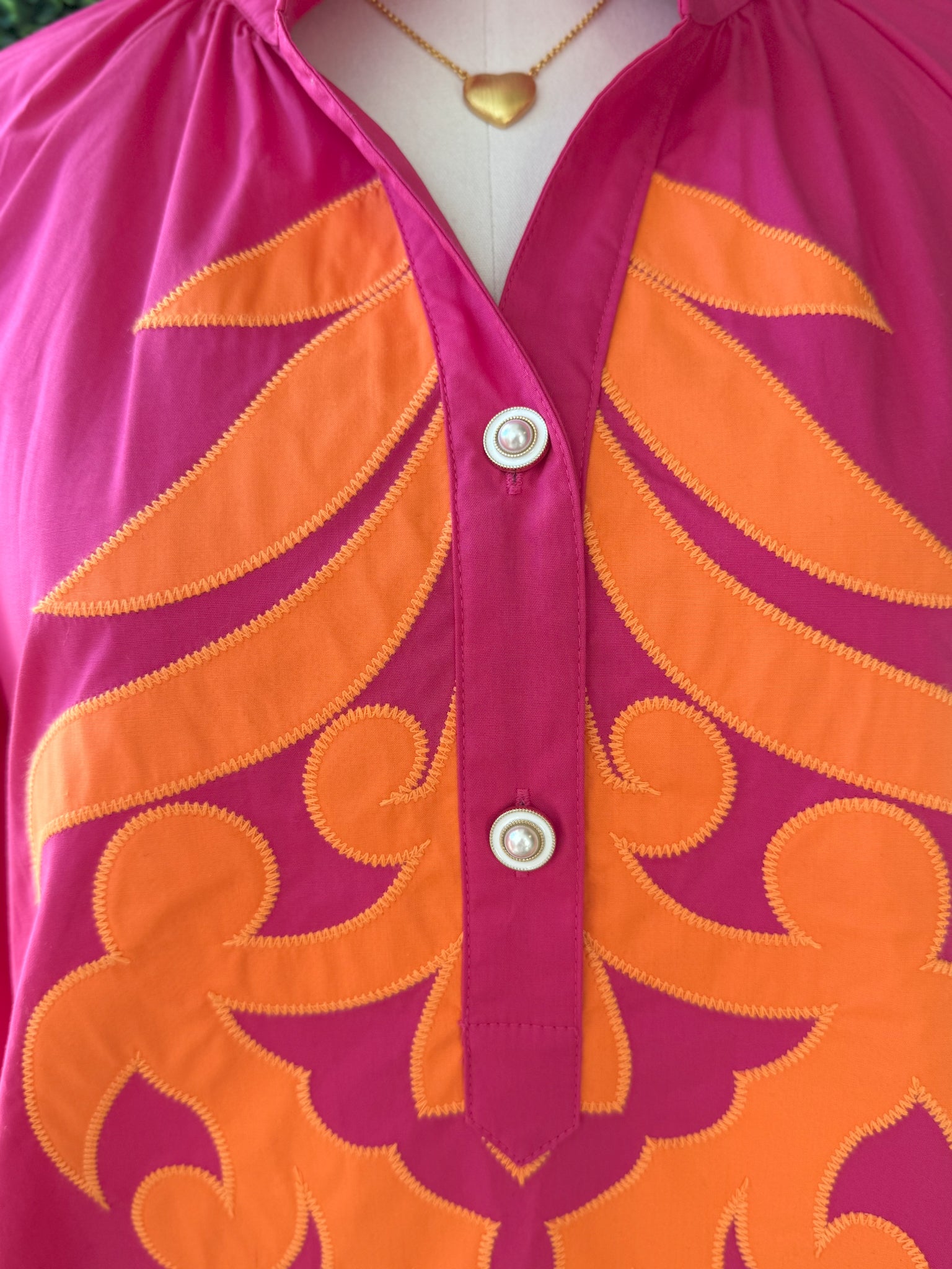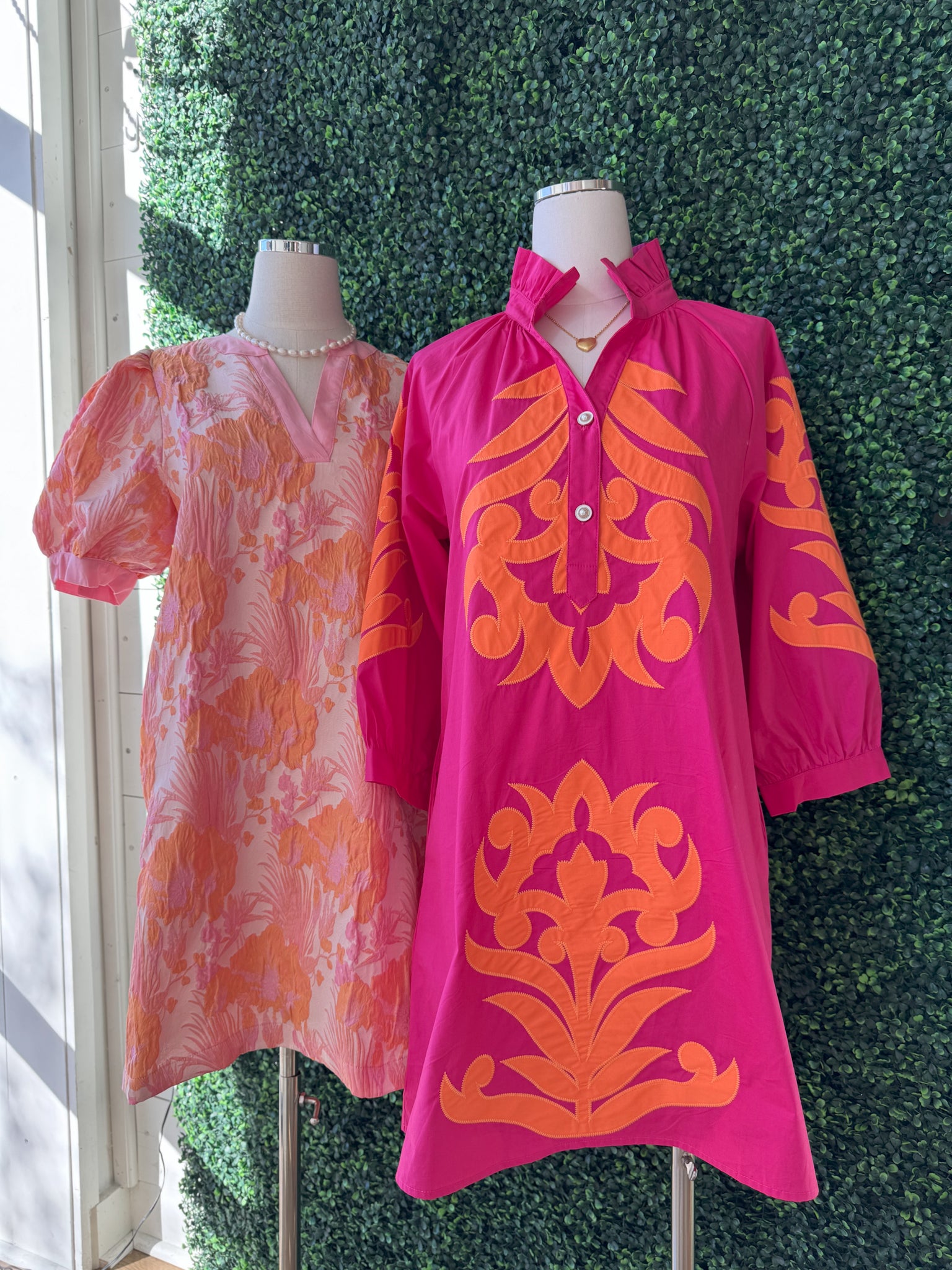 The bold and luxurious embroidery on this dress is calling our name! The floral embroidery creates a fun and bright contrast that elevates the look. The finished buttons and flutter collar detailing finishes the look beautifully. The a-line shape makes this piece easy to wear, and love!