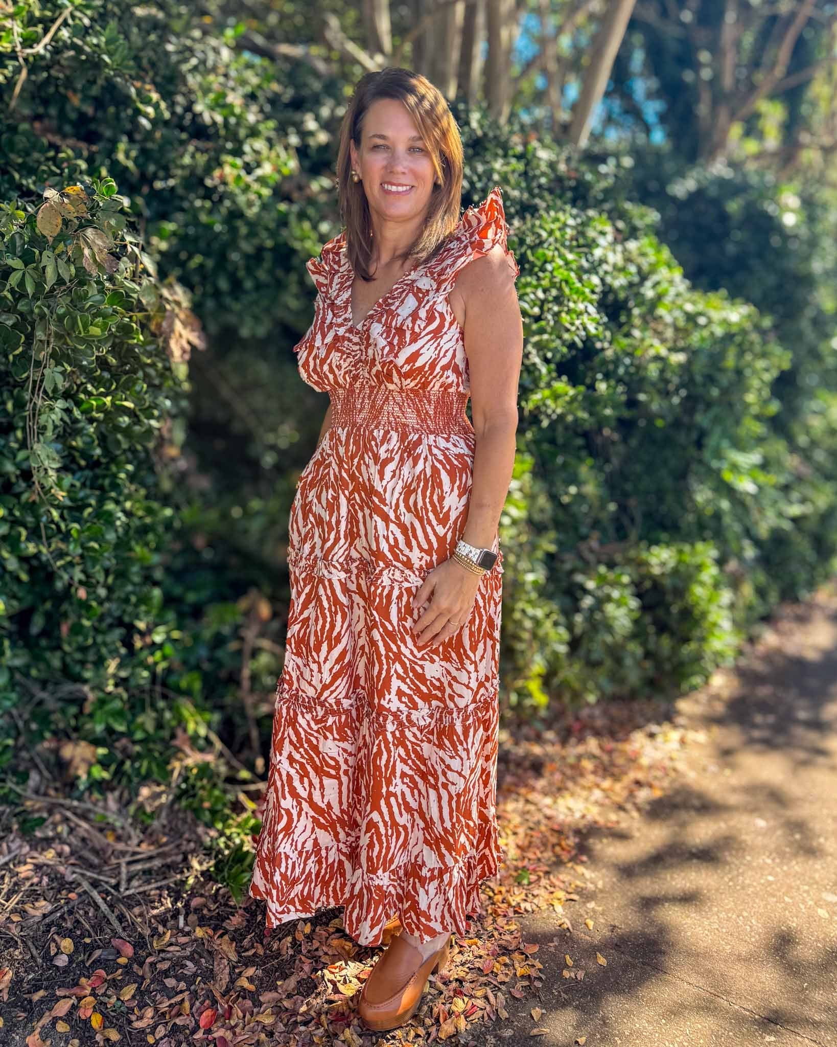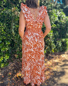 Turn heads in our Azalea dress - Stun in a bold terracotta animal print! The beautiful elements of this dress speak for itself - the cascading ruffles, deep V neckline, and a smocked waist that flatters every curve. This dress is perfect for all things Clemson!