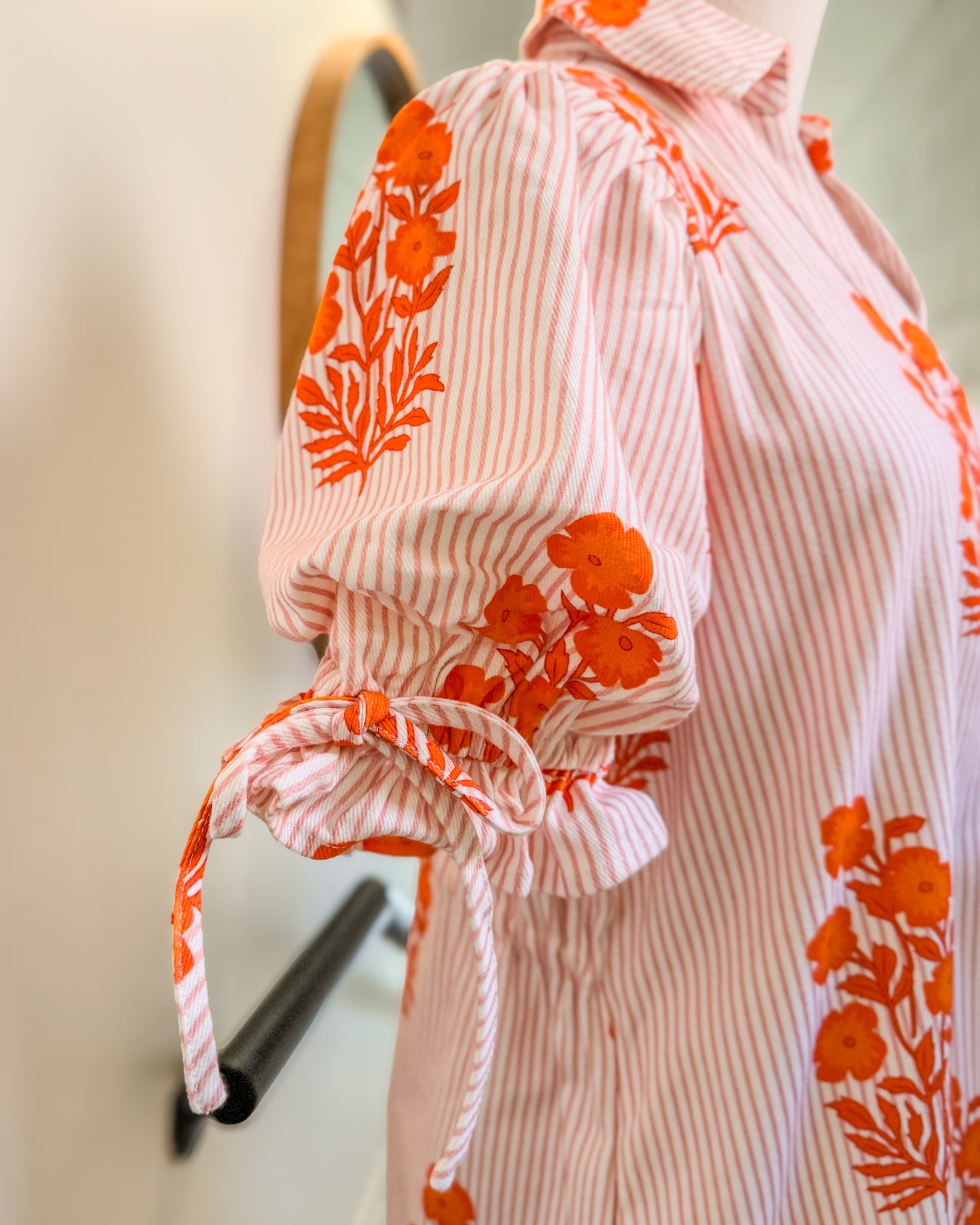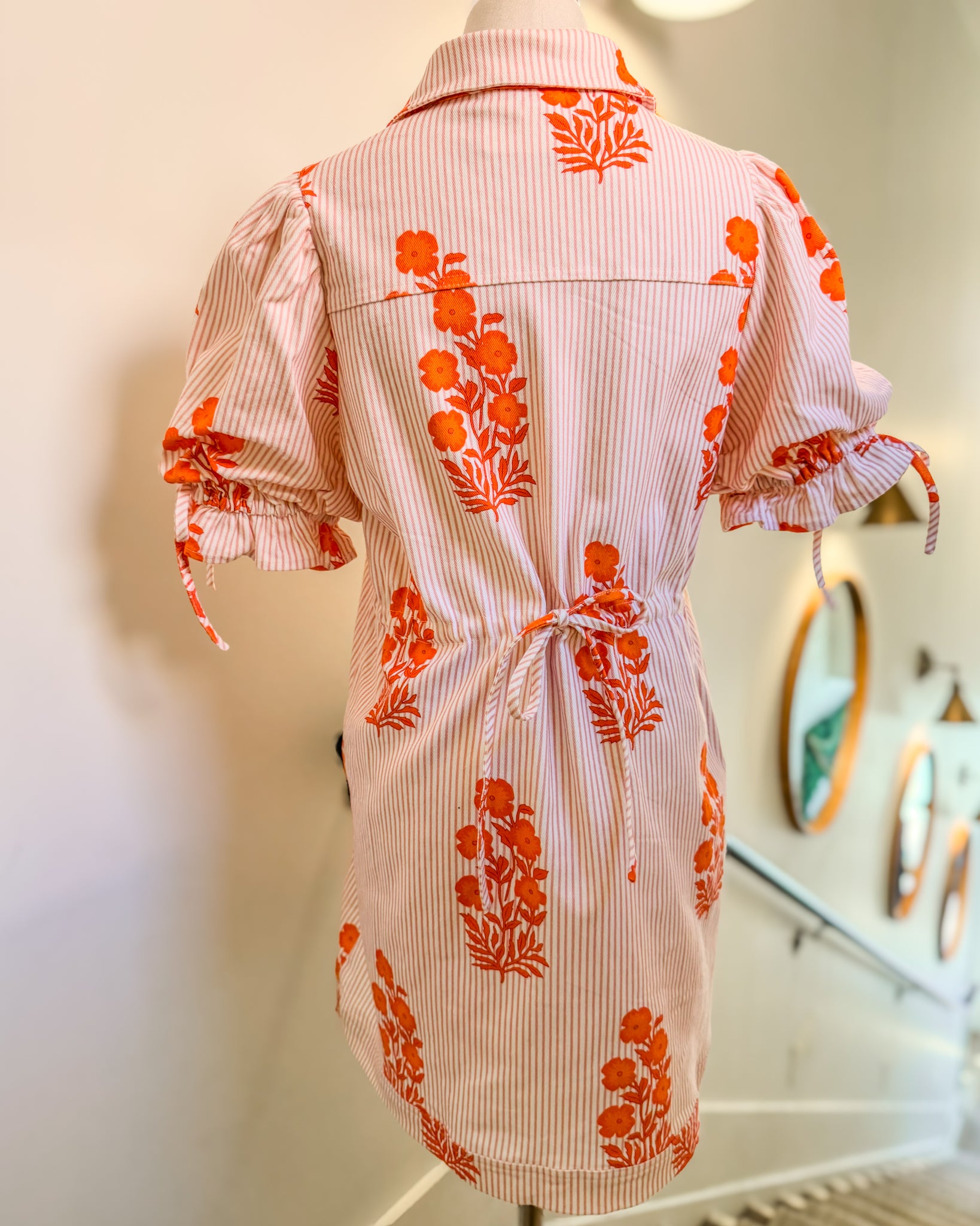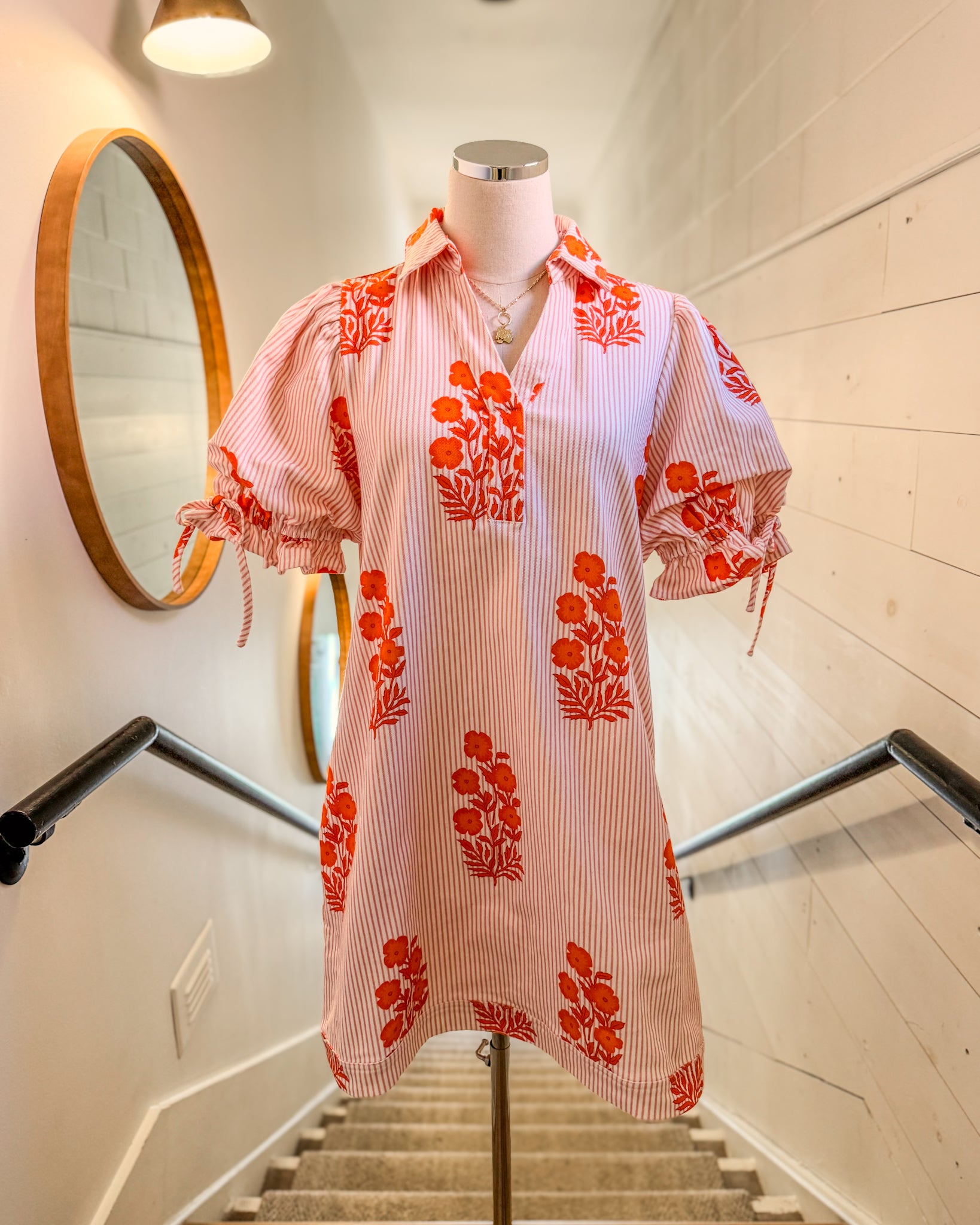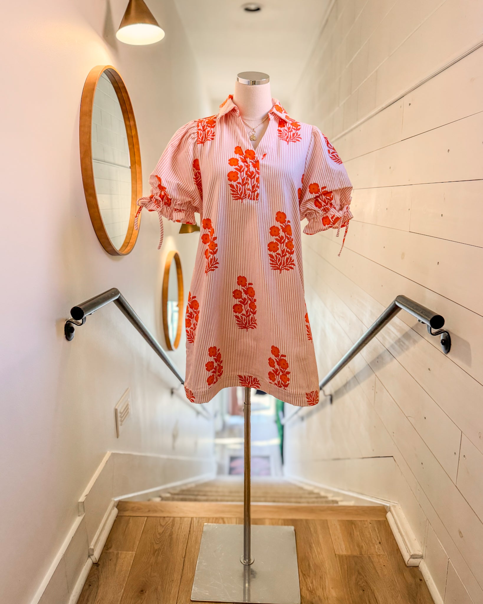 Bright and effortlessly stunning, our Paloma dress features a soft, flowing silhouette adorned with vibrant, eye catching florals. The delicate tie detailing on the sleeves are adjustable and beautifully crafted to elevate the entire look. With the flattering length and lightweight feel, this dress moves effortlessly with you. This piece is perfect for brunch, showers, or any occasion that calls for something special.