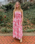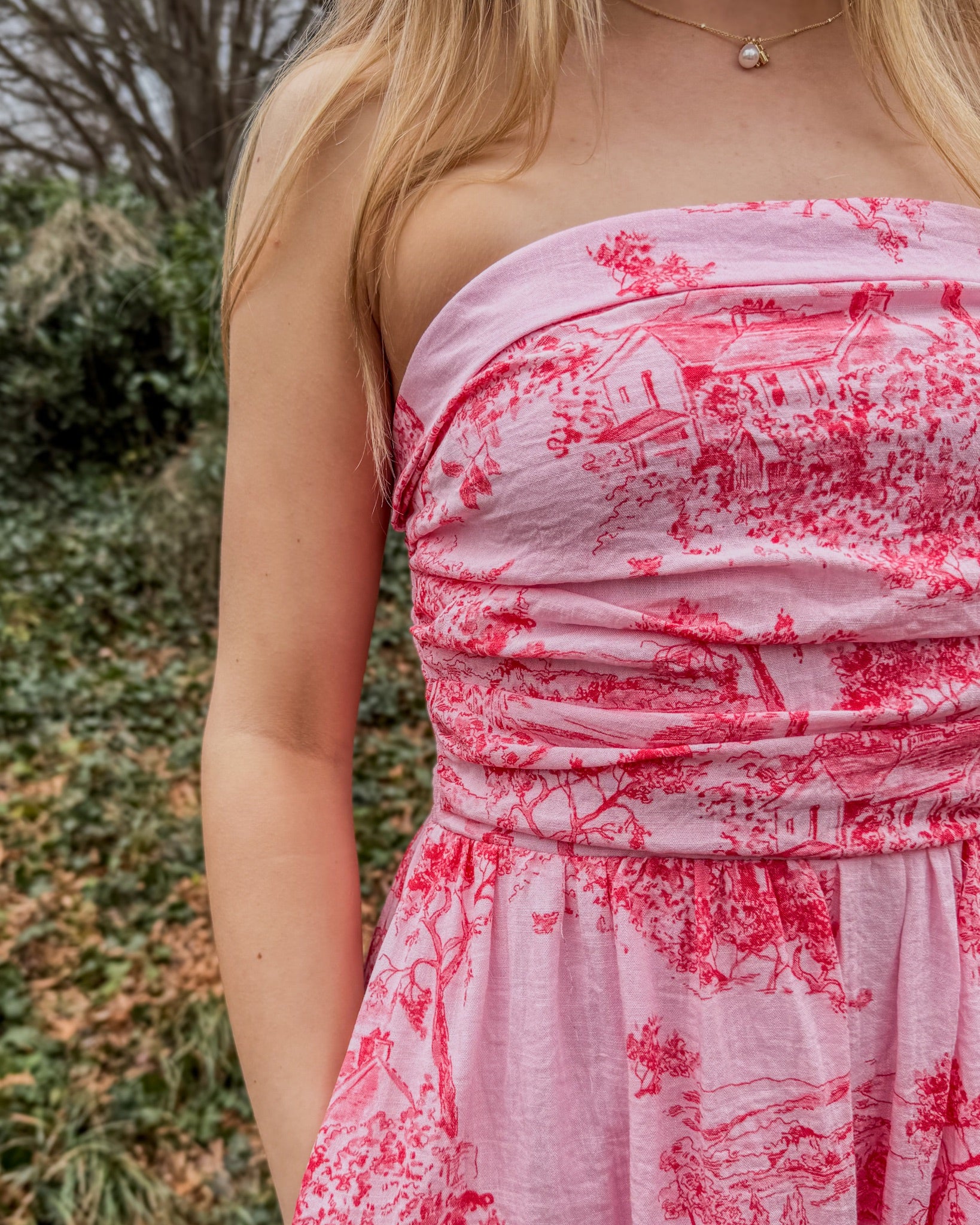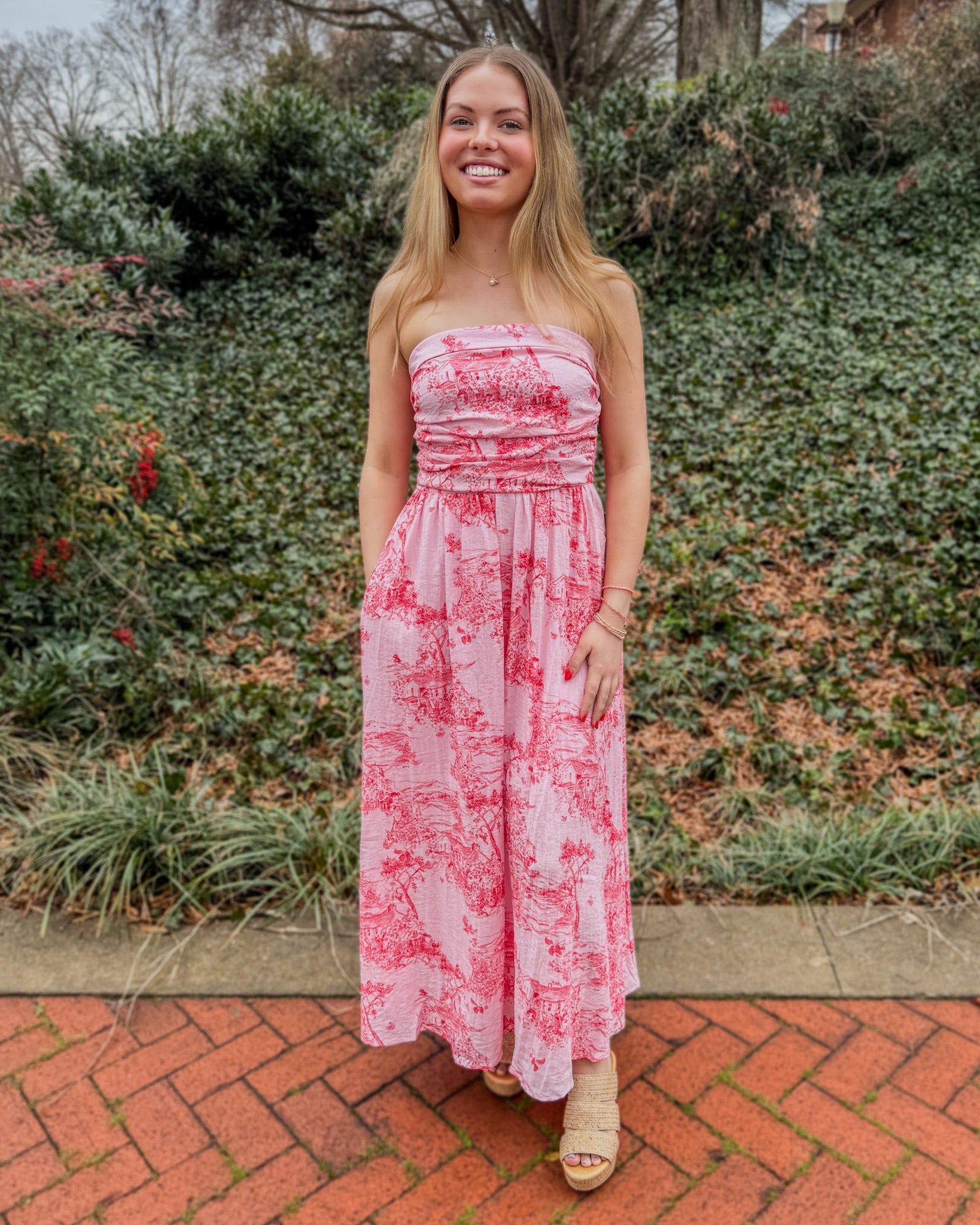 Soft, romantic, and effortlessly feminine - this strapless maxi dress is a true statement piece. Designed in a dreamy blush pink with delicate red toile-inspired scenery, it feels both timeless and fresh. Perfect for spring weddings, garden parties, showers, or vacation evenings, this dress is one of those pieces that instantly makes you feel put together.