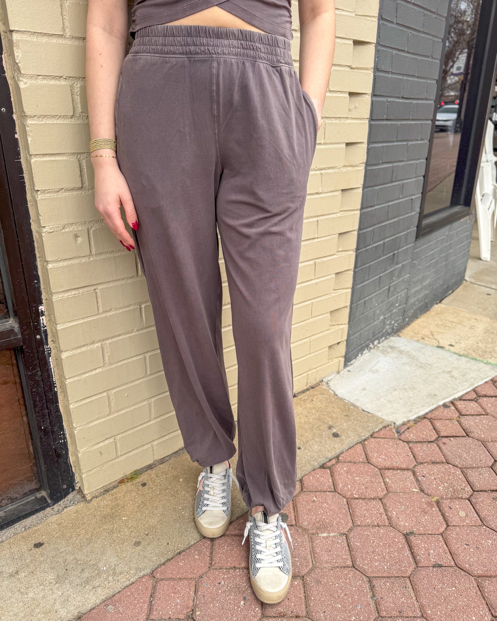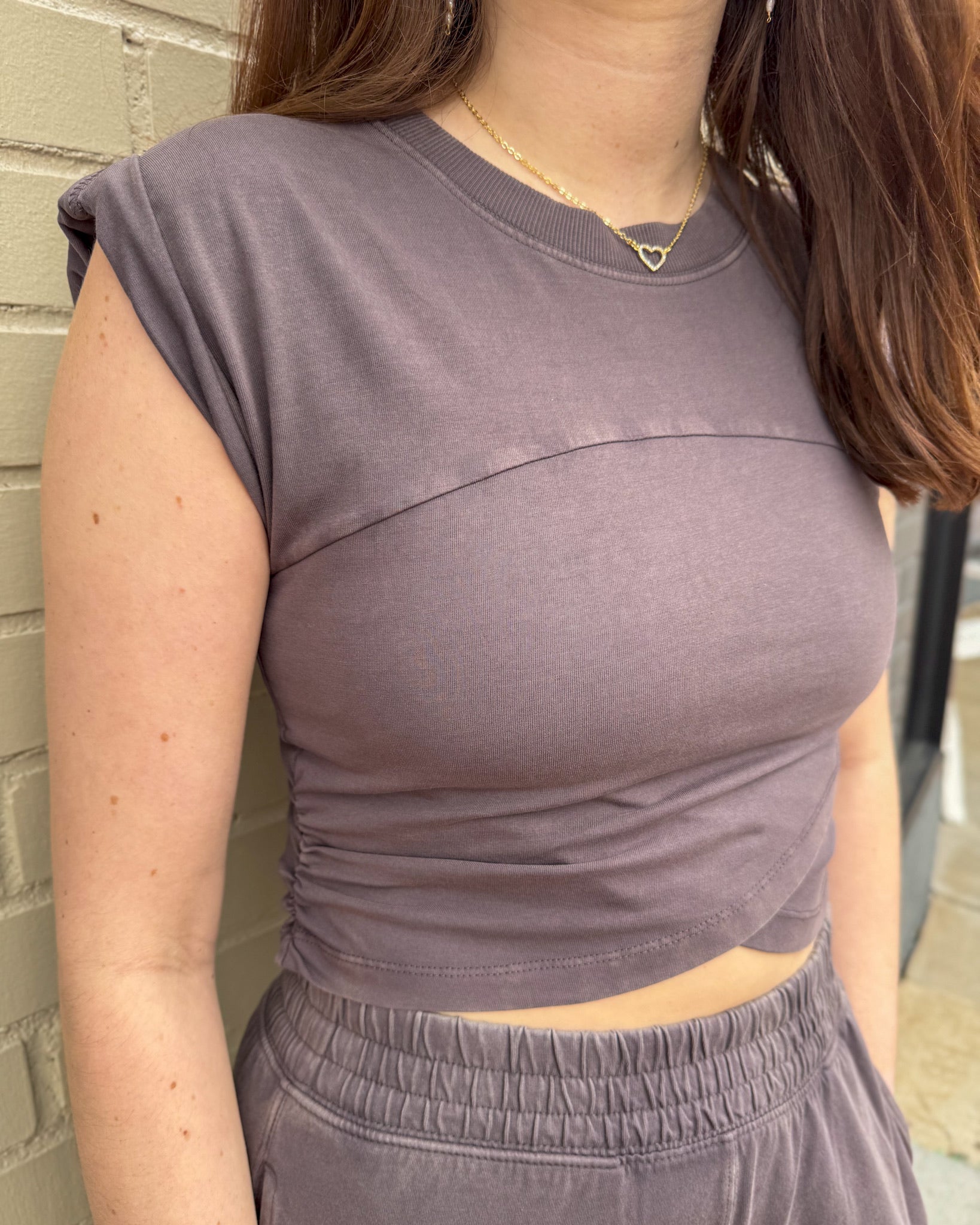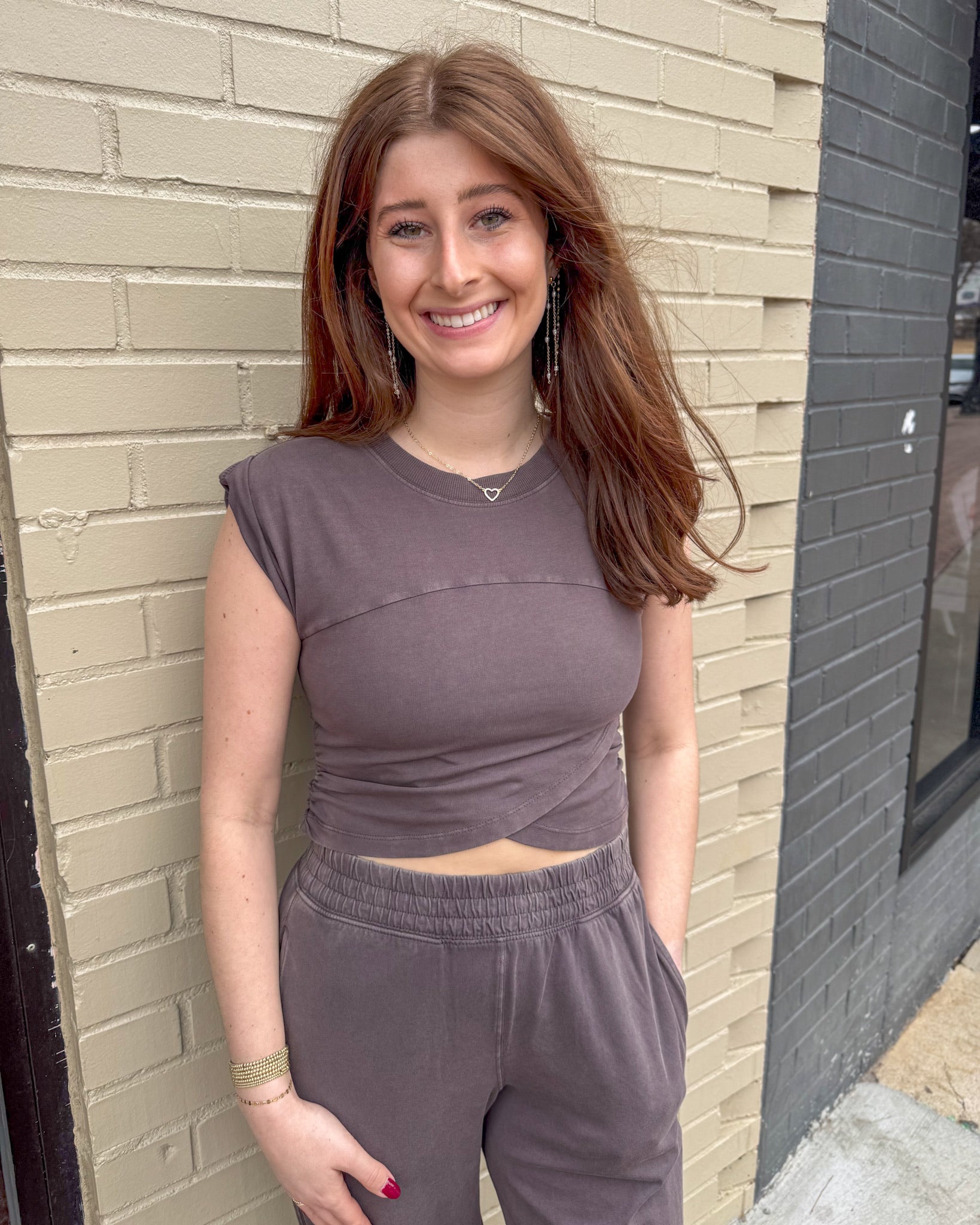 This Free People set is the definition of effortless cool and comfy-chic. Featuring a soft, lightweight fabric, the cap sleeve top has flattering ruching and a subtle twist detail that gives it a stylish edge. Paired with flowy, wide-leg pants that cinch gently at the ankle, this look is perfect for everything from casual days on campus to weekend coffee runs. With its easy fit, pockets, and dreamy chocolate hue, this set proves that laid-back style can still turn heads.