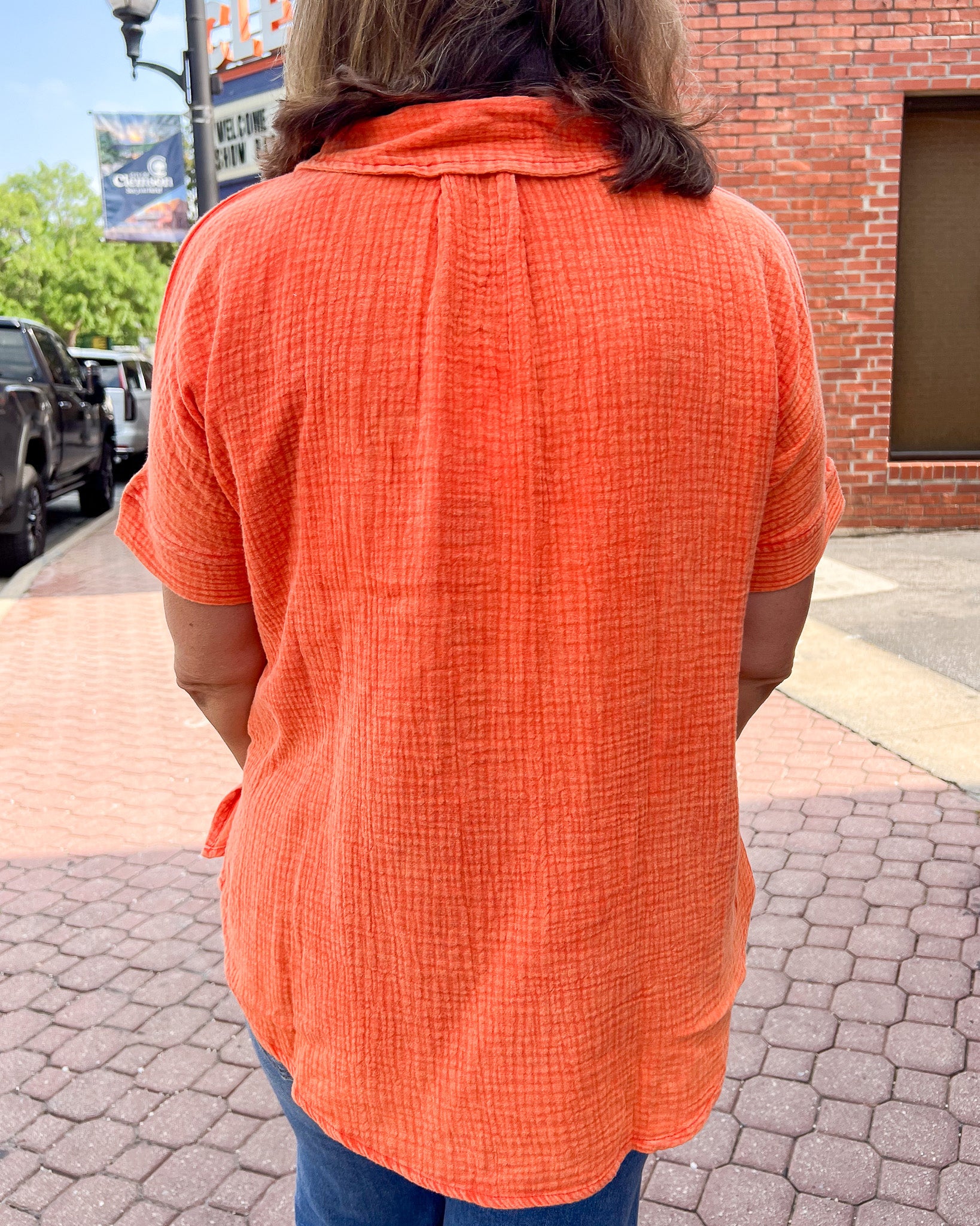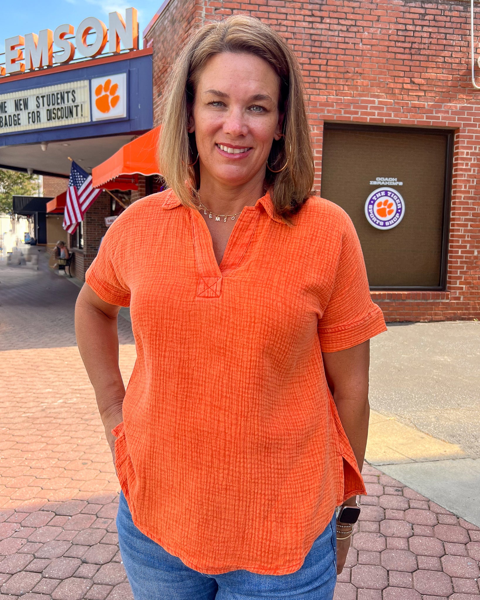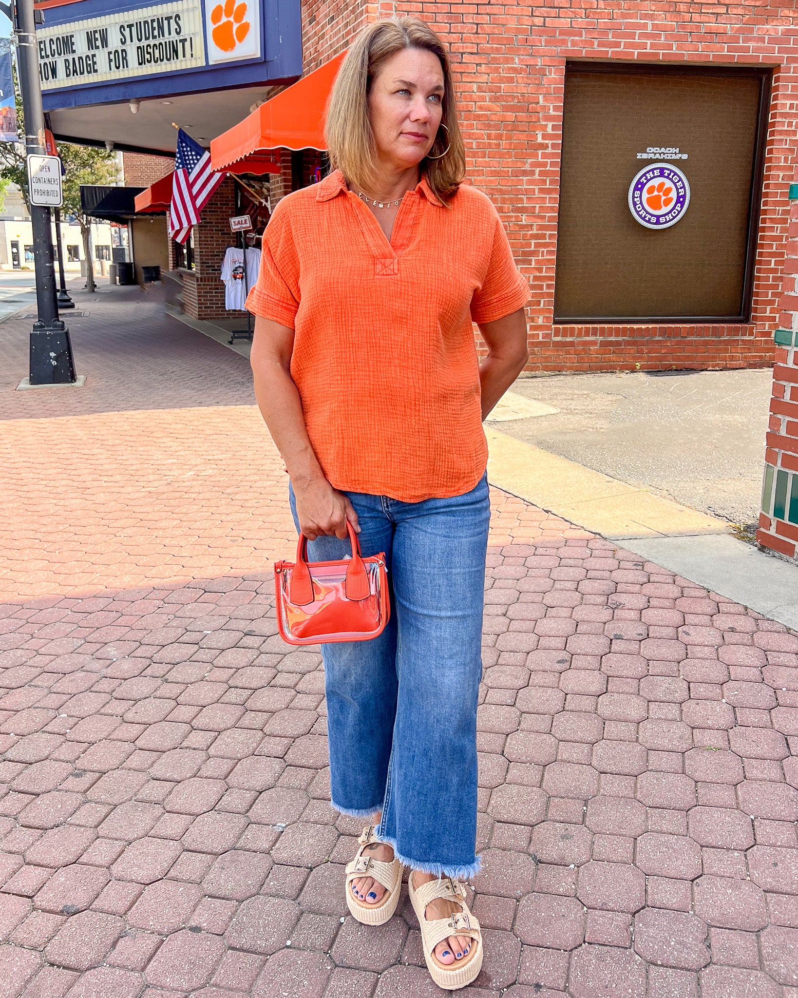 We are "all in" over this orange top! This lightweight material will keep you looking and feeling good, all summer long. Grab your favorite denim and pair with a clear bag to cheer on the tigers this fall!