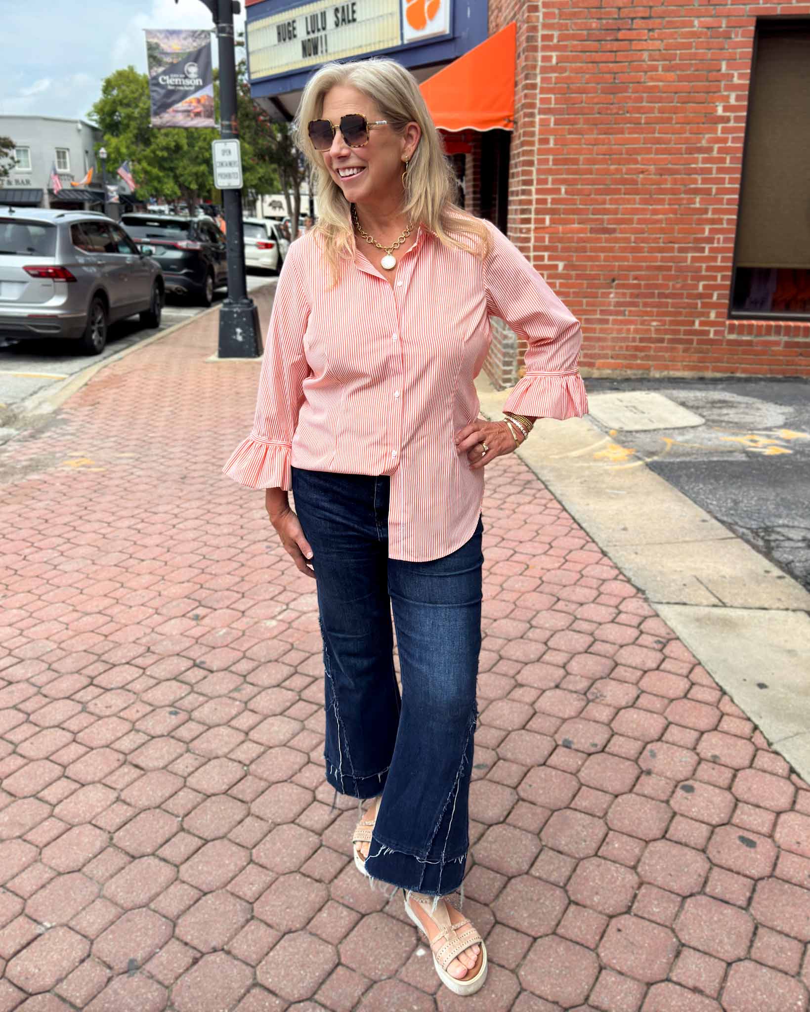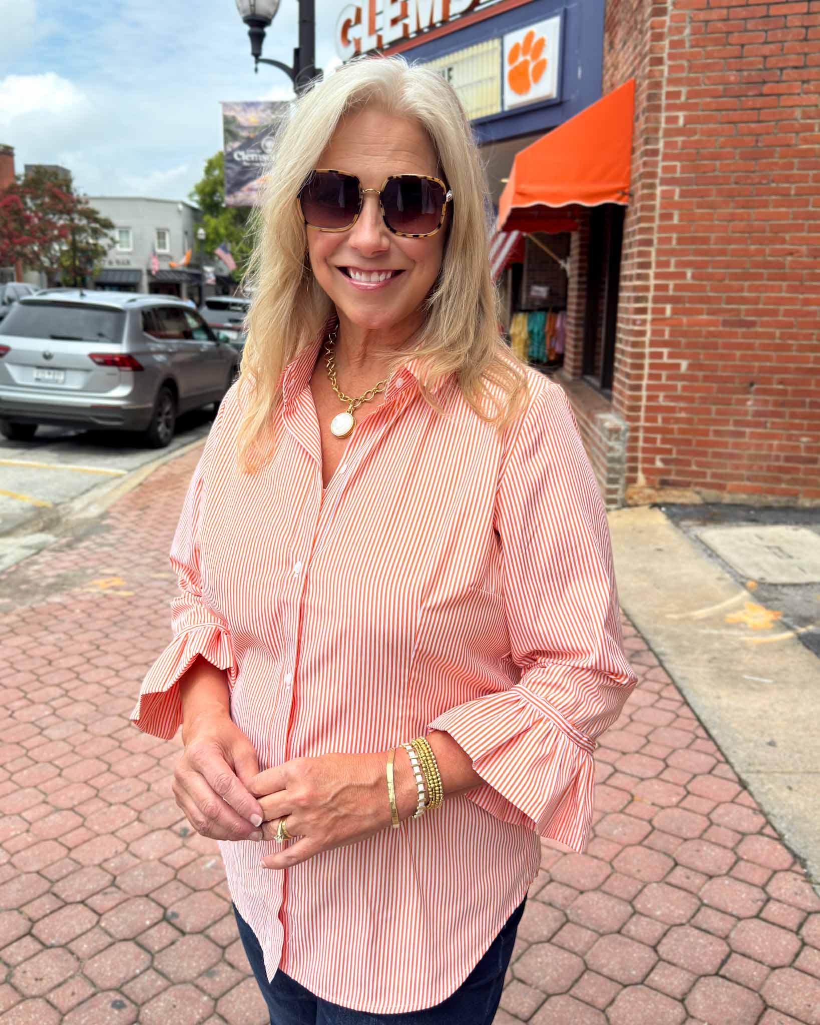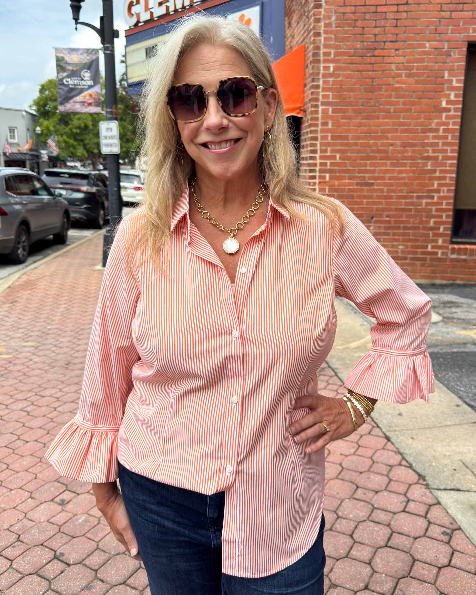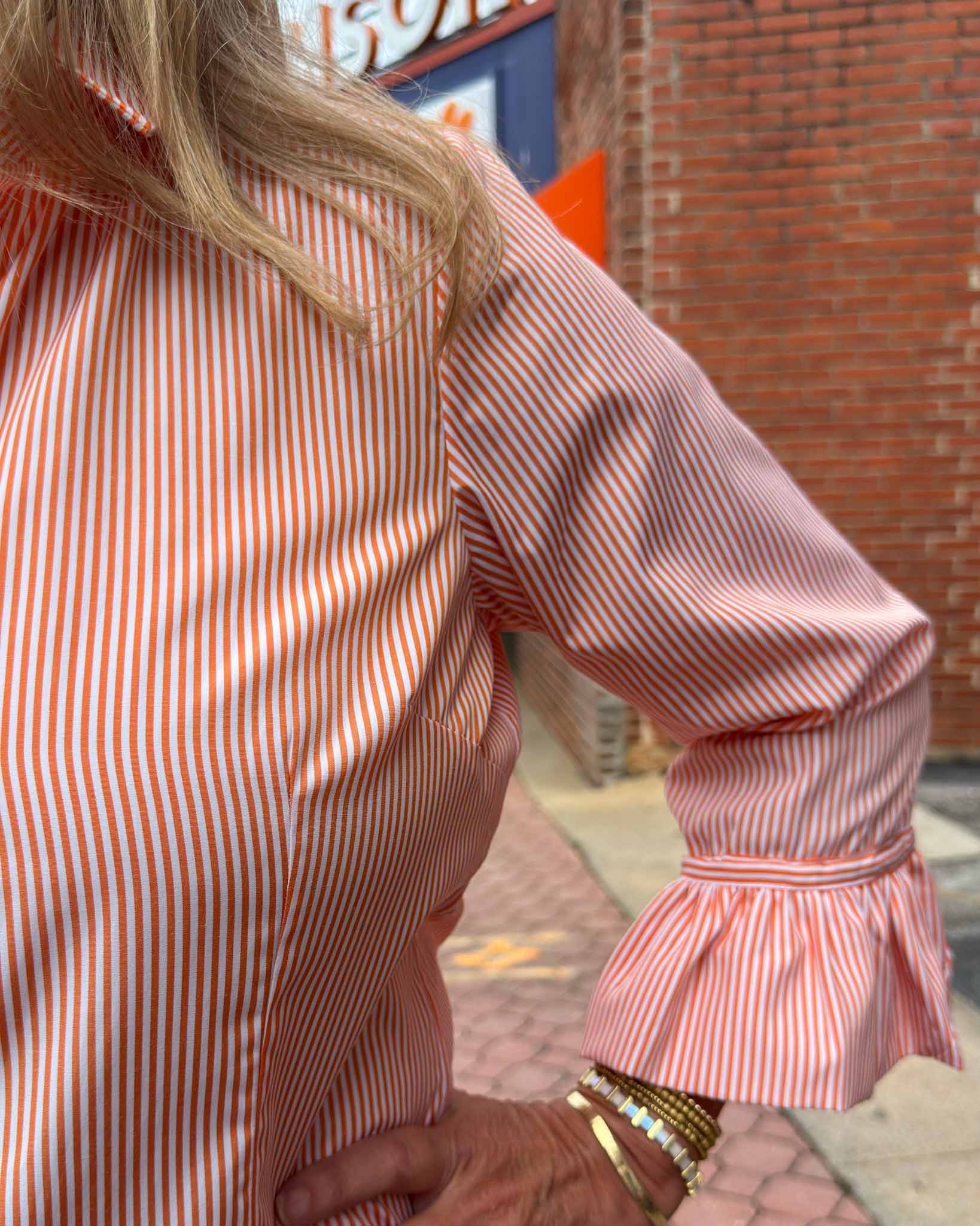 This Gretchen Scott blouse is perfect for an elegant, sophisticated look - the stripes add the perfect touch of Clemson spirit. This statement piece will add a stylish touch to any wardrobe. This button down design completes the timeless look, with a fun element of sass with the ruffle detailing on the sleeves!
