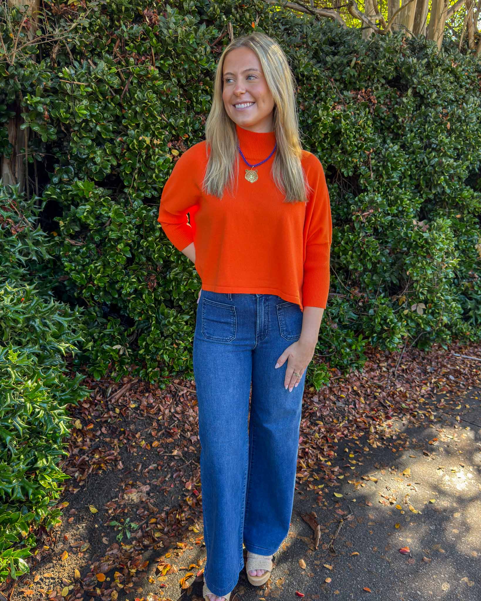 The Aja sweater balances a structured, sharp silhouette with the ease of knitwear. This cropped mock style is a classic with a modern twist. Perfect for pairing with high-waisted jeans or a flow skirt. Wear this to cheer on the Tigers, or dress it up for a fall evening.