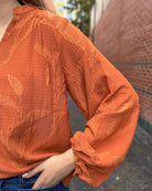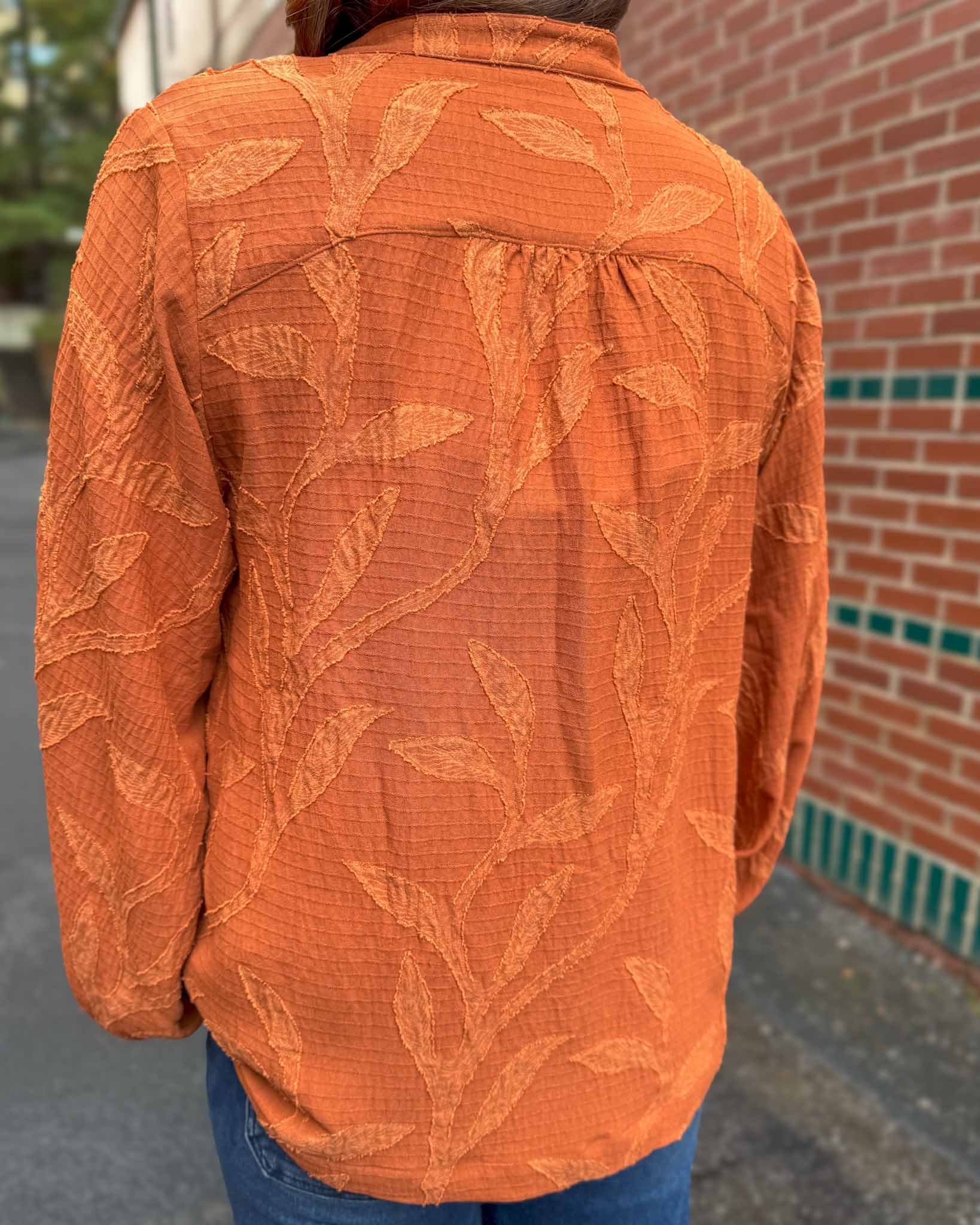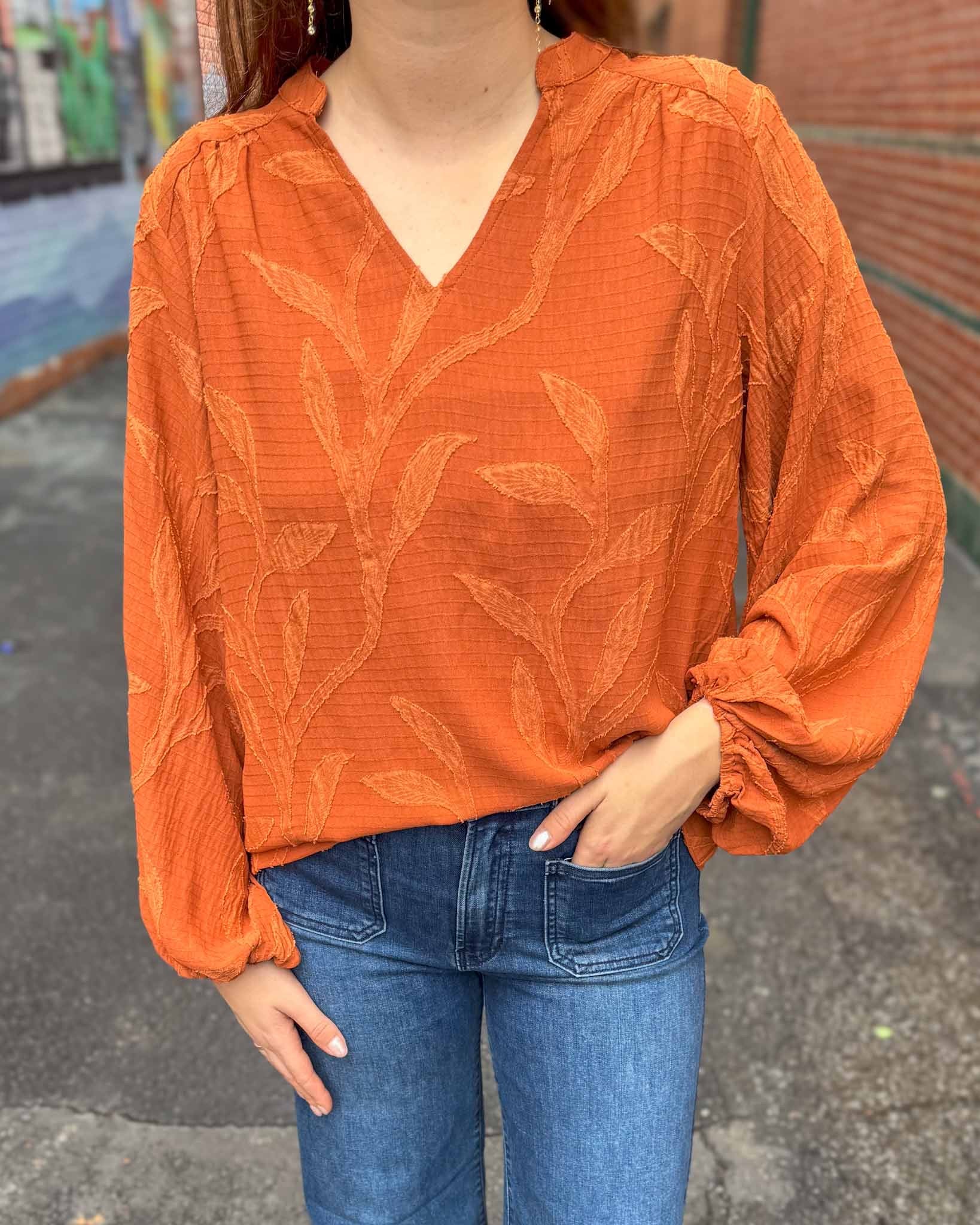 This simple, but elevated top is the perfect fall shade. The deep rush featuring leaf texturing across the top, a deep v-neck and mandarin collar to create a flattering silhouette. This is a must have to add to your closet this season - Pair with dark denim for the perfect look.