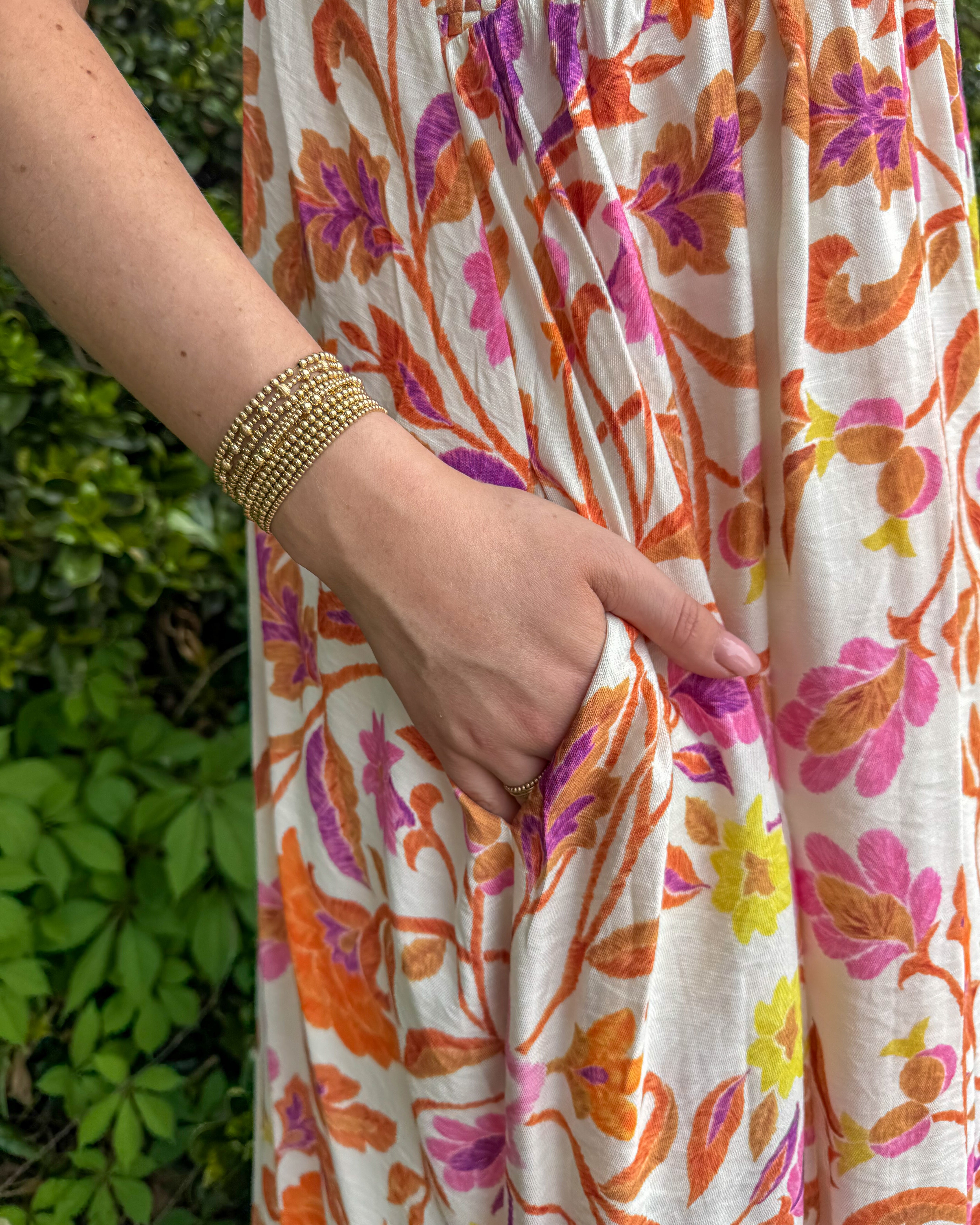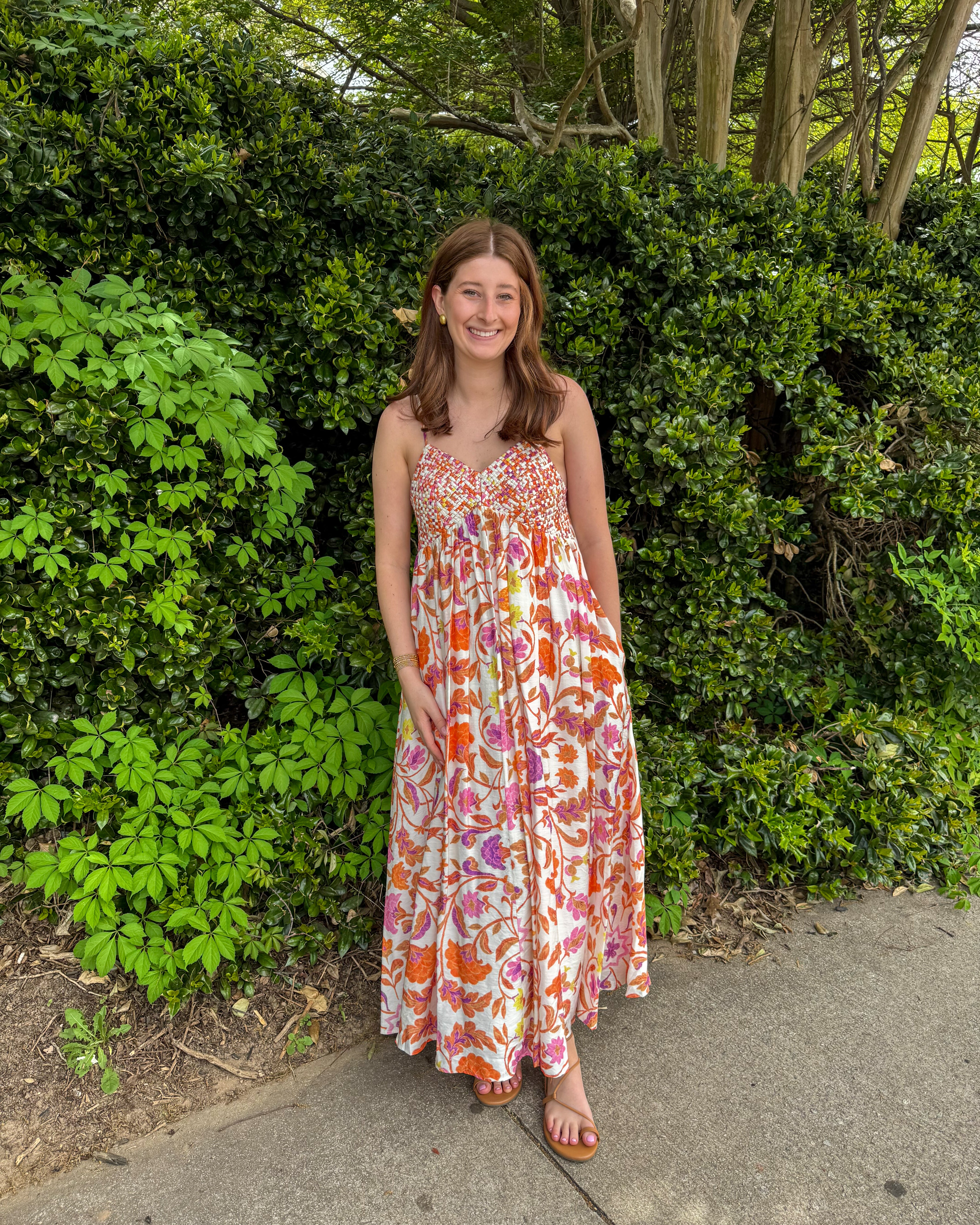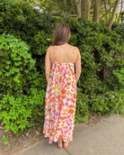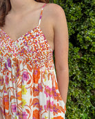 This vibrant midi dress is the perfect mix of playful color and effortless charm. Featuring a textured, smocked-style bodice with a multicolor woven look. This piece adds dimension and detail that instantly elevates your outfit. The flowy skirt showcases a bold floral print in warm tones of orange, pink, and purple, giving it that eye-catching, statement feel.