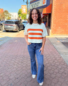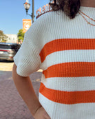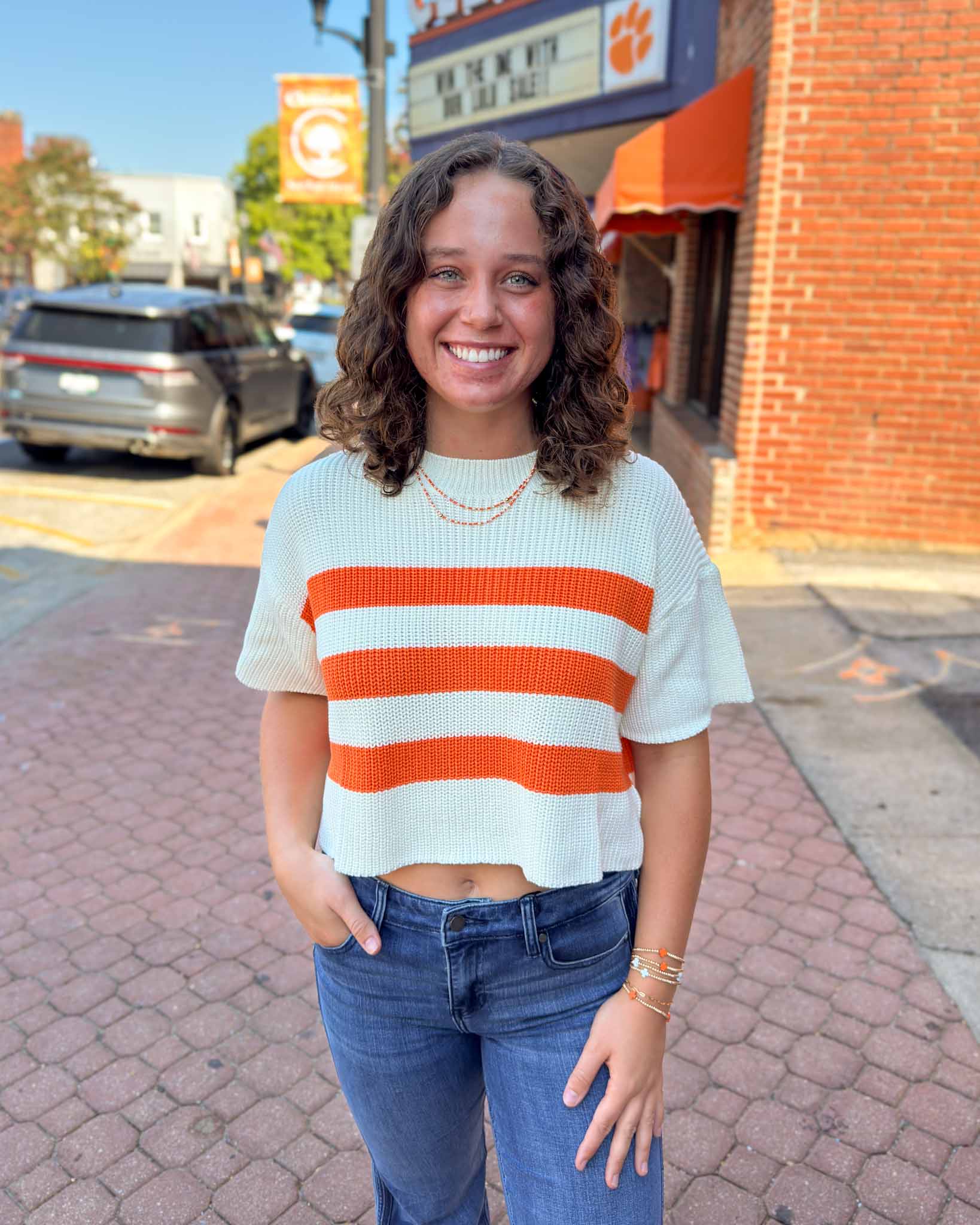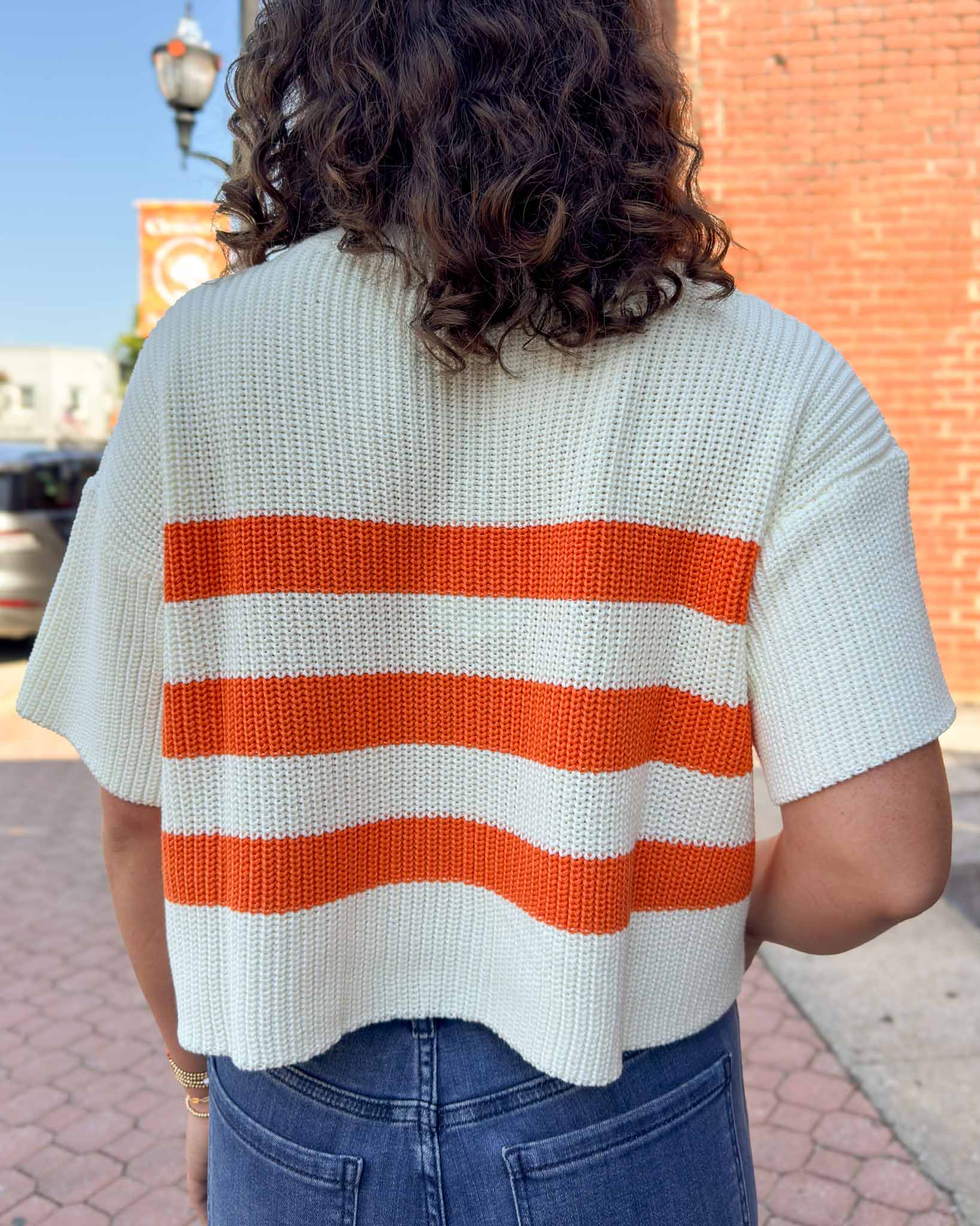 Bring effortless charm to your look with this cropped knit sweater. Featuring a soft cream base and bold orange stripes, it blends cozy texture with a playful and stylist edge. The short sleeves and relaxed fit make it perfect for pairing with denim! Whether you're cheering from the stands or strolling through town, this top is your go-to for casual chic vibes.