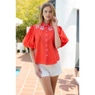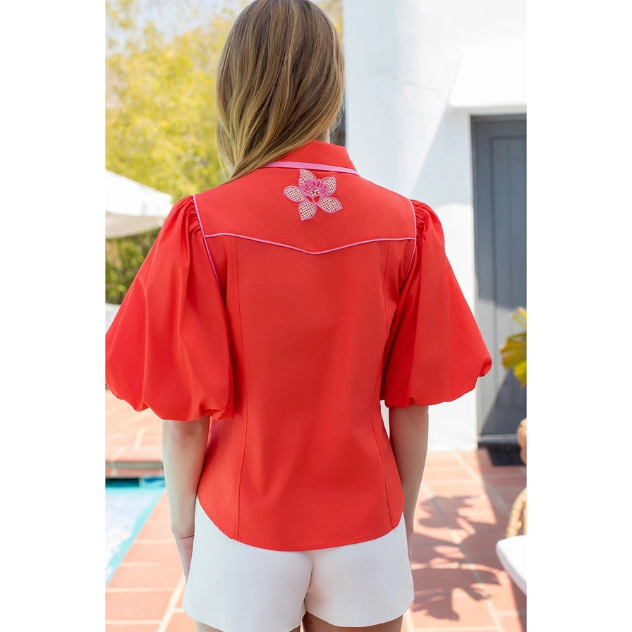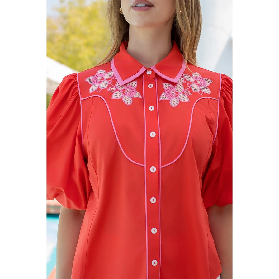 This vibrant blouse is the perfect mix of playful charm and polished style. Featuring a bold orange hue with puff sleeves and feminine floral embroidery along the collar, it brings a touch of whimsy to any outfit. The pink piping detail adds a soft contrast, while the button-down front and structured fit keep the look refined.