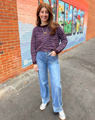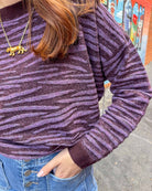 Make a bold, but cozy statement in this Tiger striped sweater. Featuring a rich plum base with vibrant lavender striping, this sweater blends playful pattern with modern edge. The relaxed fit, soft knit texture, and ribbed neckline make it as comfortable as it is stylish! Pair it with your favorite denim for an easy, every day look.