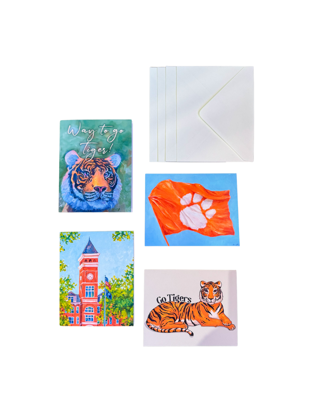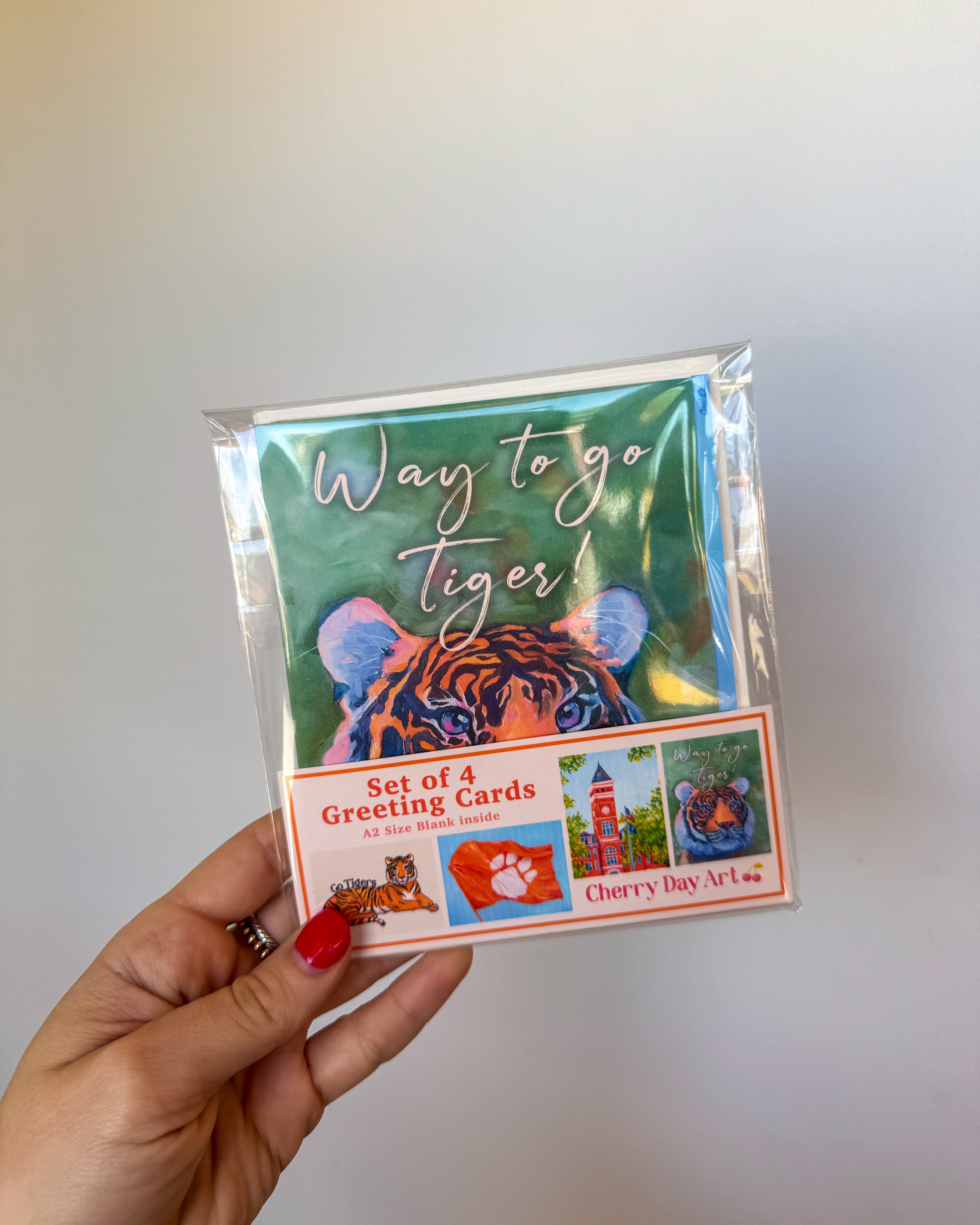 Celebrate every occasion with the Cherry Day Art Set of Four Greeting Cards! Each card features a elegant Clemson design. Perfect for birthdays, graduations, or any heartfelt message you'd like to share! The high-quality cardstock ensures your words make a lasting impression. Matching envelopes included for convenient gifting. Customize each card with your own personal touch!