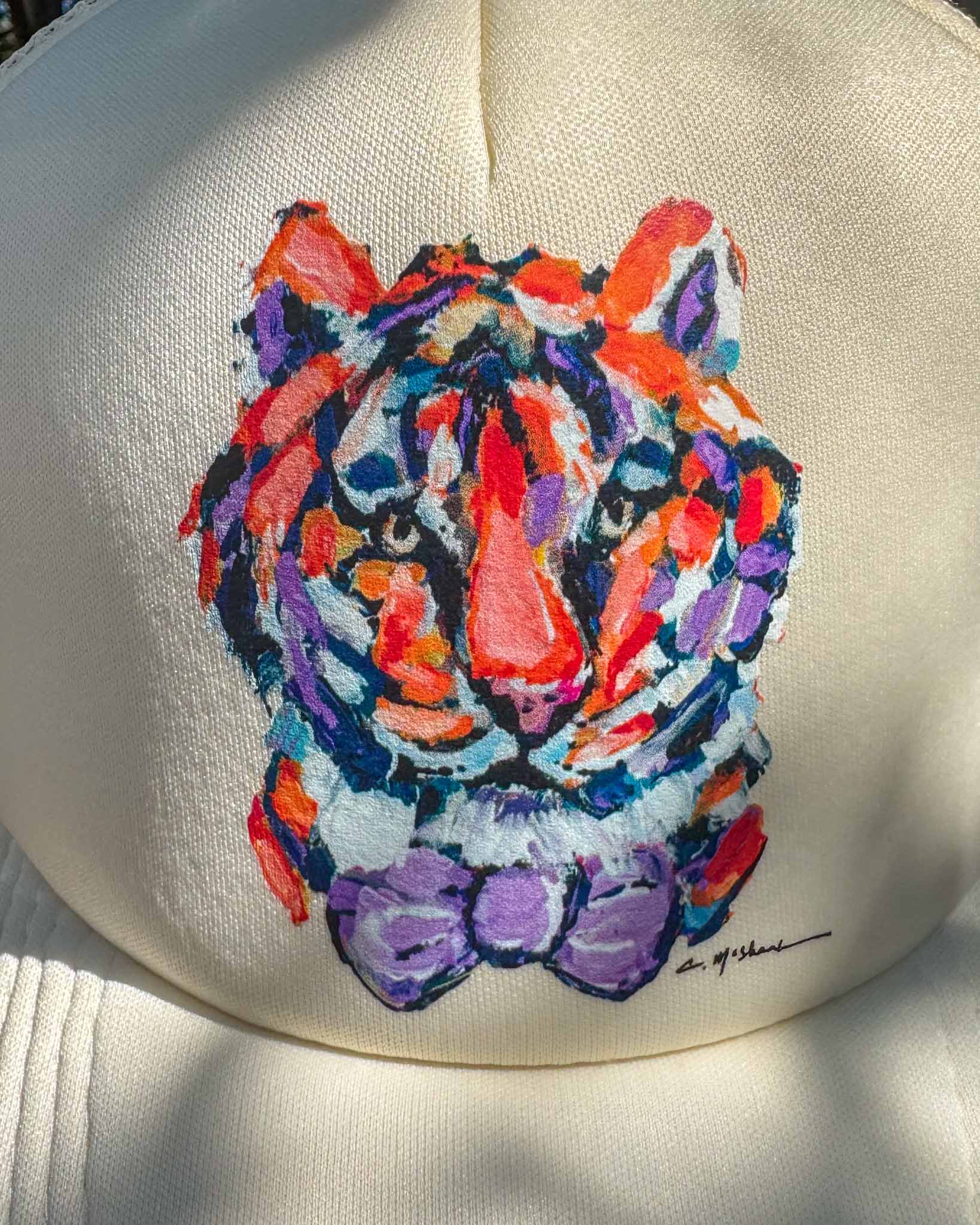 Fierce, fun, and full of Tiger pride, this cream hat is a game day must-have! Featuring an illustrated tiger with a perfectly preppy purple bow, this hat blends comfort with Clemson spirit. Block out the sun and add a touch of style, ideal for those warm southern Saturdays. Whether you're tailgating on campus or grabbing coffee downtown, this hat brings the perfect pop of personality.