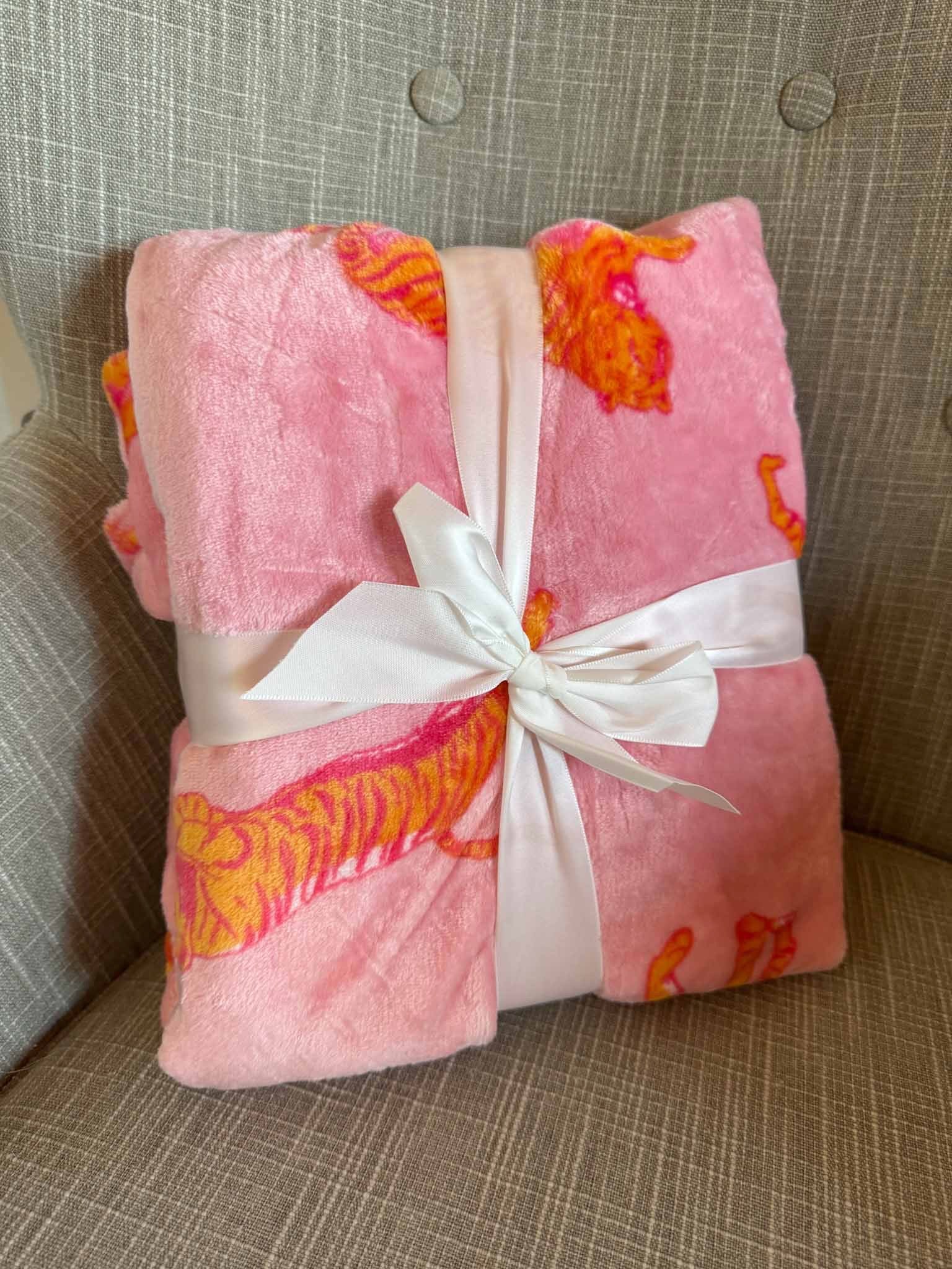 Our best-selling throw is back in a new color - Pink! We love anything cute and cozy. This adorable blanket is sure to meet all your needs. This fun tiger printed blanket will keep you warm and comfy while supporting the tigers from home! A perfect gift for any Tiger!