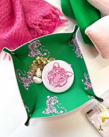 This chic catch-all tray is the perfect blend of bold color and playful charm. The vibrant green base features whimsical pink tigers, giving it a luxe yet spirited vibe. The structured corners neatly snap to form a shallow dish, making it ideal for holding jewelry, keys, lip gloss, or any essentials you want to keep organized and contained! This is a perfect gift for this holiday season.