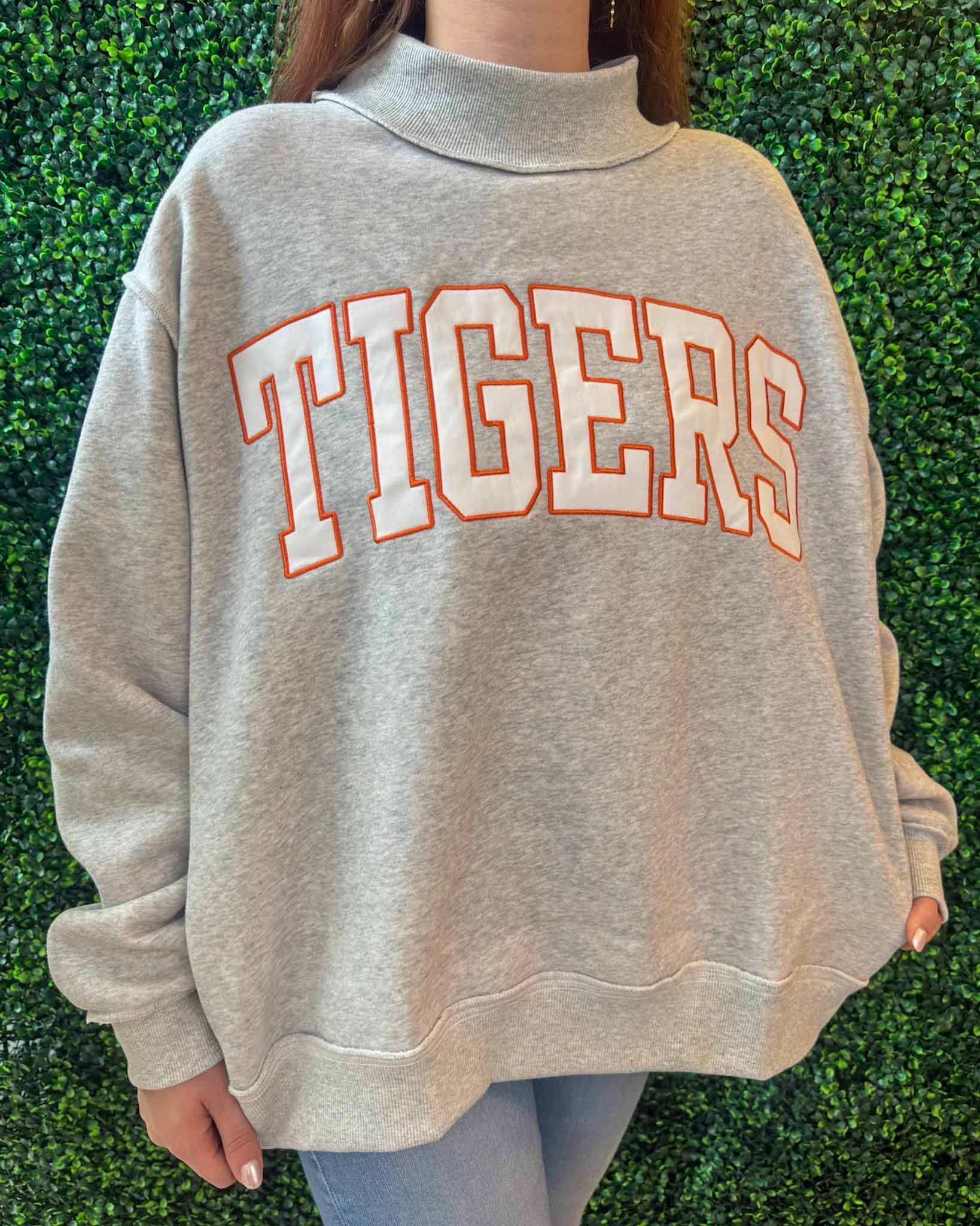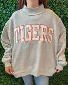 Stay cozy and on trend with this soft & stylish heather grey sweatshirt featuring a high mock neck, keeping you extra warm this fall! The oversized style offers a comfortable and relaxed vibe. Featuring embroidered bold lettering "Tigers" piped in Orange to add a spirited and fun contrast. This mock neck is perfect for dressing up or down, while supporting your favorite team! Exclusively designed by True Orange Boutique.