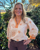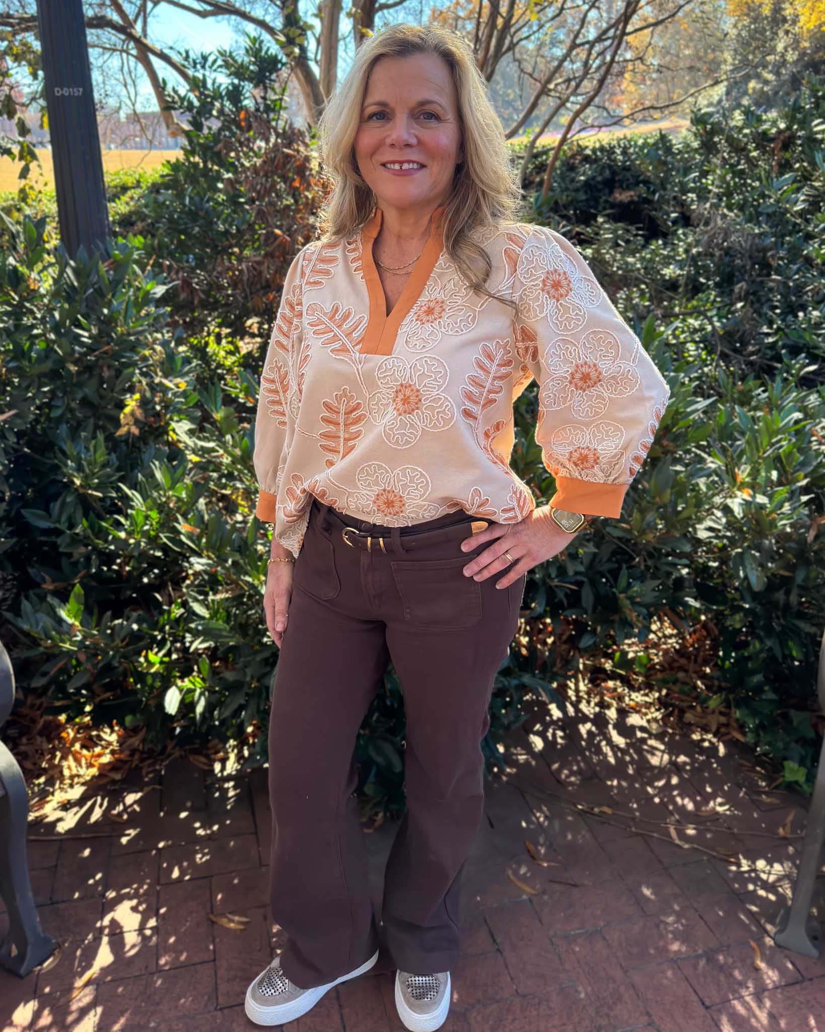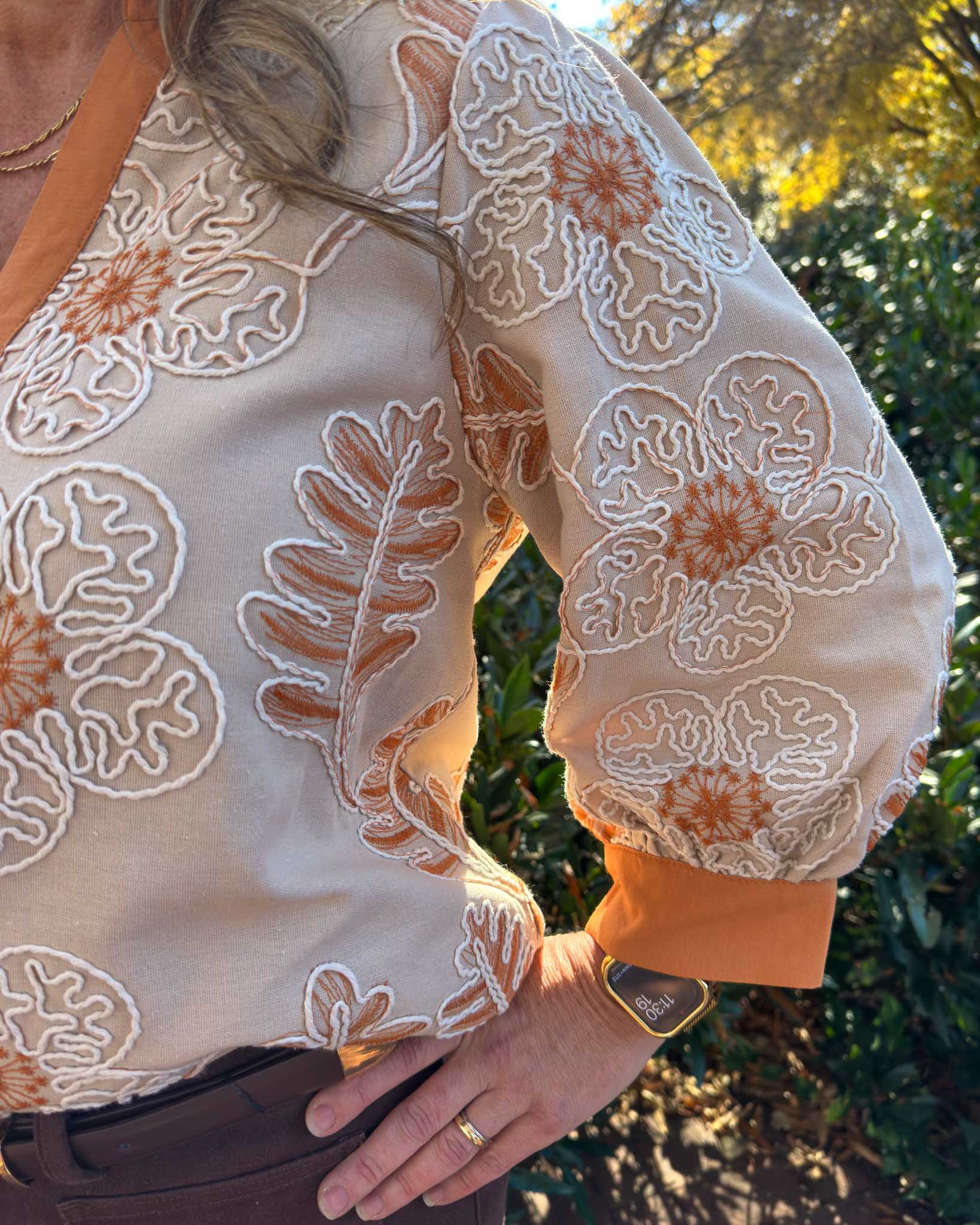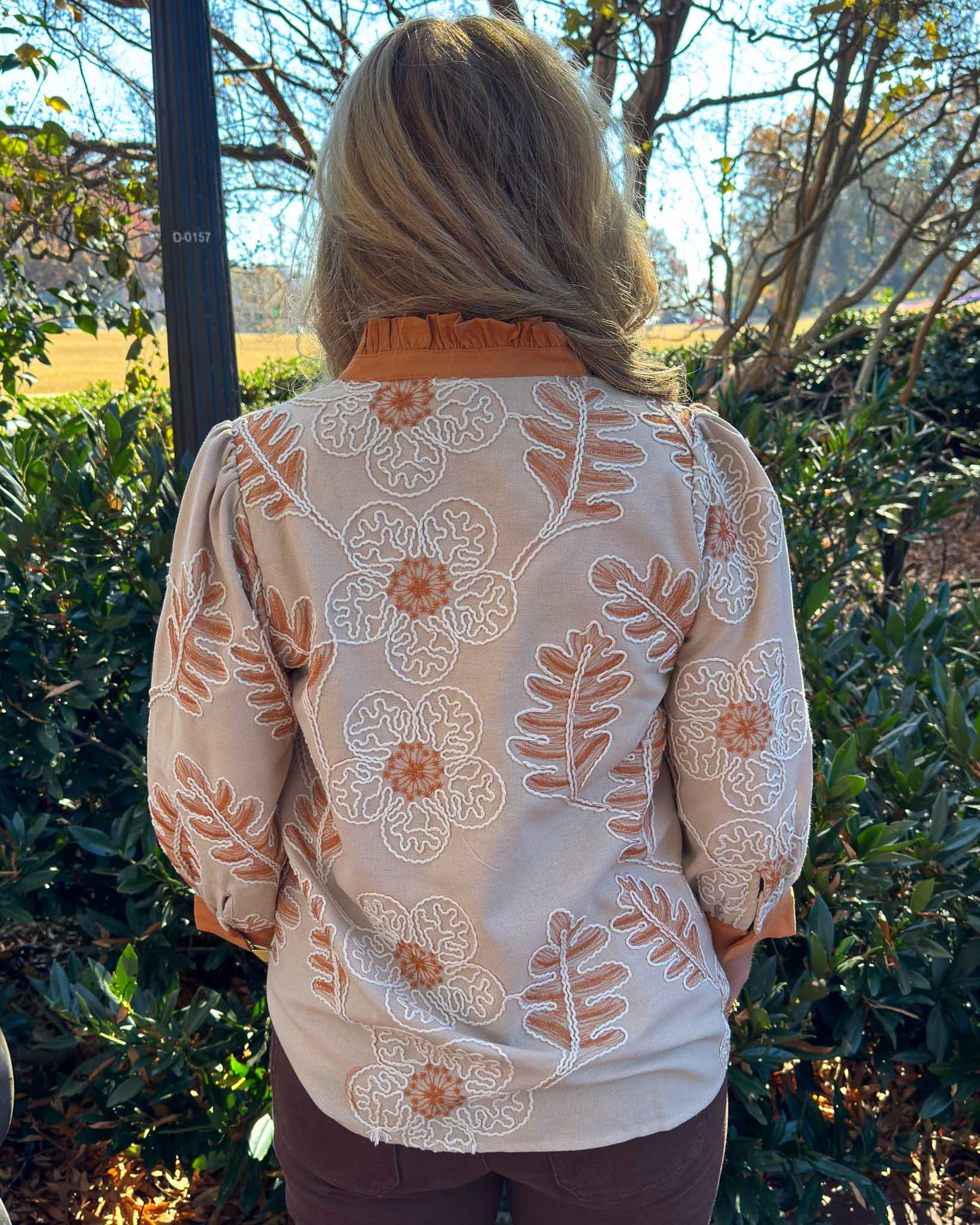 Neutrals, embroidery details, and stitch-work! This top screams elegance and elevated vibes. The ruffle neck detailing and puff sleeves create a gorgeous silhouette. This is perfect for our Clemson fans who love a more understated, but spirited look. Pair this with dark denim for a stylish and classy look.