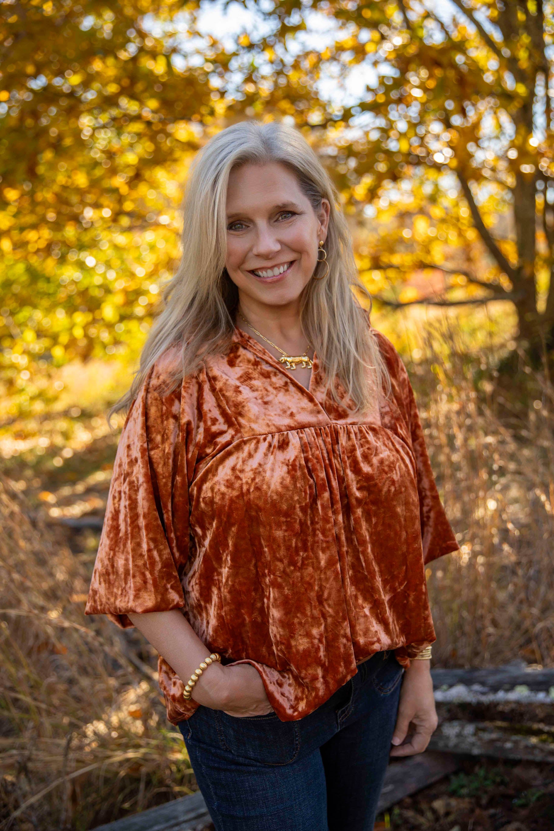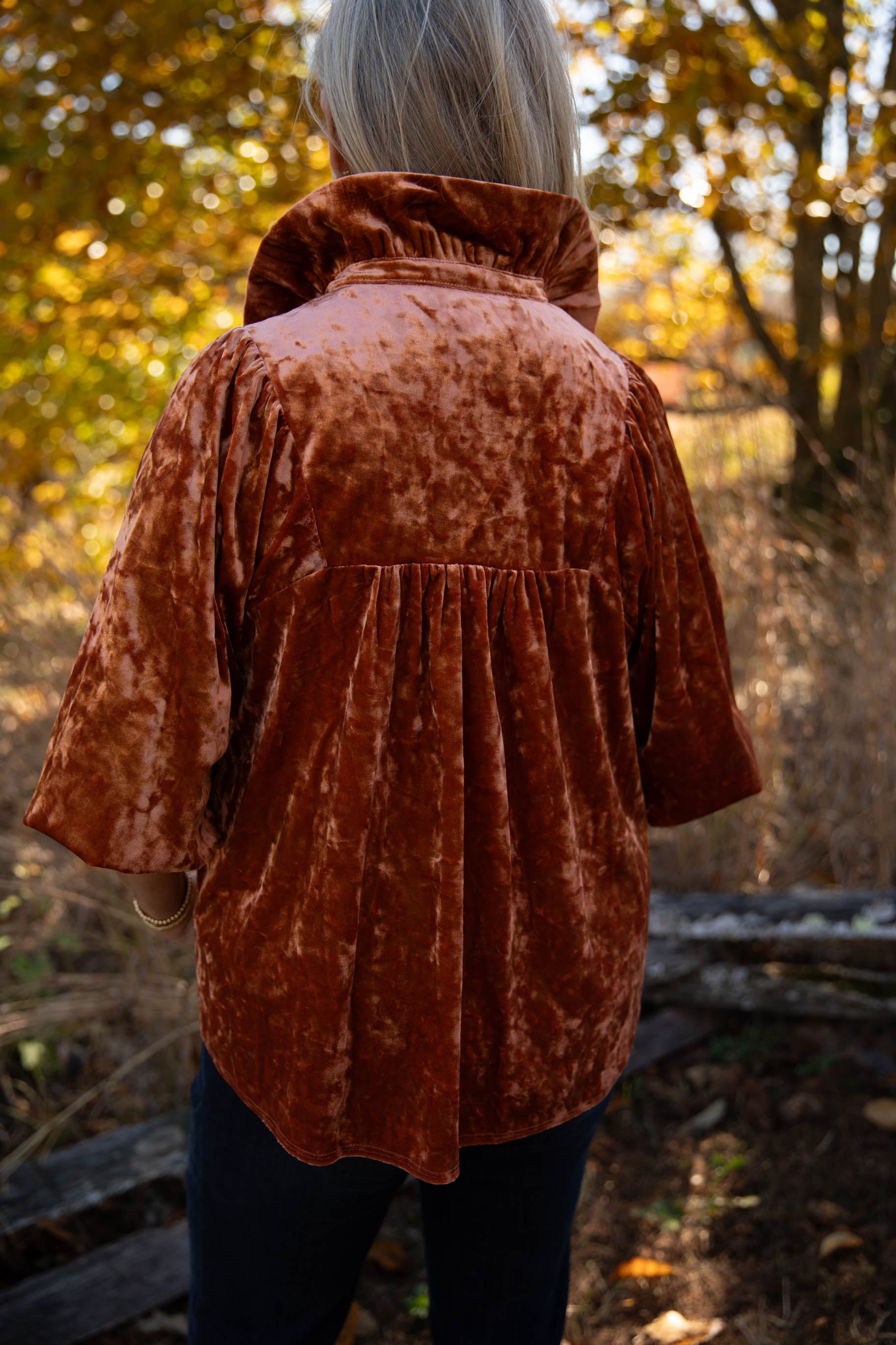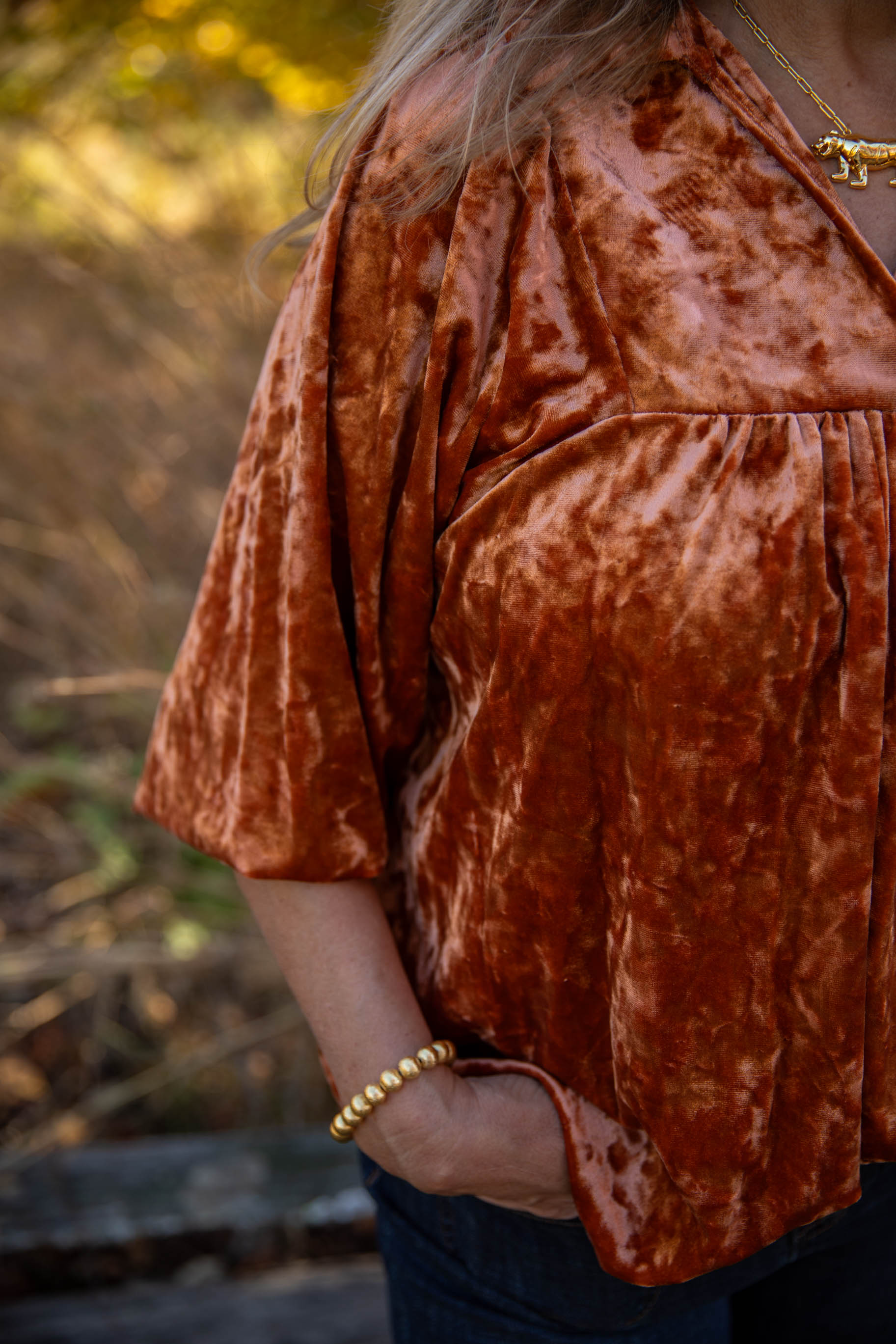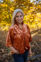 This crushed camel top is perfect for all things Clemson or Holiday! We are loving the puff sleeves and the bold collar. The crossover v-neck creates a flattering and chic look. This gives us all the Holiday feelings with the crushed velvet detailing. Pair with dark denim or black trousers for the perfect look!