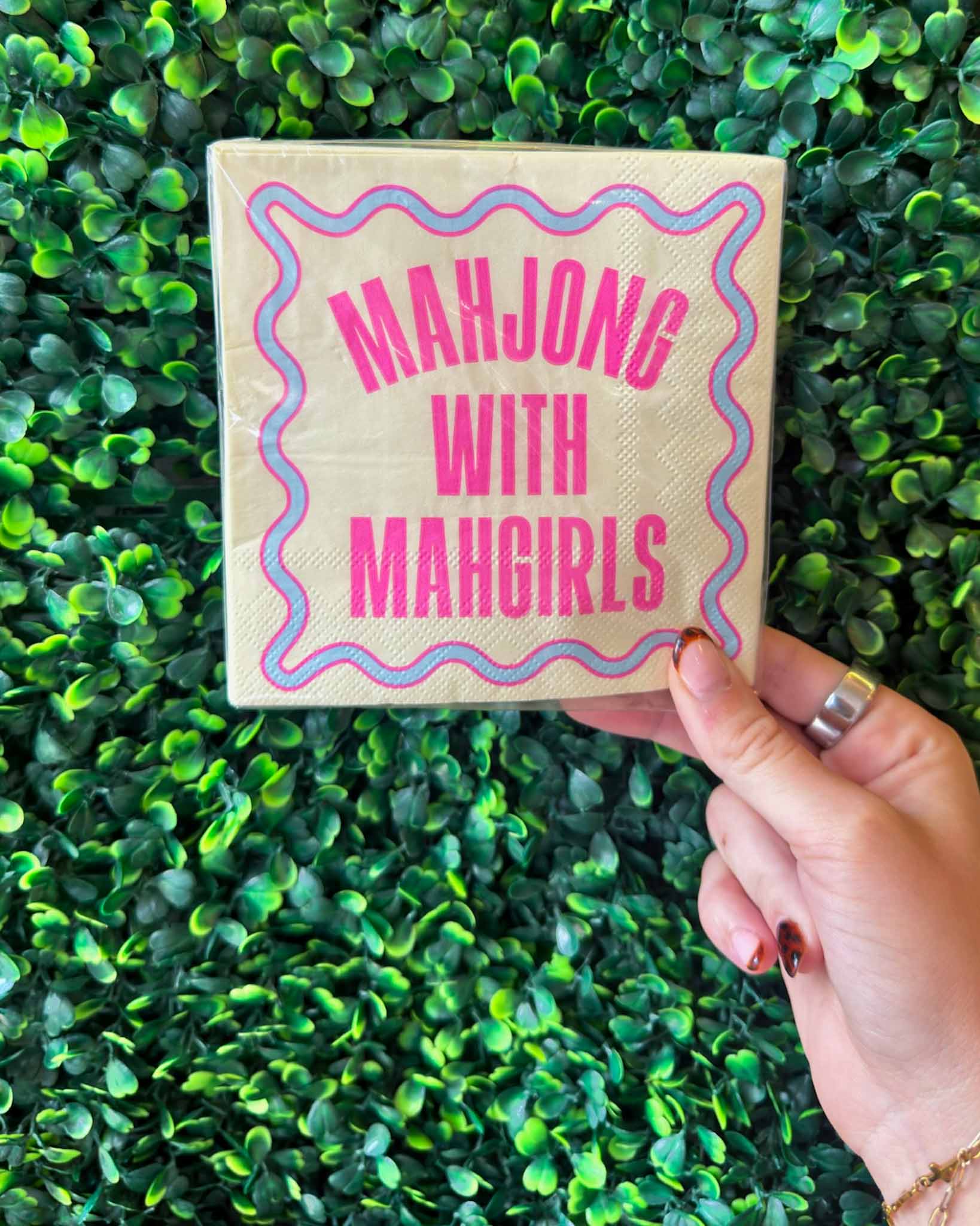 This napkin lets you know exactly what it is made for - "Mahjong With Mahgirls!" These are the perfect hostess gift for mahjong nights with your ladies! Make a statement during your next game night with these pale yellow napkins finished with lavender and hot pink details. Whether it is you or one of your friends who have fallen in love with Mahjong, like we have, these are a must have!