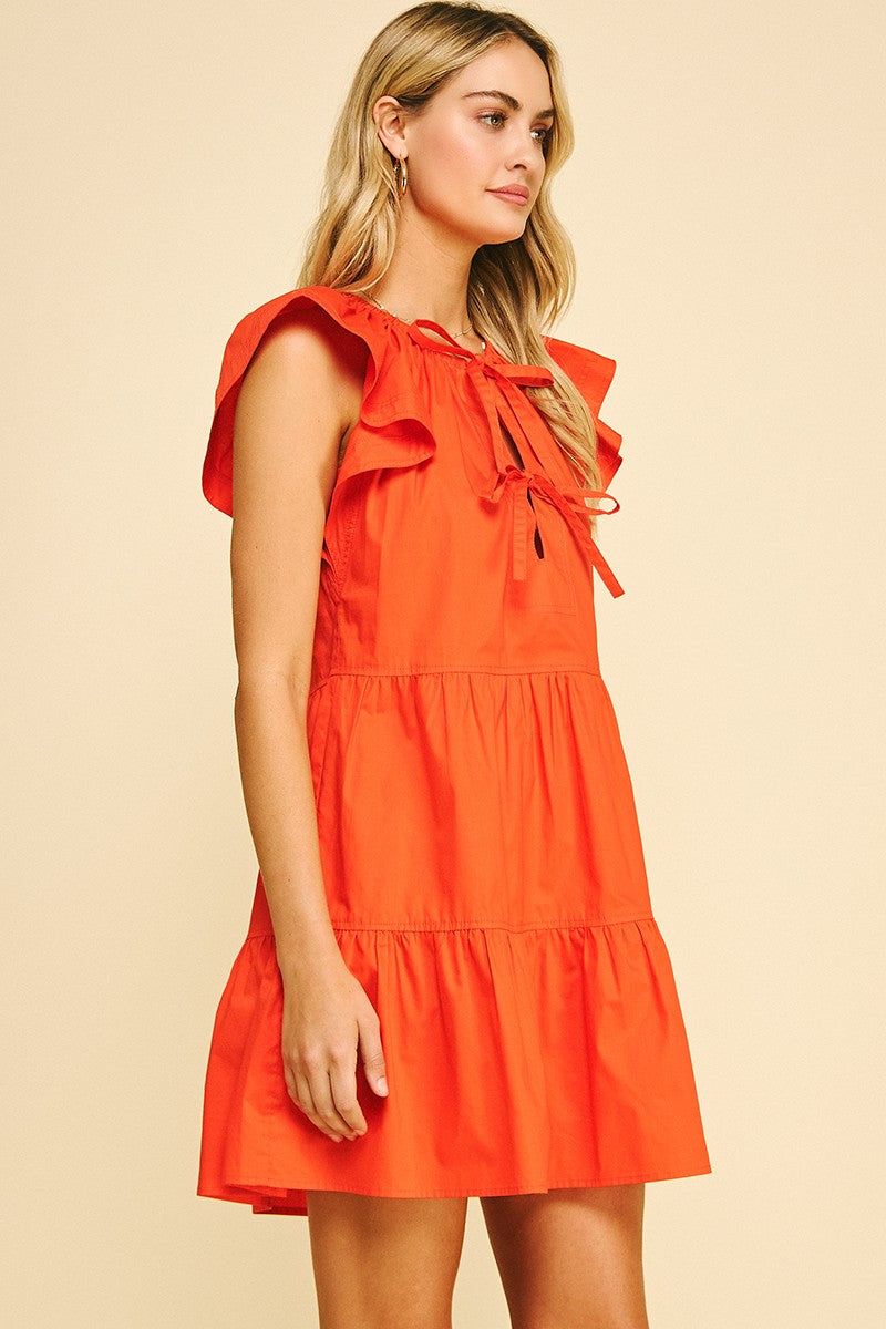This mini dress is a bold blend of charm and comfort. Designed with fluttery ruffle sleeves, a playful keyhole neckline with a tie detail, and a breezy tiered silhouette, it's the kind of dress that instantly lifts your mood. Lightweight and effortless, it’s perfect for sunny strolls, brunch dates, or any moment you want to feel cute and carefree.