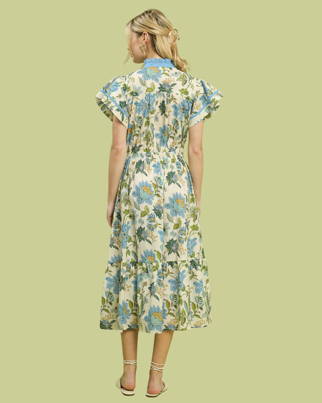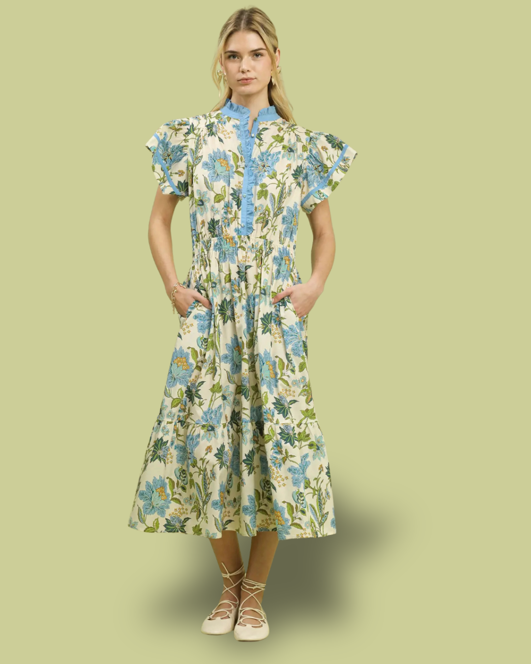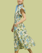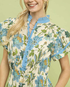 This floral ruffle trim midi dress is the definition of easy elegance. Designed with a flattering smocked waist and a flowing midi-length skirt, it creates a beautiful silhouette while maintaining comfort. The delicate blue floral print pops against an ivory base, while the contrast ruffle trim along the neckline and sleeves adds a charming, elevated touch. Finished with pockets, this dress is perfect for brunch dates, showers, or spring celebrations.