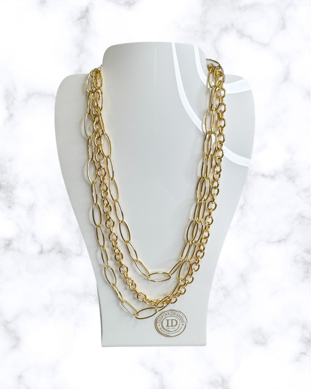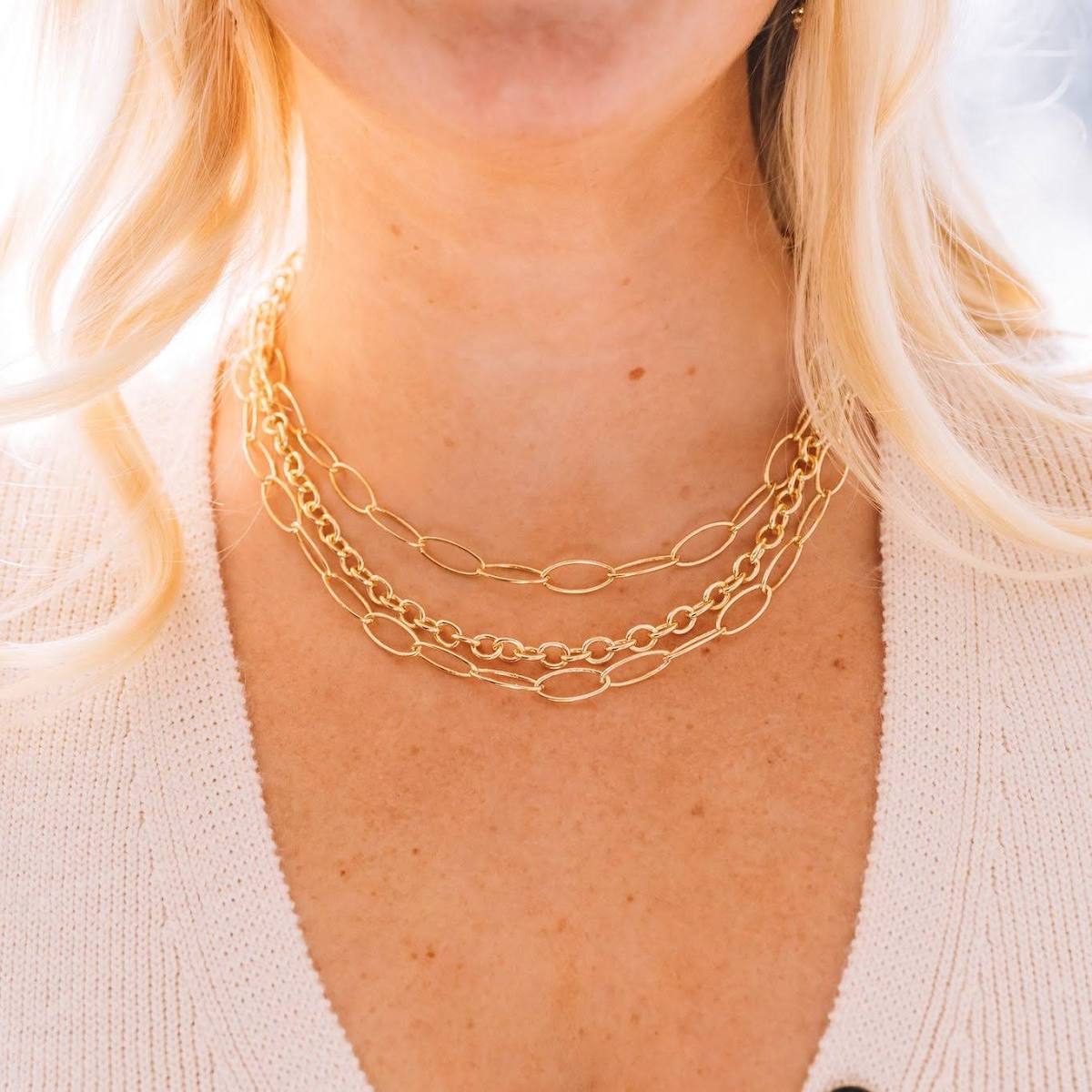 This layered gold-toned chain necklace brings effortless sophistication to any look. Featuring multiple strands of elongated and rounded links, it creates beautiful movement and dimension while maintaining a clean, modern feel. The mix of chain styles adds visual interest without overwhelming, making it an easy statement piece.