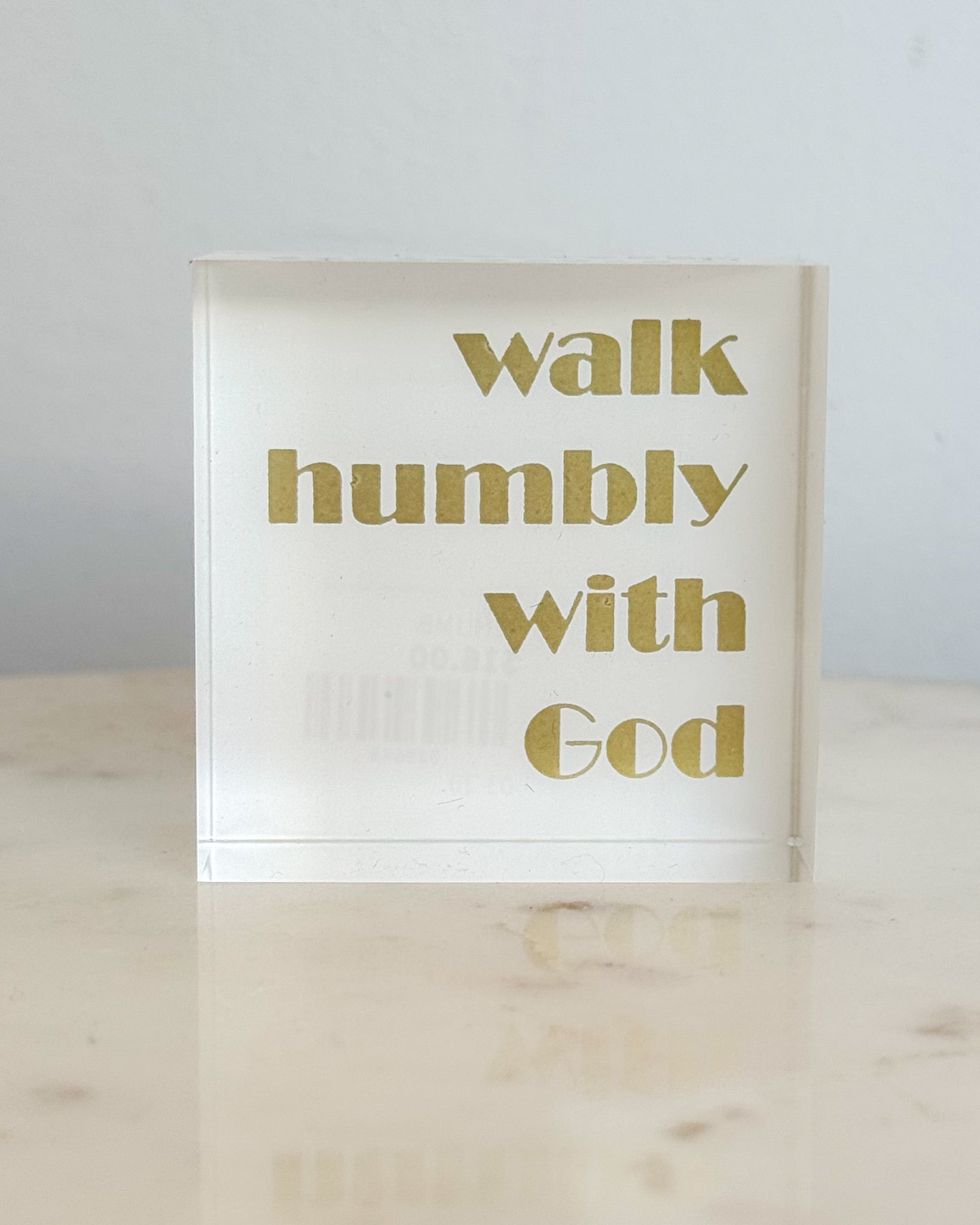 Designed with intentional white space for the eye to see the words but your heart to hear them. Every design is created with purpose and prayer. Each step of each piece is made with quality and care…all by hand and from the heart. Add a touch of worship to your desk with the “Walk Humbly With God” acrylic block.