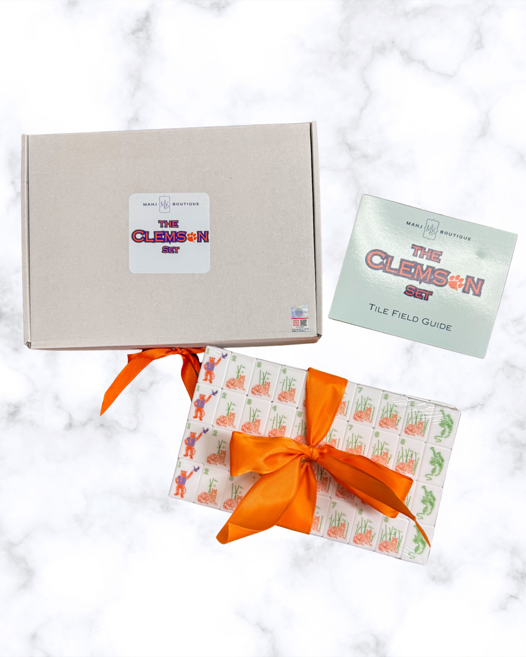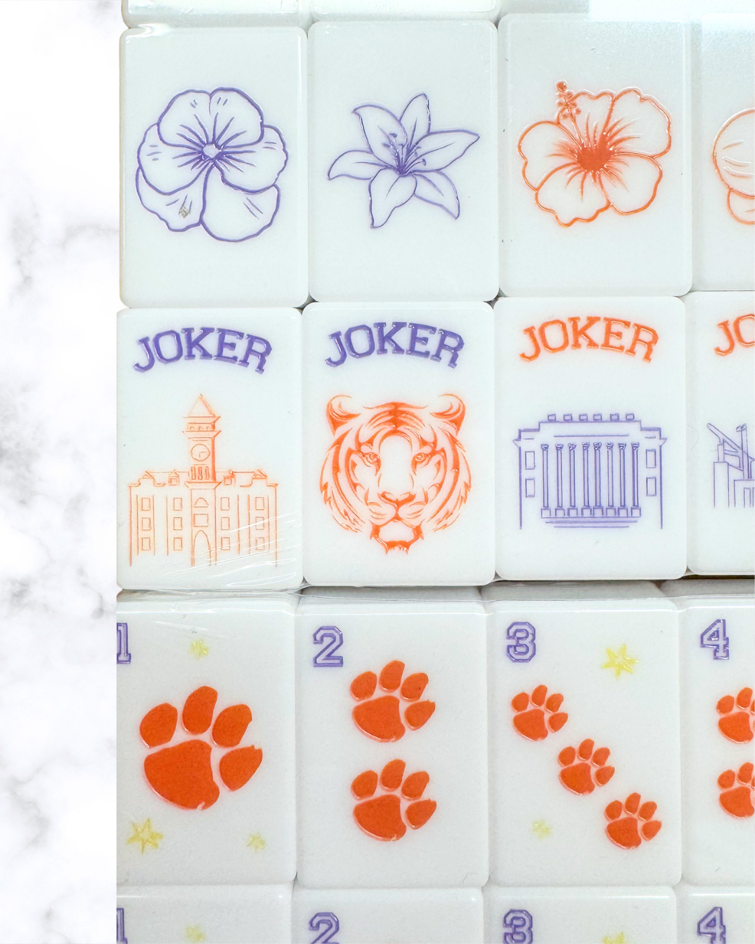 Blend school spirit with your favorite game. This fun mix of classic mahjong and touches of spirit comes together in this luxury set. Engraved and hand painted tiles are perfect to bring to your next mahjong event. Whether you are an alumni, fan, or just someone who loves Clemson and mahjong - These are for you!