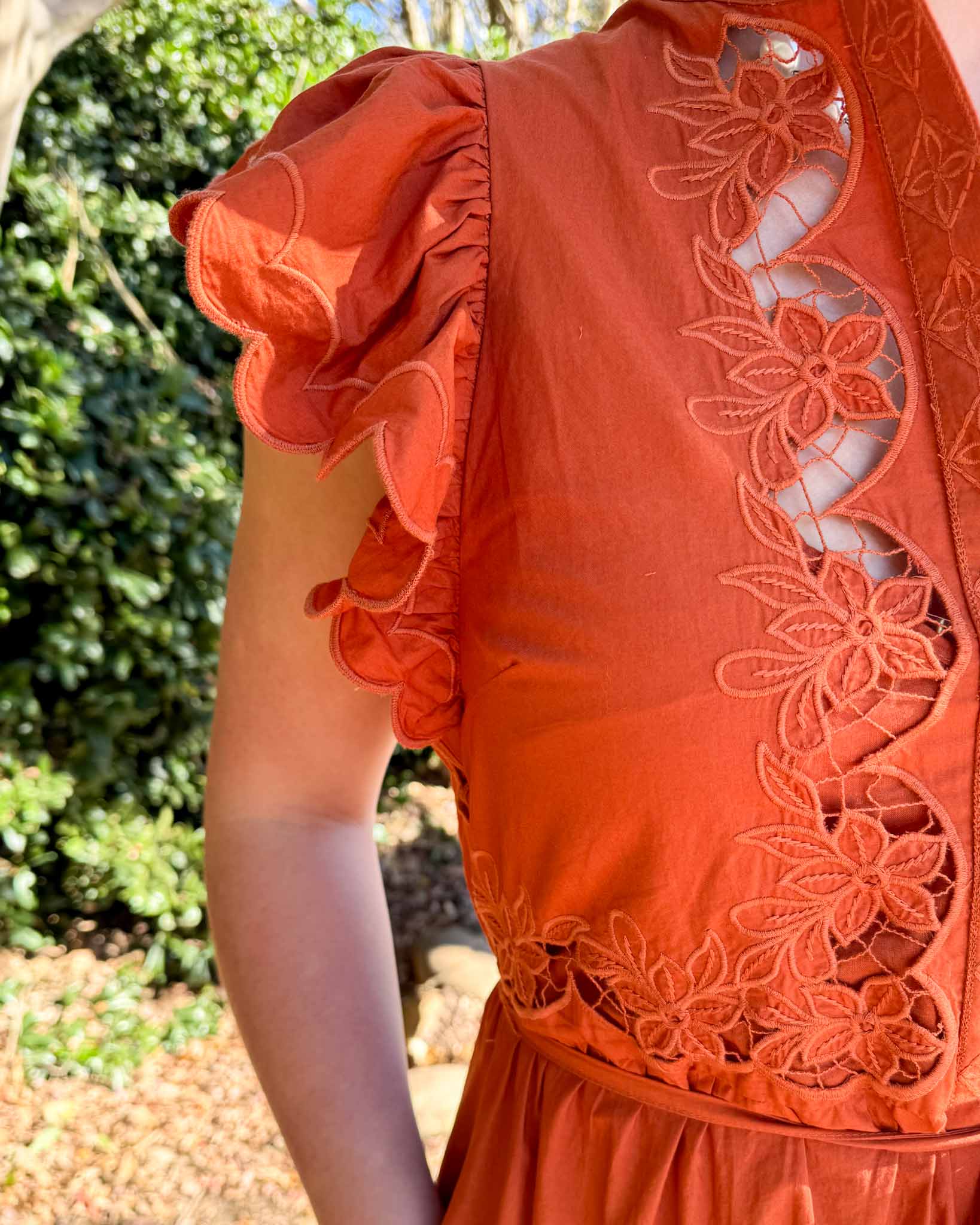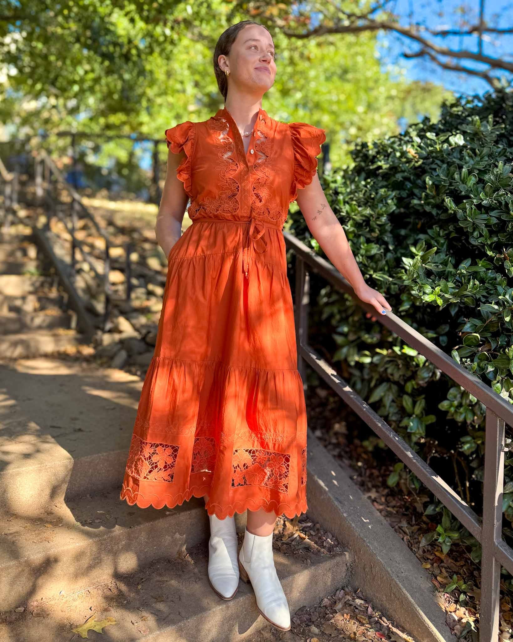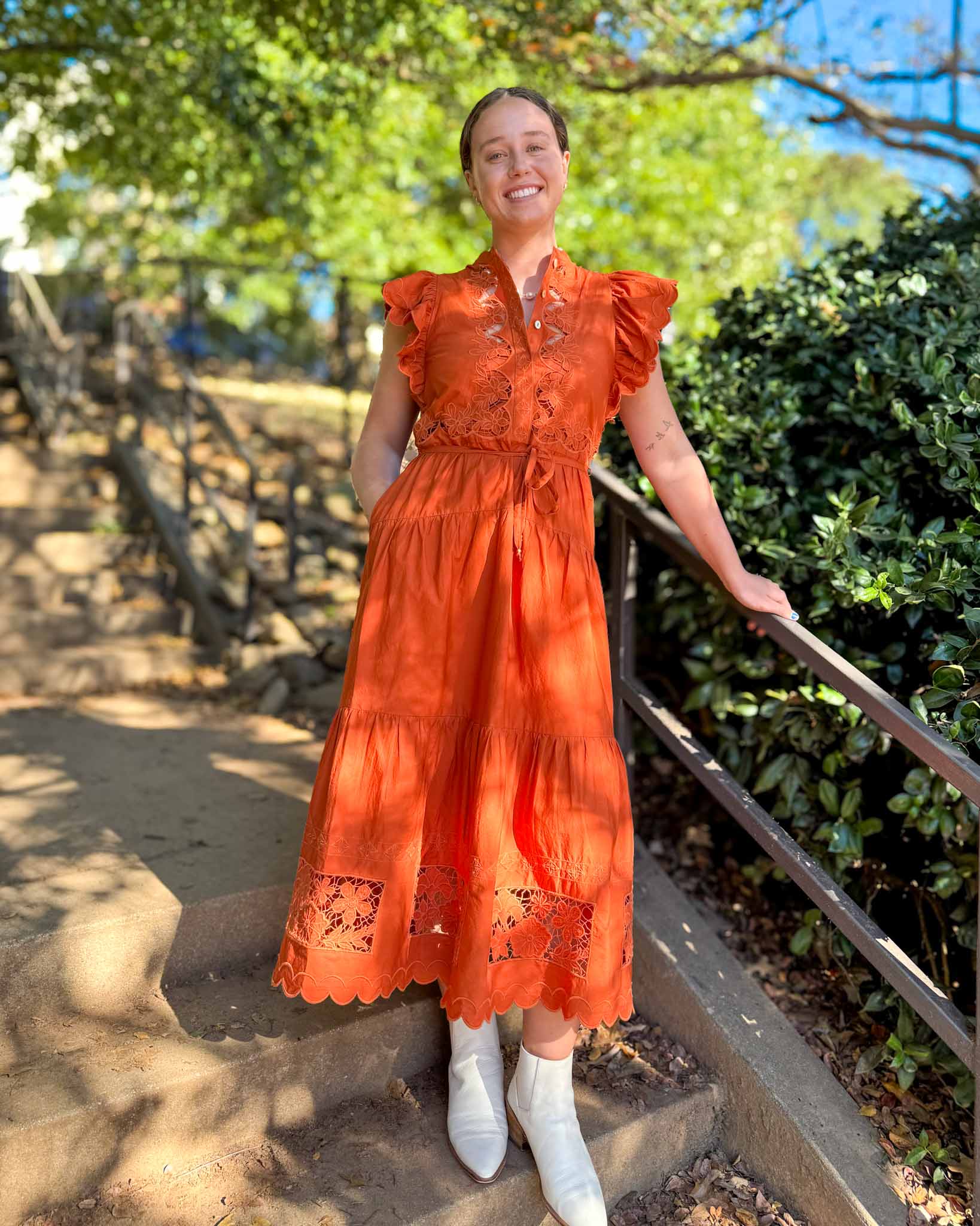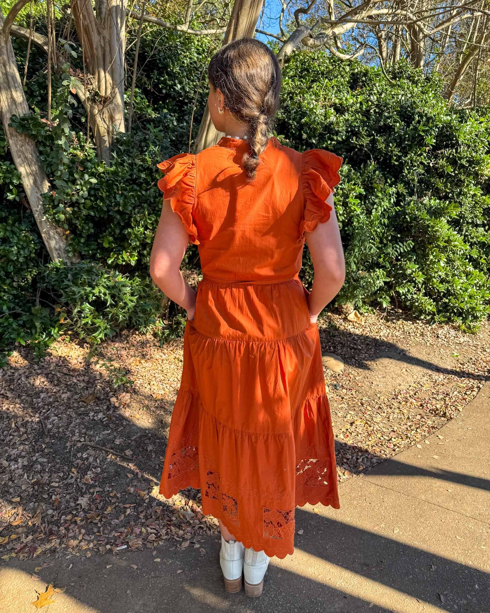 Be effortlessly chic in our Romy dress! From the beautiful, breezy midi length with flutter sleeves, lace insets, and a flattering self-tie waist— effortlessly feminine and timeless. This is perfect for dressing up or down - We imagine this being perfect for any Clemson event!