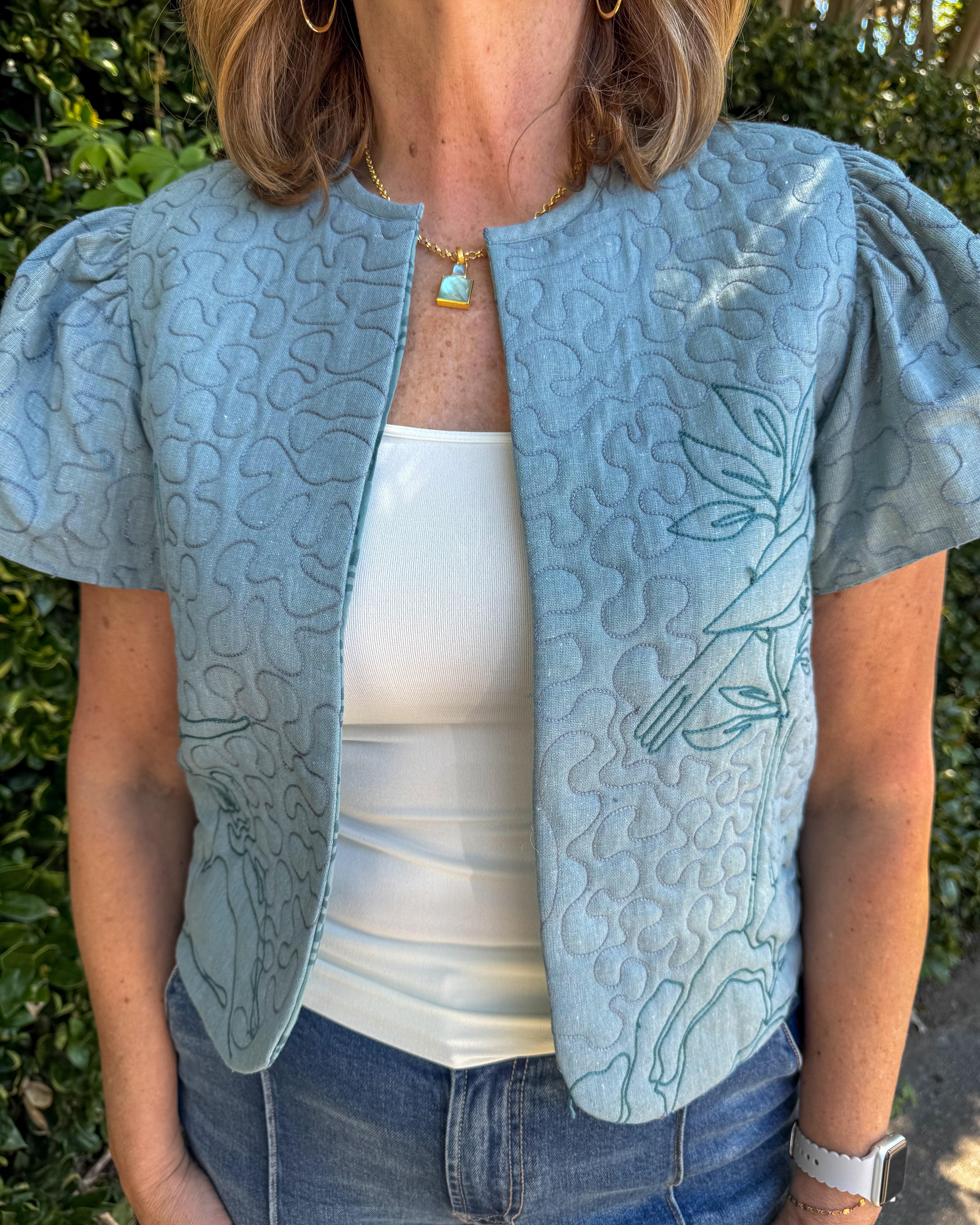 A unique and elevated layering piece featuring a soft sage quilted fabric with intricate embroidered bird and botanical detailing. Designed with a structured, open-front silhouette and subtle puff sleeves, this top blends artisanal craftsmanship with a modern, wearable shape. The textured quilting adds dimension, while the tonal stitching keeps the look refined and versatile. This is perfect for layering over dresses or pairing with high-waisted bottoms, this piece brings a one-of-a-kind, heirloom inspired feel to any outfit.