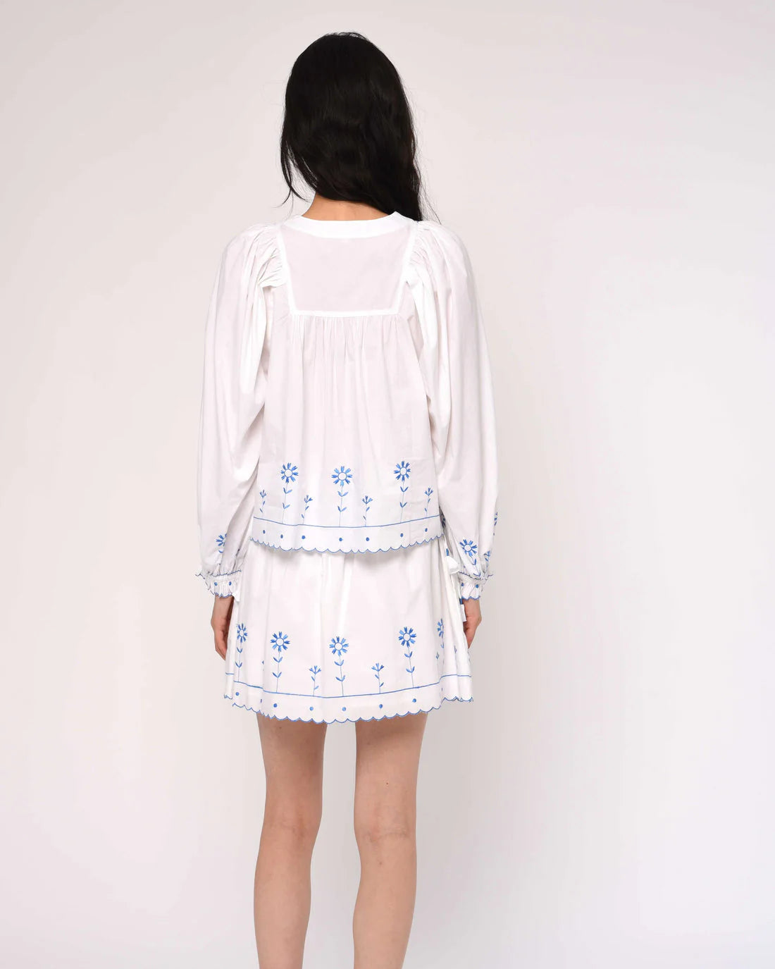 This lightweight and elegant top is giving us all of the vacation vibes! Love the Label's beloved Junie Top features delicate light blue floral embroidery, offered in crisp bright white classic cotton poplin. The embroidery adorns the center-front yoke, hem, sleeves, and above the cuffs. Gathers from the yoke into the sleeves, it creates full balloon sleeves with easy encased elastic at the openings, and a self-tie bow at the neckline.