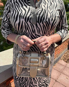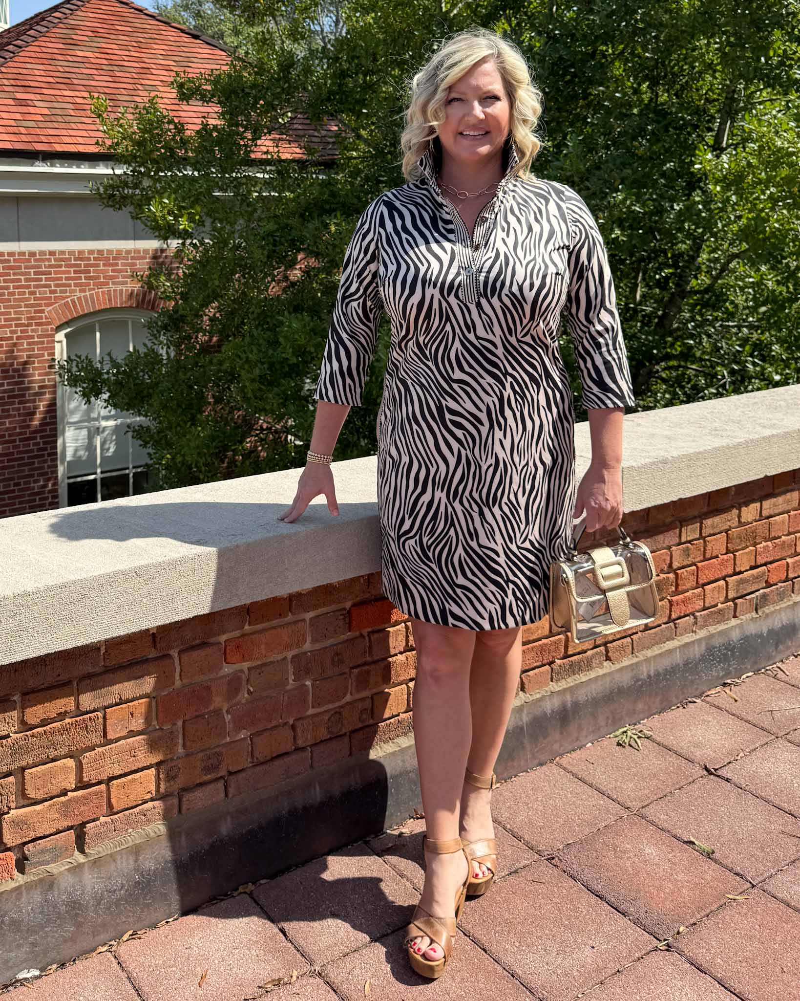 A classic silhouette with fierce flair! This Gretchen Scott tiger-print dress brings sophistication and bold style together in one effortless piece. The tailored collar and 3/4 sleeves balance the playful print, while the figure-flattering cut makes it easy to wear from game day gatherings to dinner downtown. Lightweight, comfortable, and chic—this dress is a statement-maker you’ll reach for again and again. Pair with wedges or strappy heels to complete the look.