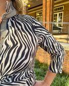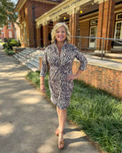 Effortless elegance with a bold twist! This Gretchen Scott shirtdress features a striking tiger print that makes a statement while keeping things sophisticated. Designed with flattering cinched front detail and gold button accents, it’s both chic and comfortable. The collared neckline and 3/4 sleeves add a touch of tailored polish, making it perfect for game day, work events, or dinner downtown. Pair it with wedges or heels for a look that’s as confident as it is stylish.