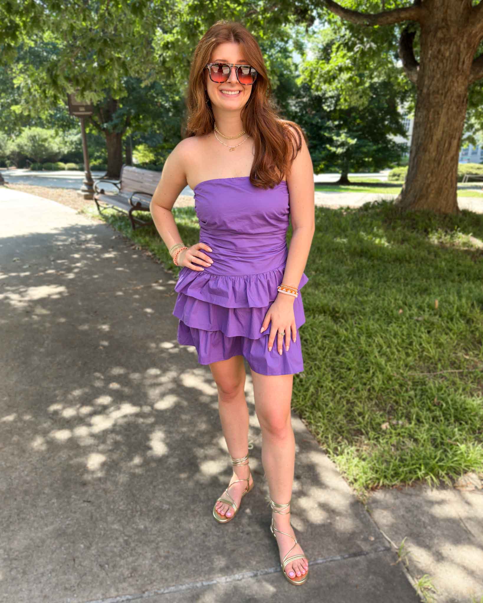 This strapless purple dress is a bold and spirited choice for cheering on the Tigers! With its bubble hem and sleek fit, it’s equal parts playful and polished—perfect for tailgates, touchdowns, and everything in between. Just add boots and your favorite accessories for the ultimate Clemson game day look.