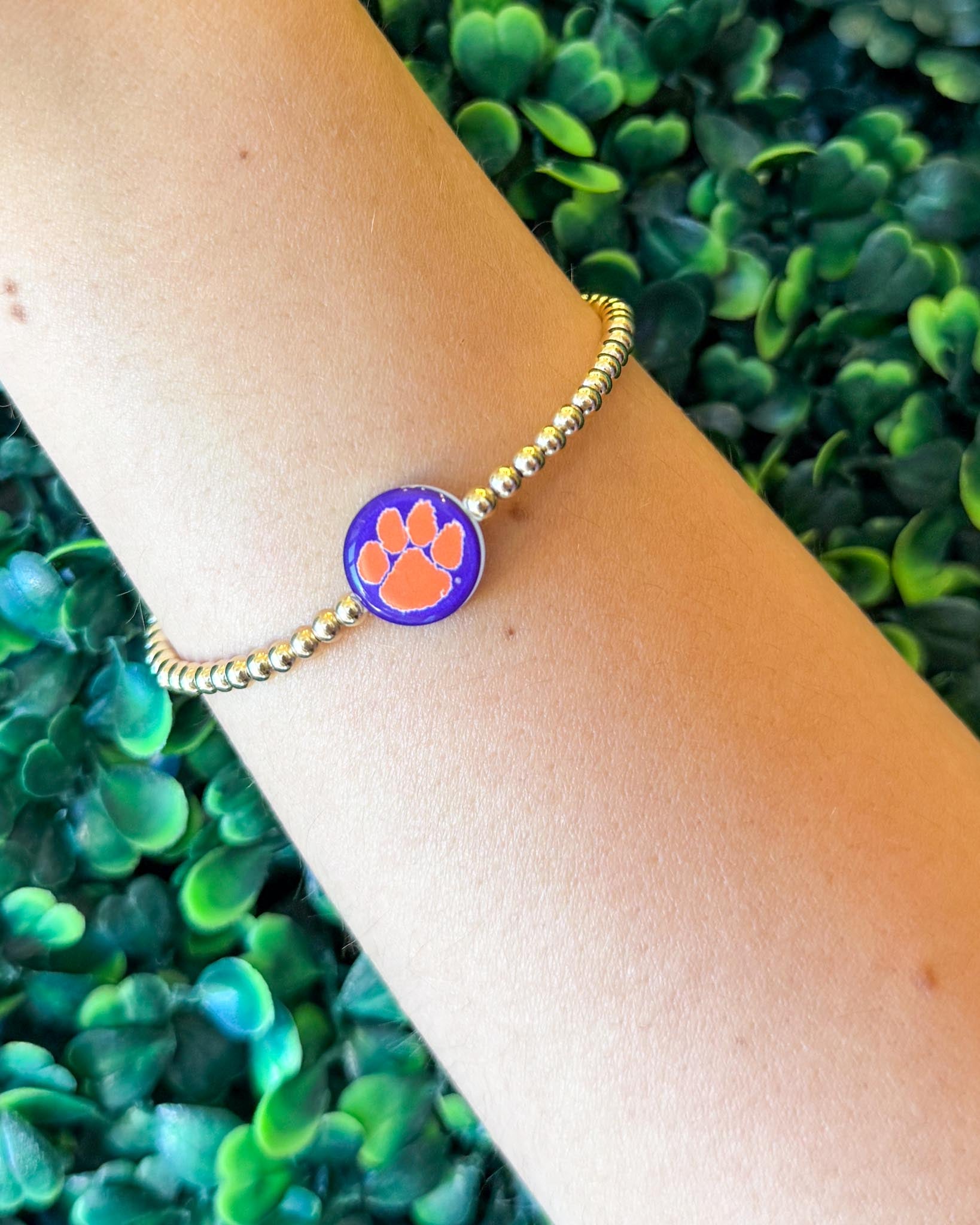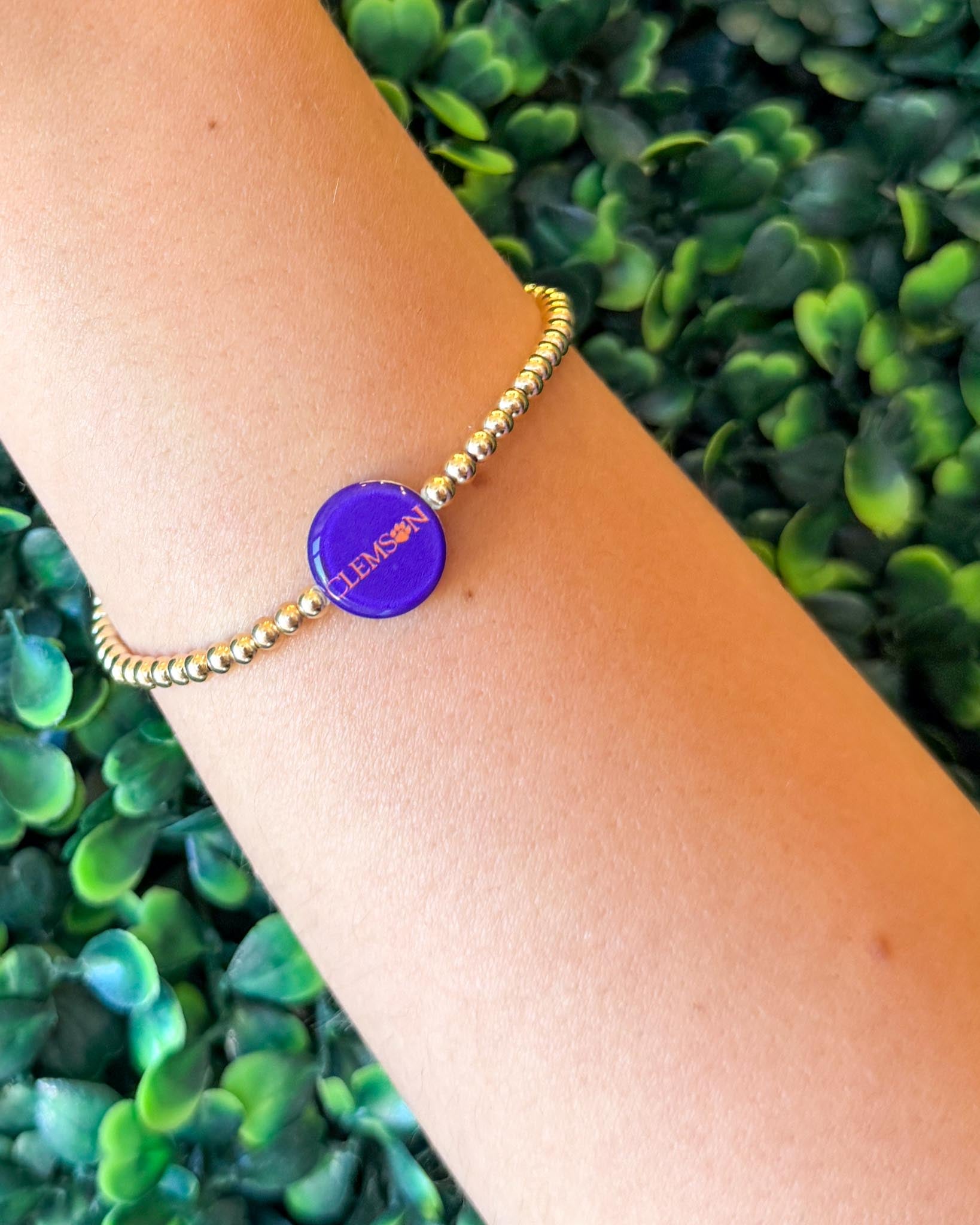Two looks, one bracelet! This 14K gold-filled beaded beauty is the ultimate game day accessory with a reversible charm—featuring the classic Clemson script on one side and the bold Tiger paw on the other. Effortlessly flip it to match your mood or outfit while repping your team in style. A must-have for every Clemson fan who loves versatility with a touch of glam