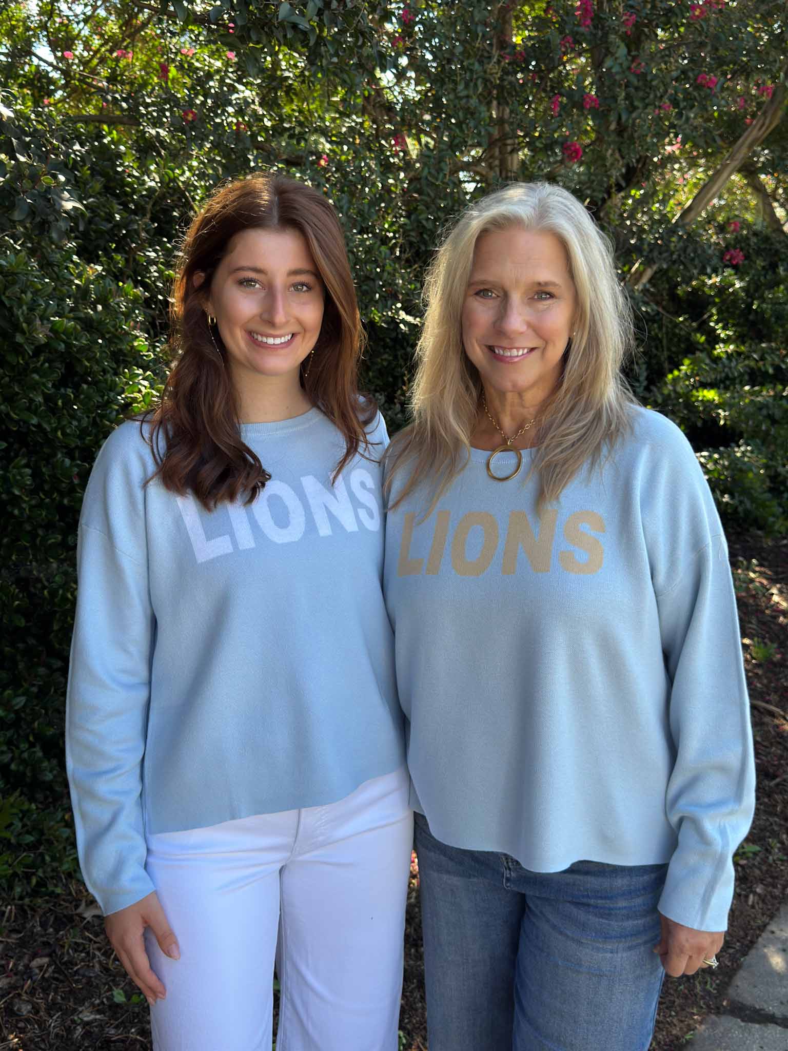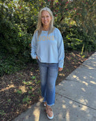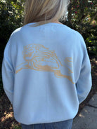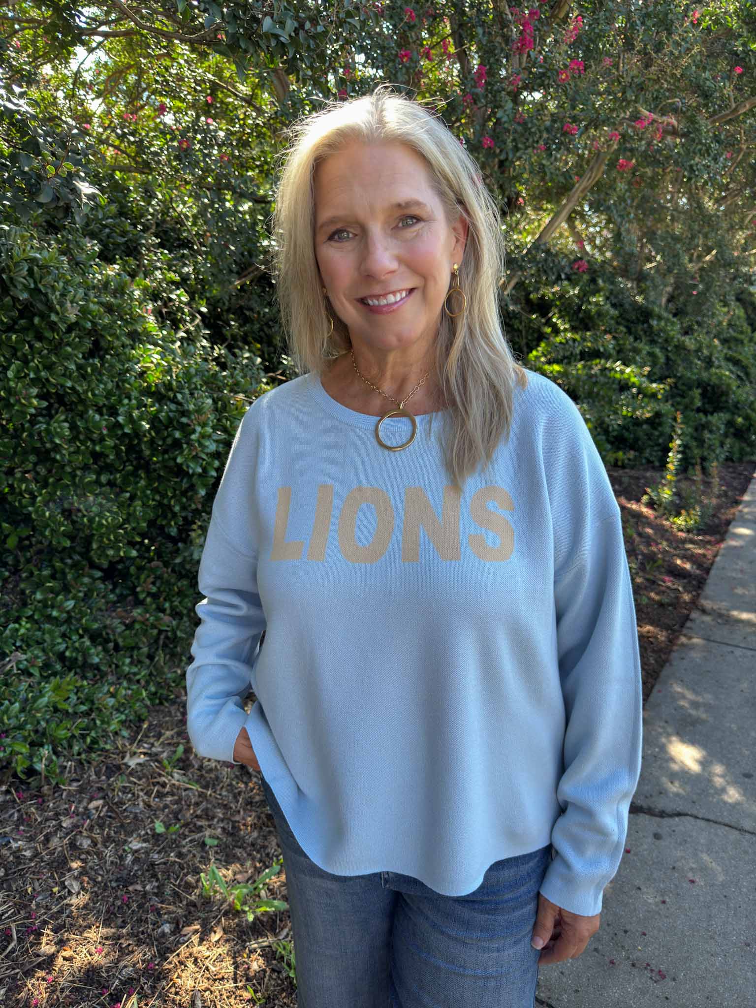 Show off your Daniel High School pride with this soft, light blue sweater featuring bold gold “LIONS” lettering across the front. The relaxed fit and drop-shoulder style make it perfect for layering on cool game days or wearing casually around town. A chic and spirited way to represent your team!