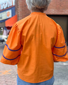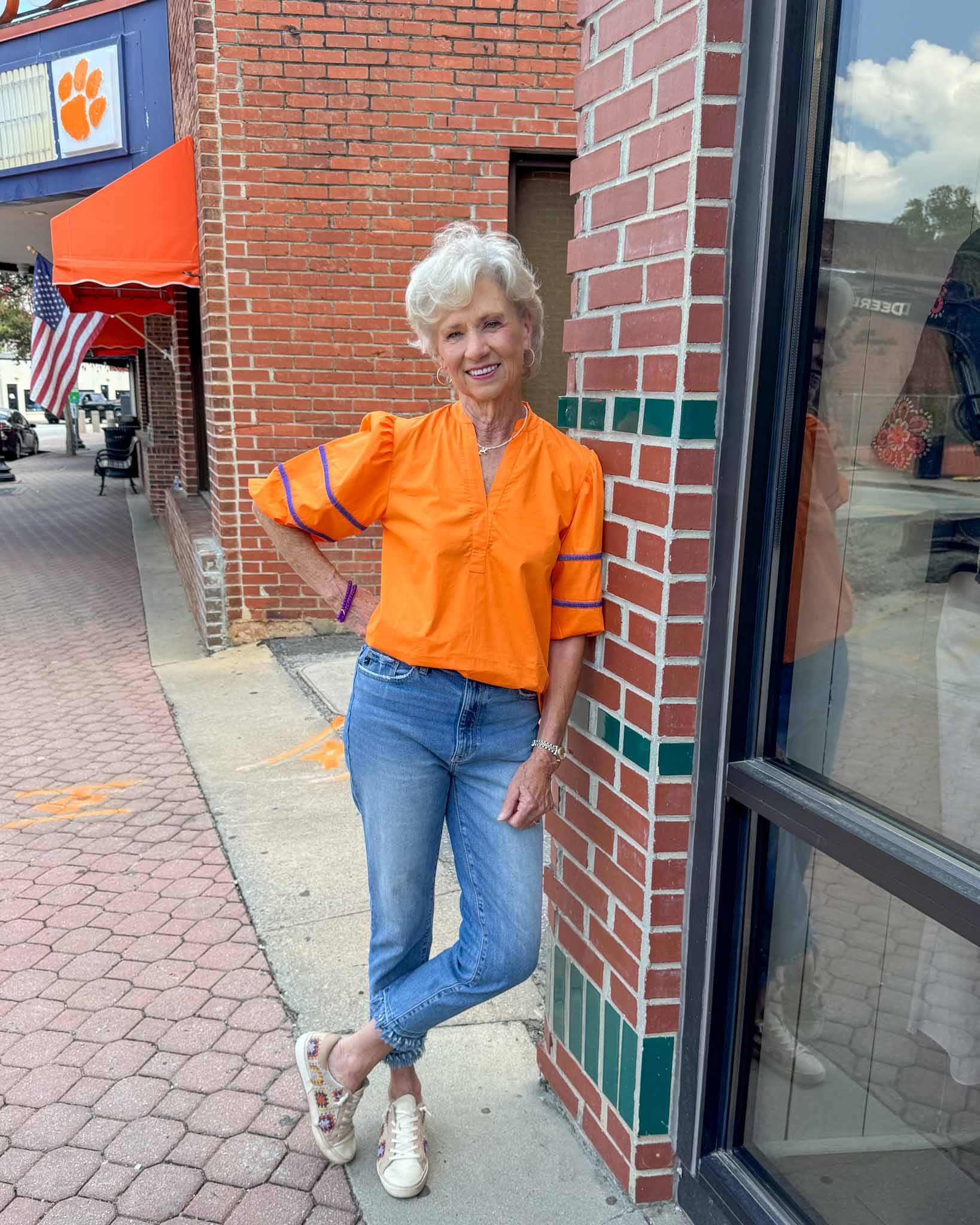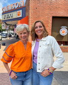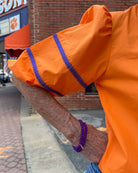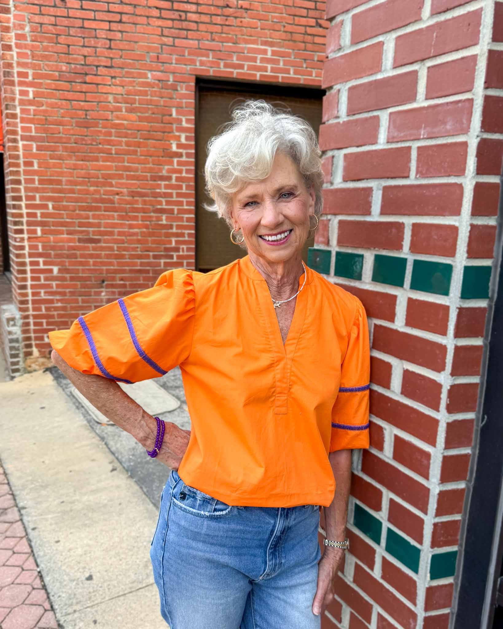 Calling all puff sleeve lovers - this one is for you! This adorable Orange puff sleeve top features purple embroidery on the sleeves, makes it the perfect Clemson piece! This will transition beautifully into the Clemson fall. We imagine this paired with white denim in the warmer months, and darker denim in the cooler months!