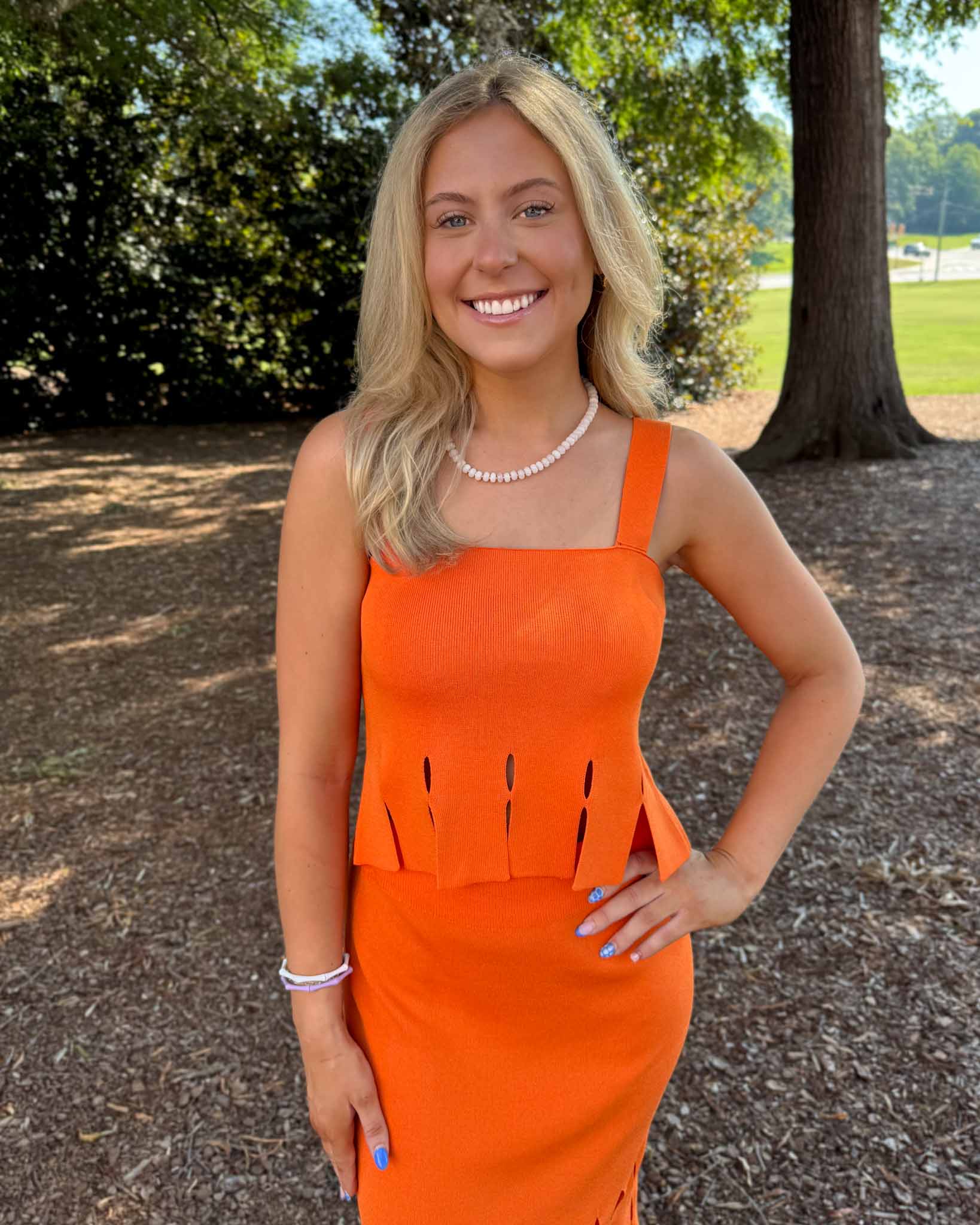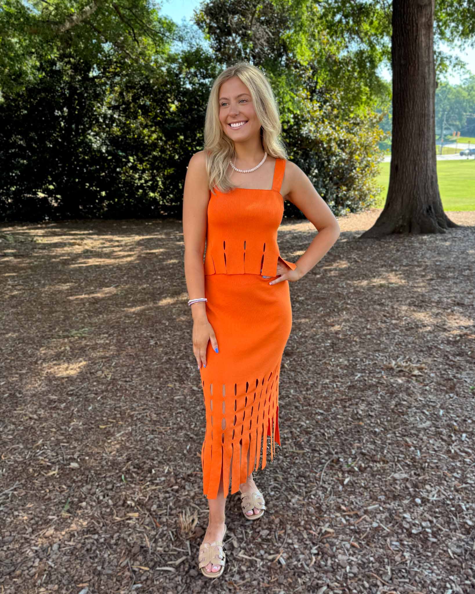 Bring the heat in this bold and bright fringe knit tank! Featuring a sleek square neckline and eye-catching vertical cutouts at the hem, this form-fitting top adds just the right amount of edge to your game day or summer look. The soft ribbed texture gives it a comfy stretch, while the structured silhouette keeps things polished and flattering. Pair it with the matching skirt or rock it with denim for a pop of orange you’ll love all season.