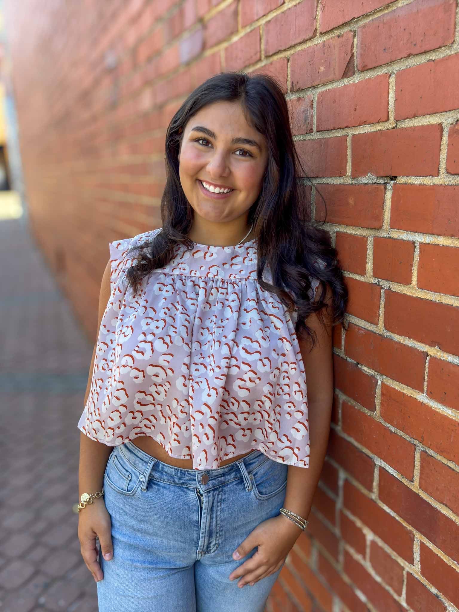 This lightweight blouse features a soft ivory base with a subtle orange abstract print that gives it a modern, spirited touch. The gathered neckline and flowy fit make it both flattering and comfortable, easy to pair with denim or a skirt for a casual yet chic look. Whether you’re tailgating, strolling campus, or enjoying a weekend out, this top brings effortless style with a hint of Tiger pride.