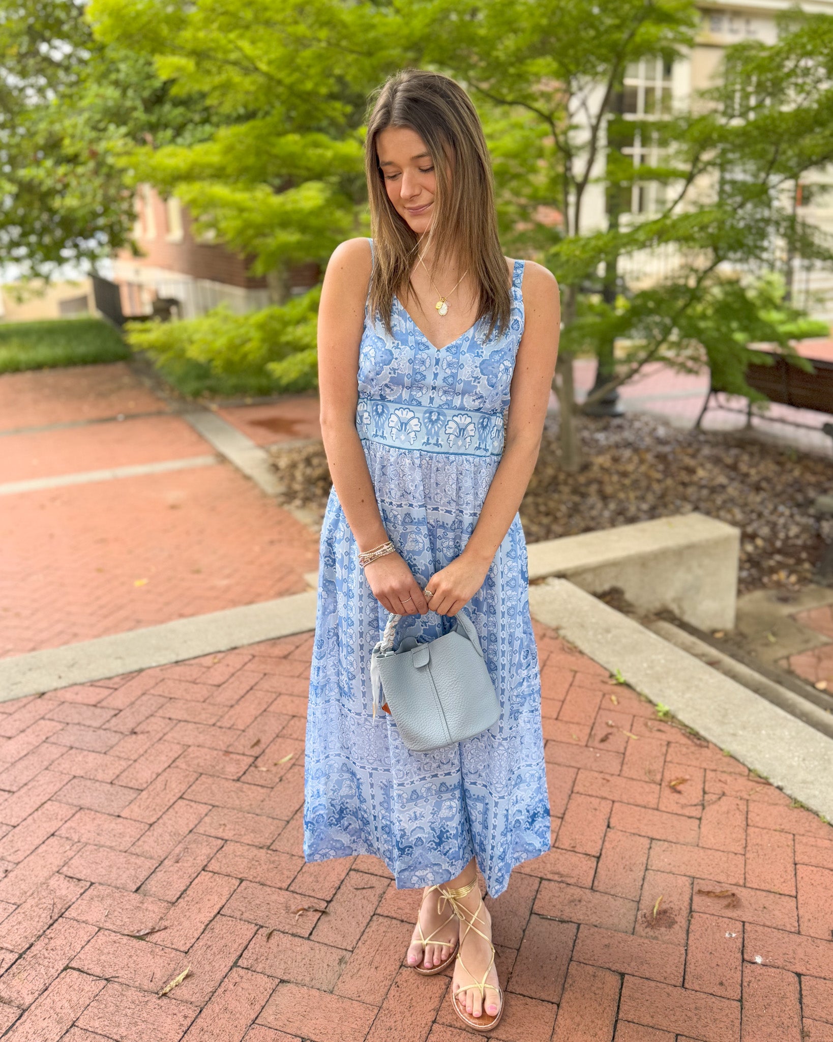 Channeling soft summer skies in this dreamy blue and white Gretchen Scott dress With its delicate print, flattering empire waist, and breezy silhouette, it’s the perfect pick for garden parties, brunch dates, or strolling cobblestone streets. Just add sunshine and sandals!
