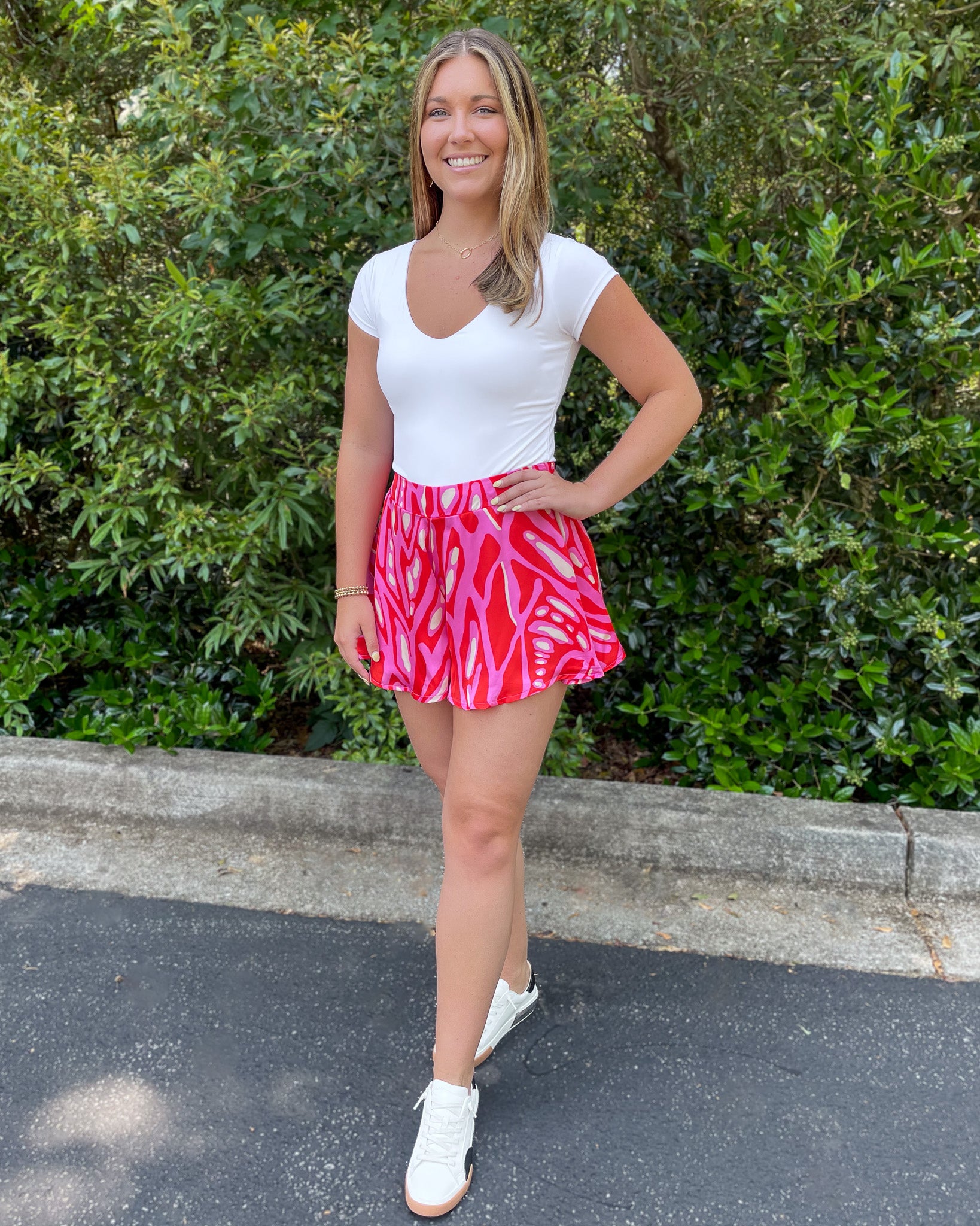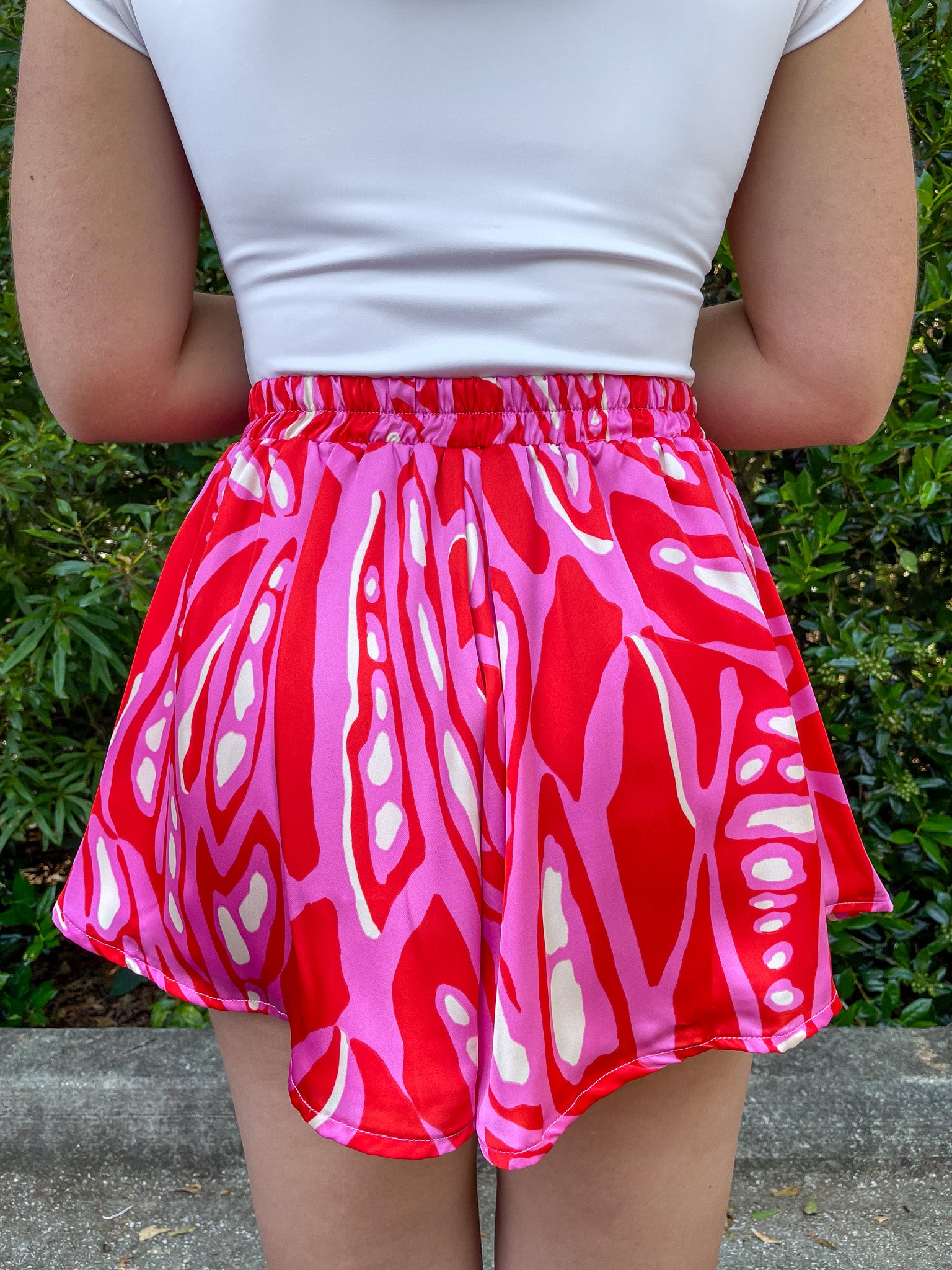 The perfect print of pink, orange and white in a sassy short that's perfect for game days! The satin finish creates a flattering and comfortable fit sure to keep you cool!