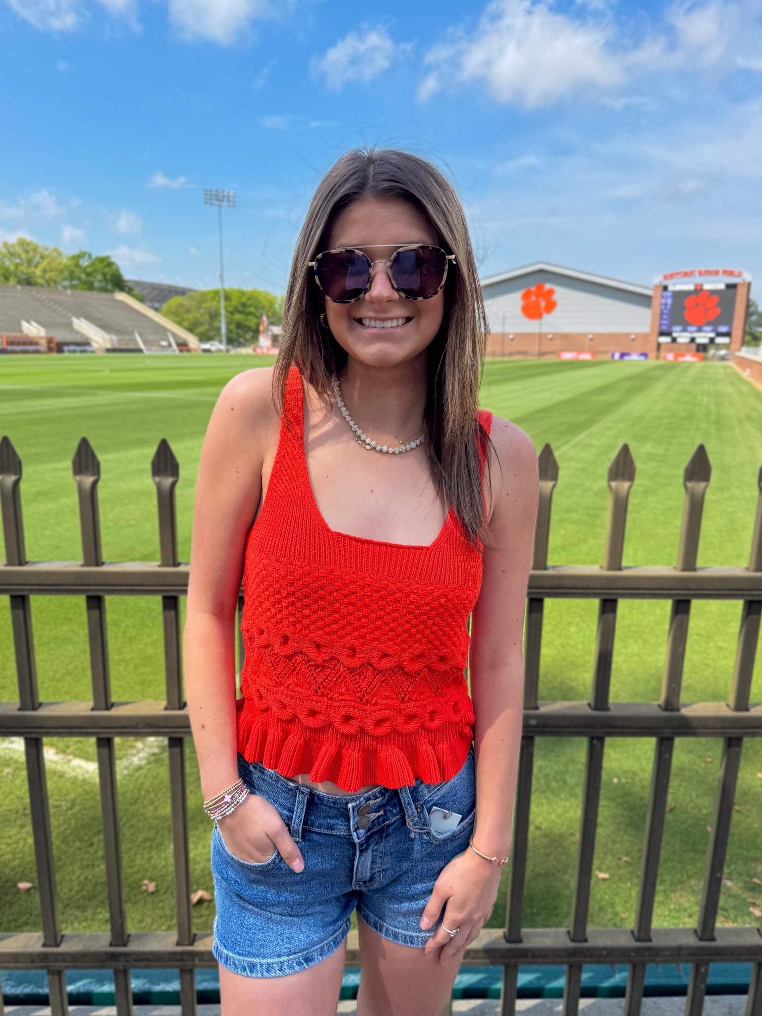 This top has us dreaming of Summer! The elegant crocheted detailing and fun neckline on this top creates an elevated feel. We are loving how this pairs with shorts for a daytime look, and create a more elegant feel by pairing this top with white jeans!