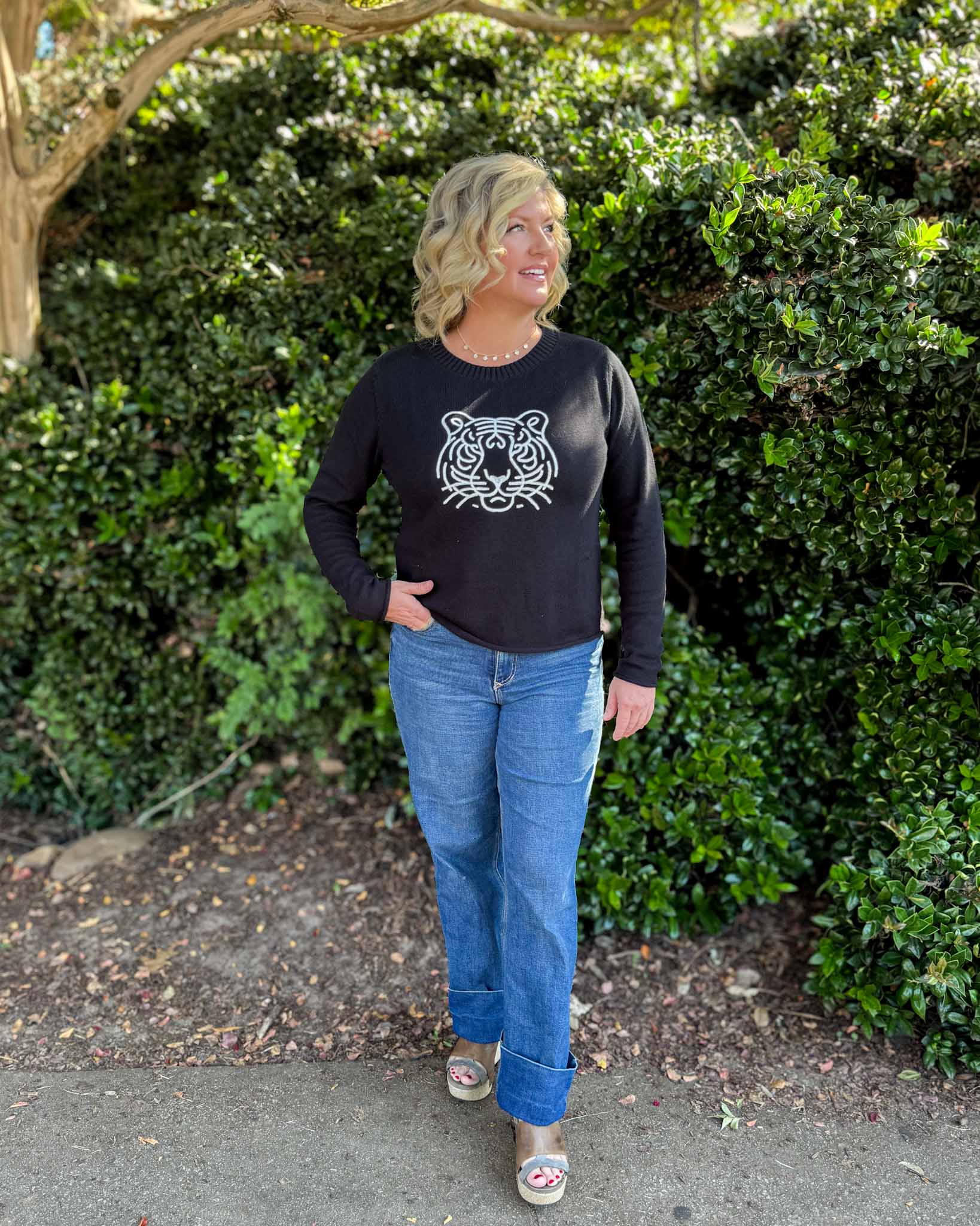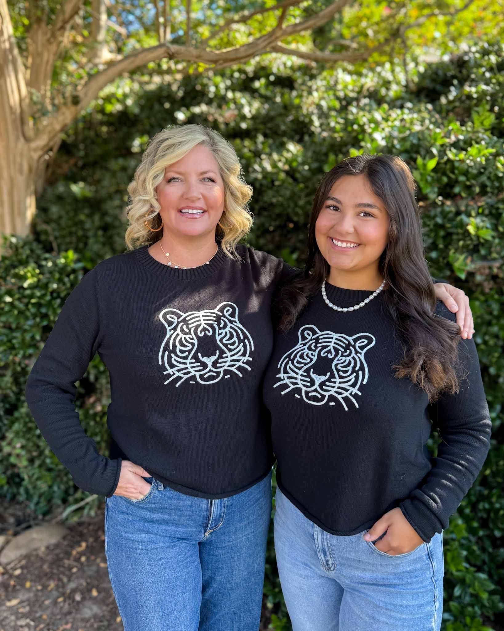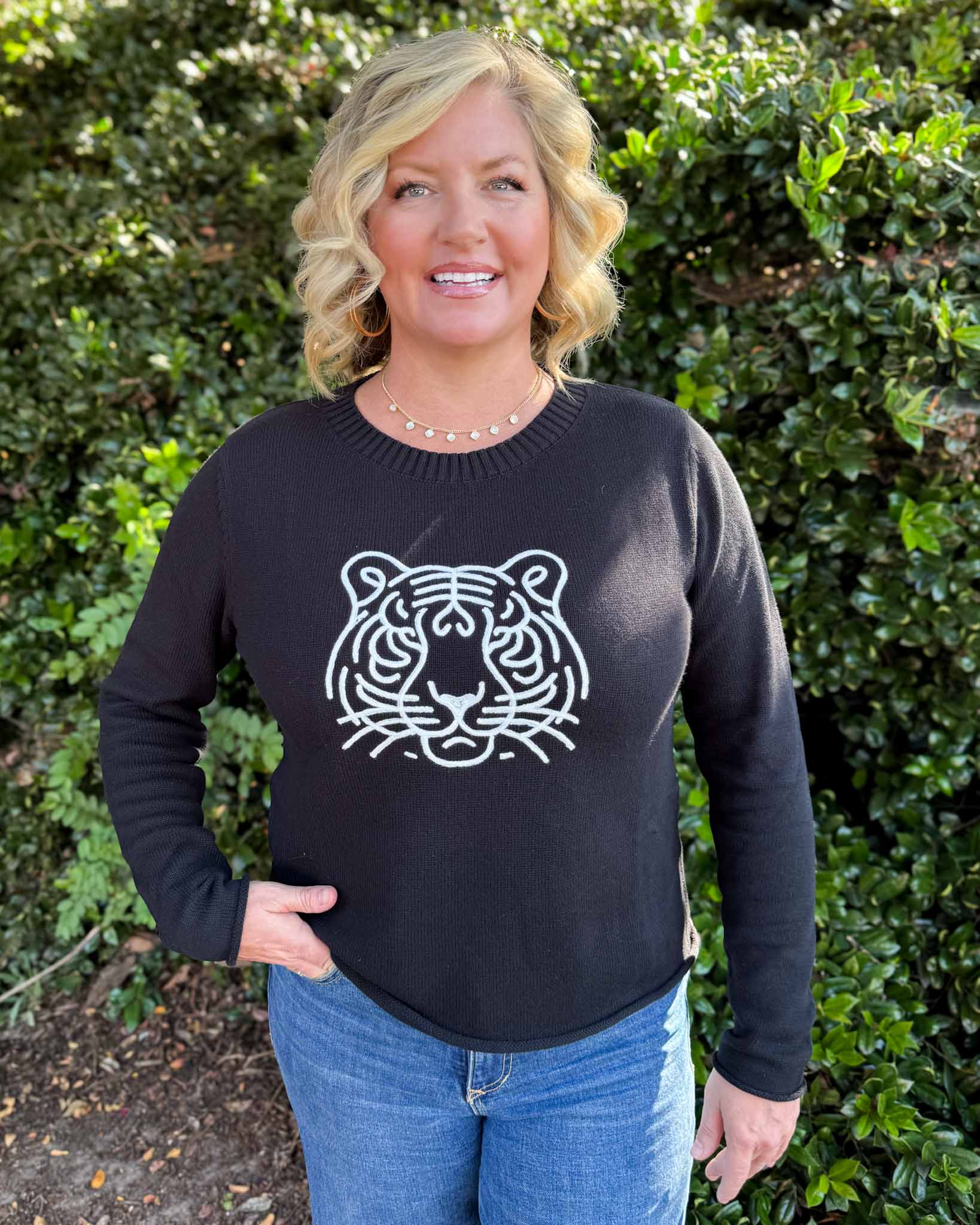 This black knit sweater features a striking white tiger face graphic front and center giving you the perfect mix of cozy comfort and spirited edge. With its relaxed fit and timeless crewneck design, it’s easy to dress up with tailored pants or keep casual with denim. A versatile piece you’ll reach for on game days and beyond, this sweater proves that Tiger pride never goes out of style.