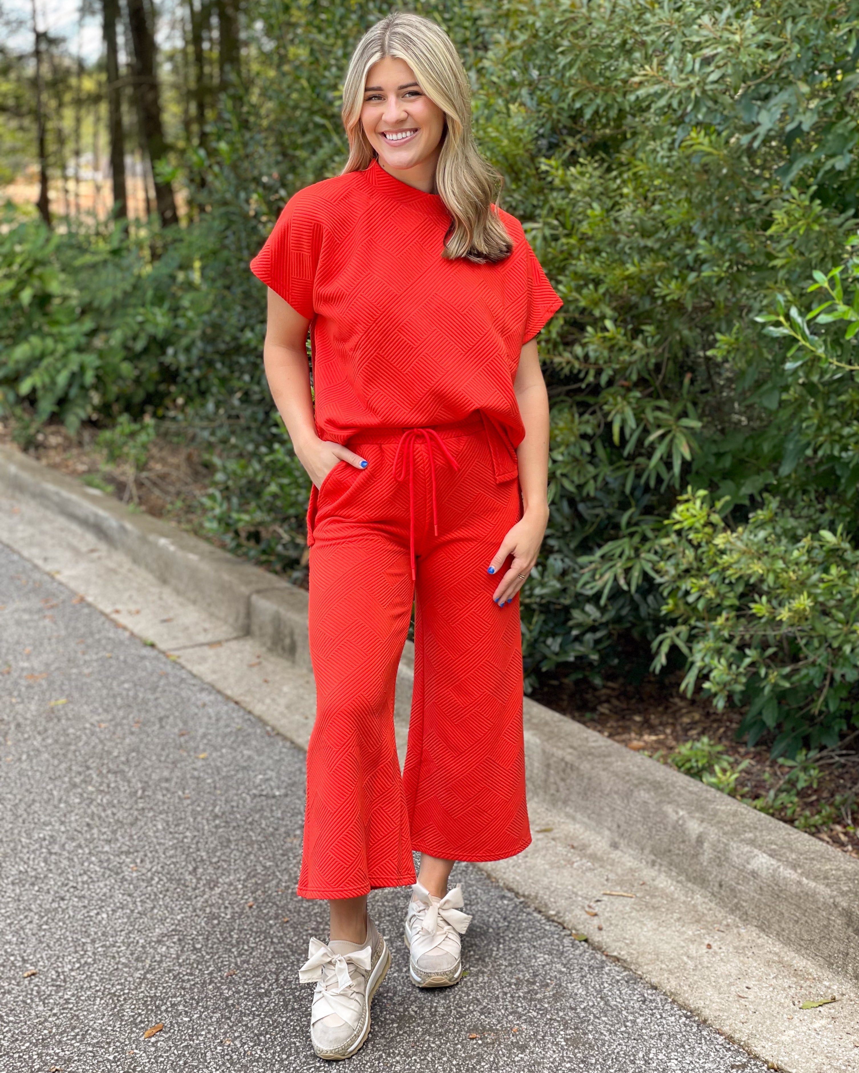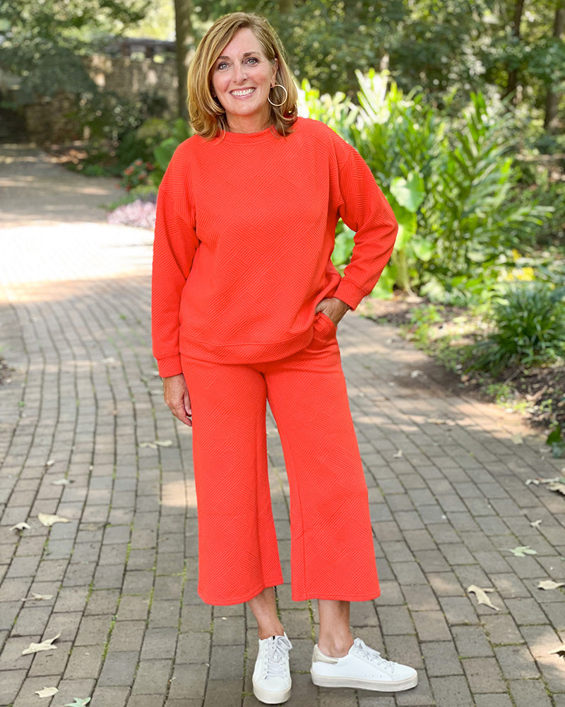 Your "game day from home" wardrobe will be complete with these adorable Textured Cropped Pants paired with the Textured Drop Shoulder Top or Textured Sweatshirt. So cozy and great for giving that cute athleisure look, you'll want to live in these.