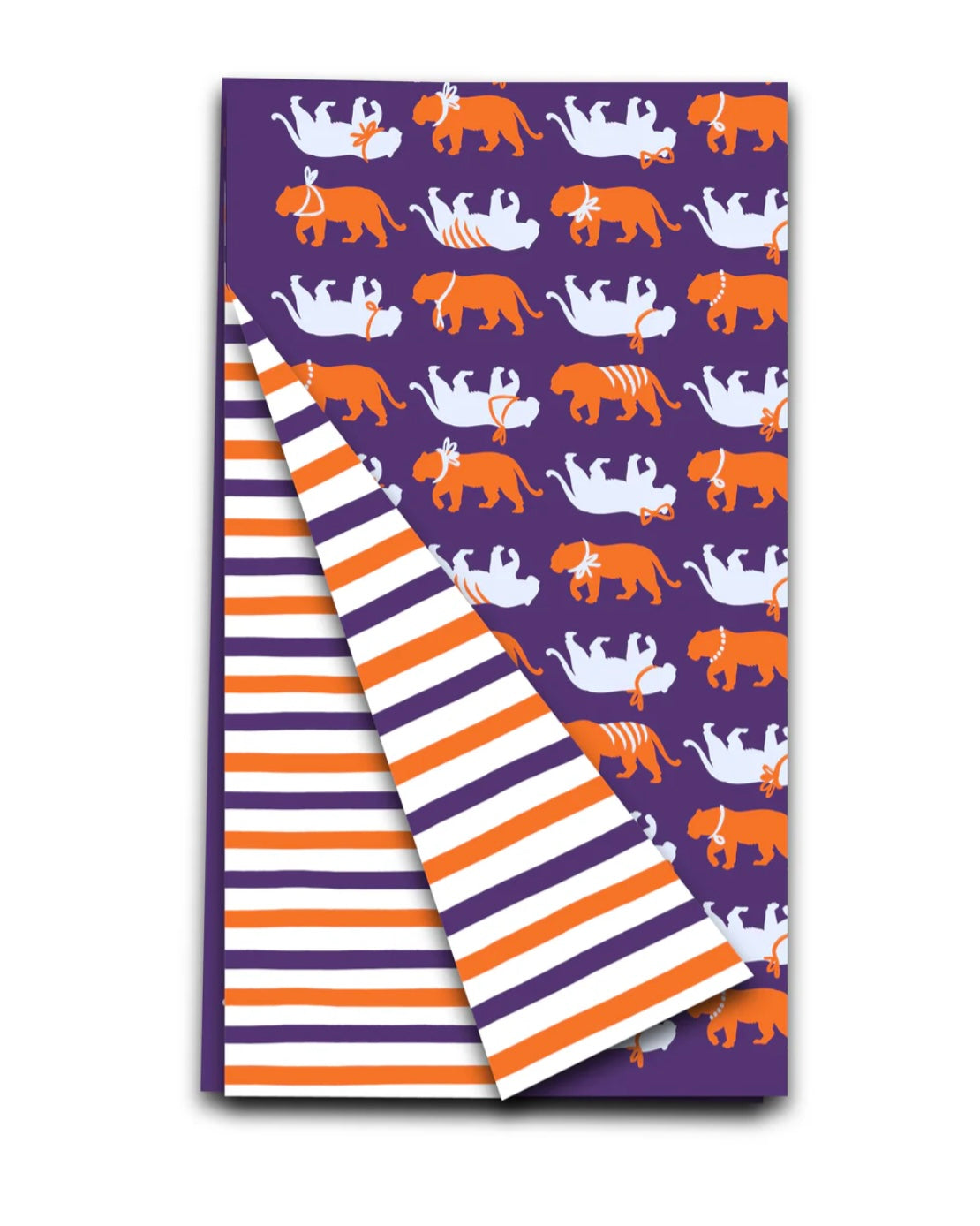 Bring playful Tiger spirit to your kitchen with this double-sided tea towel. One side features a bold purple background with rows of orange and white tigers sporting bow ties, bandanas, and pearls, while the reverse side shows classic orange, purple, and white stripes. Perfect for Clemson game days, tailgate prep, or gifting to your favorite Tiger fan, it’s a fun and functional way to show your school pride.